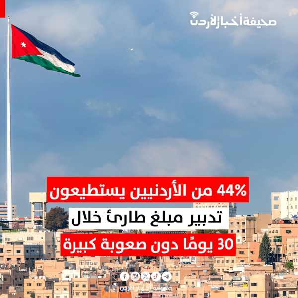 44% من الأردنيين يستطيعون تدبير مبلغ طارئ خلال 30 يومًا دون صعوبة كبيرة