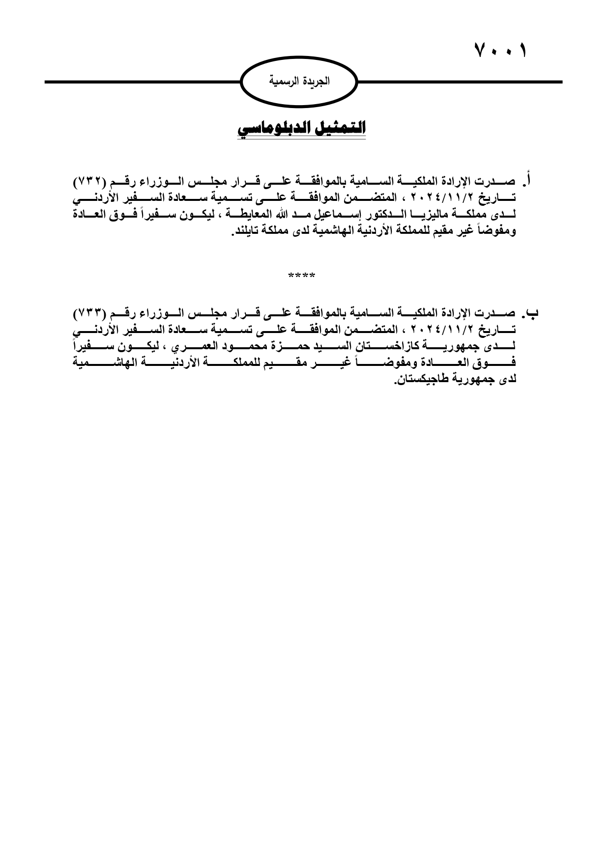 كما صدرت الإرادة الملكية السامية بالموافقة على قرار مجلس الوزراء المتضمن الموافقة على تسمية السفير الأردني لدى كازاخستان حمزة محمود العمري ليكون سفيرا فوق العادة ومفوضا غير مقيم للمملكة الأردنية الهاشمية لدى طاجيكستان.