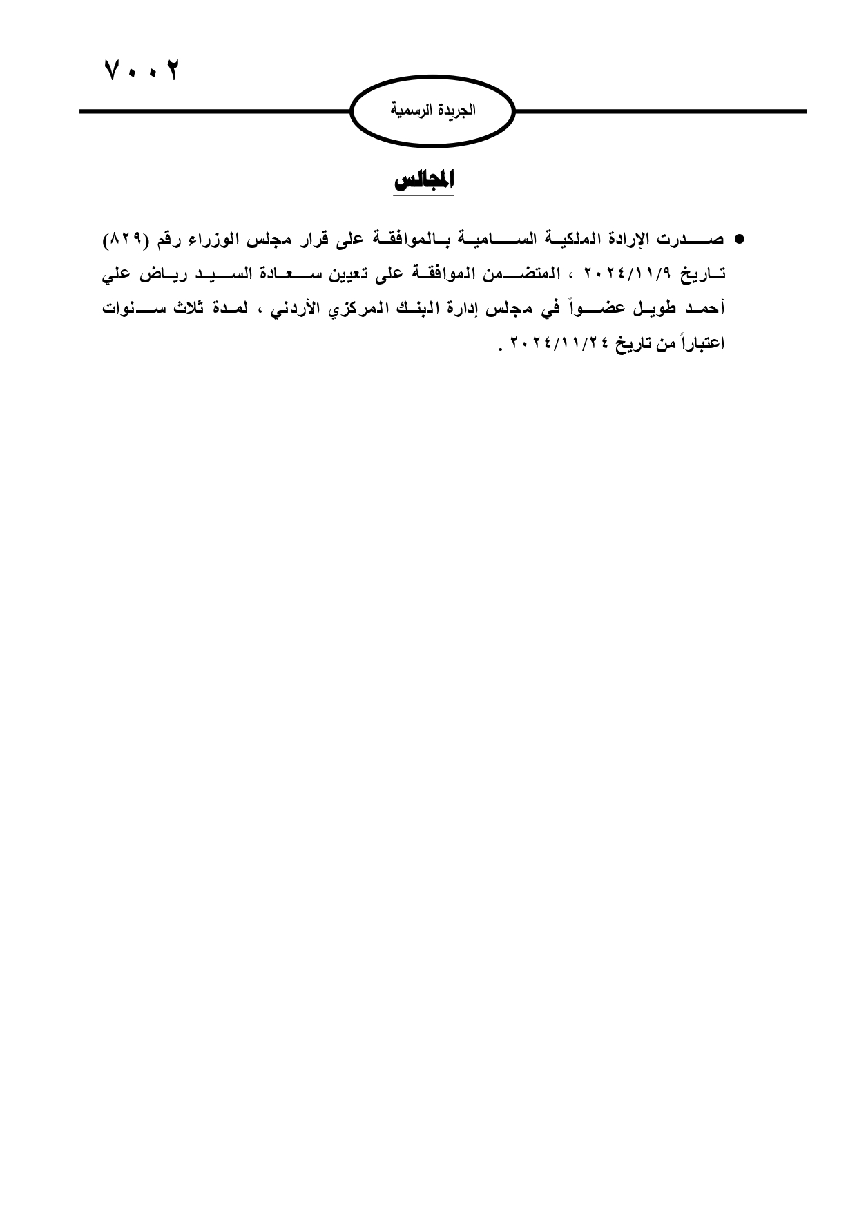 وصدرت الإرادة الملكية السامية بالموافقة على قرار مجلس الوزراء المتضمن الموافقة على تعيين رياض علي أحمد الطويل عضوا في مجلس إدارة البنك المركزي الأردني لمدة ثلاث سنوات اعتبارا من تاريخ 14/11/2024.
