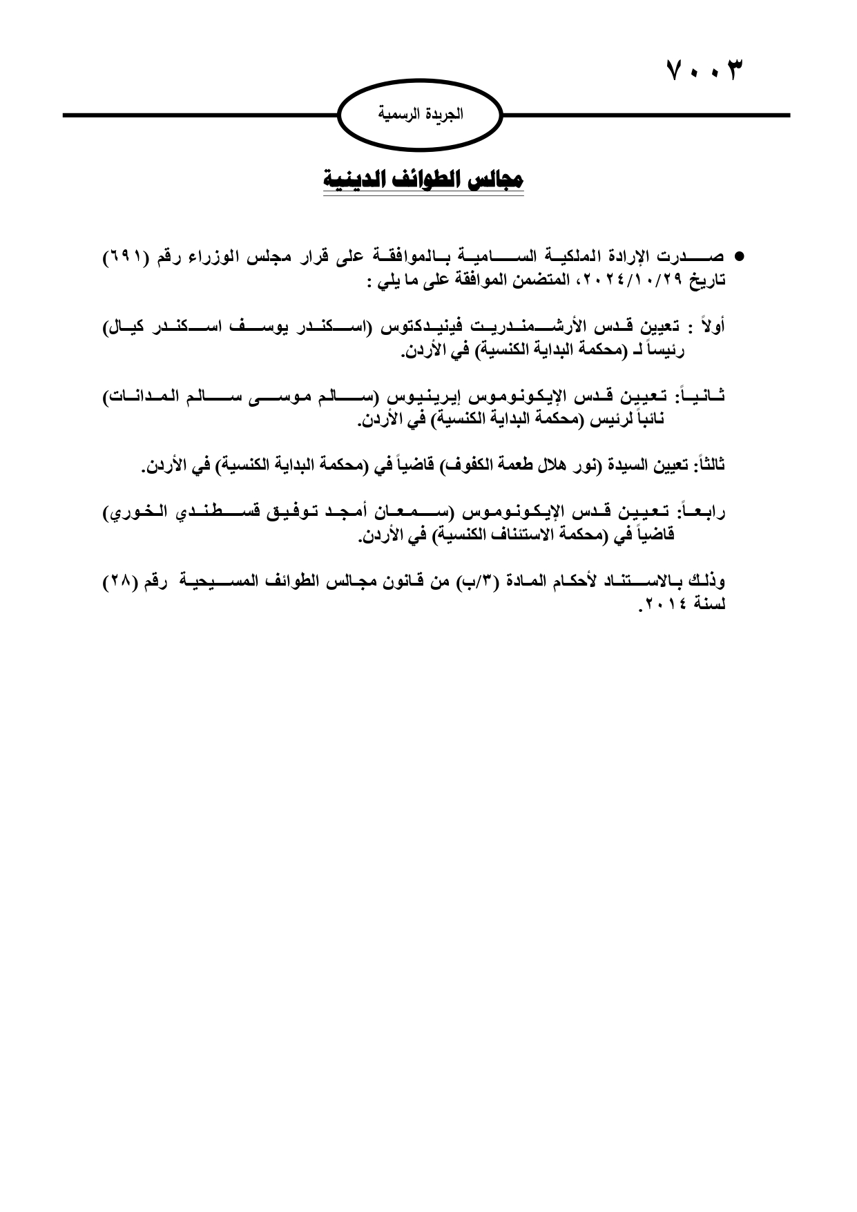 كما صدرت الإرادة الملكية السامية بالموافقة على قرار المجلس القضائي المتضمن الموافقة على تعيين القاضي ناصر خليف علي التل رئيسا للمحكمة الإدارية العليا اعتبارا من تاريخ 10/11/2024.