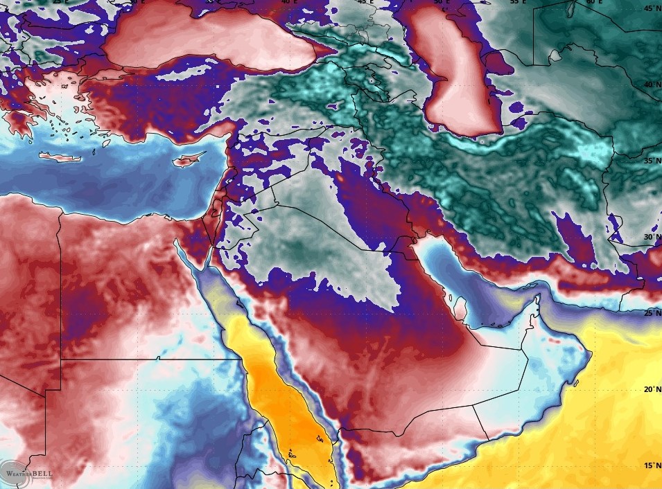 قال المركز العربي للمناخ إنه من المتوقع أن يتأثر الاردن وفلسطين وسوريا ولبنان والعراق والسعودية والكويت بموجة باردة جافة سيبيرية اعتباراً من يوم السبت المقبل الموافق 14-12-2024 .