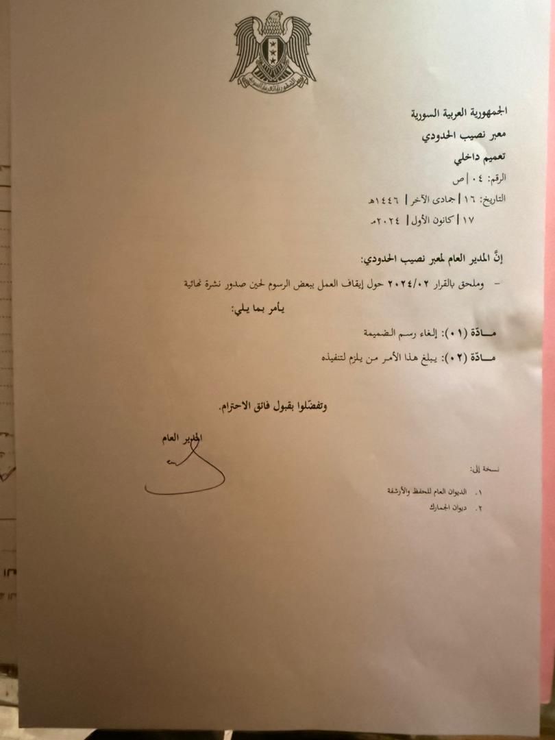 وأوضح الجغبير أن السلطات السورية أصدرت قرارات جديدة تتضمن إلغاء جميع أنواع الرسوم والطوابع التي كانت تُدفع سابقًا، مما يُسهّل حركة البضائع ويُعزز التعاون التجاري بين البلدين.