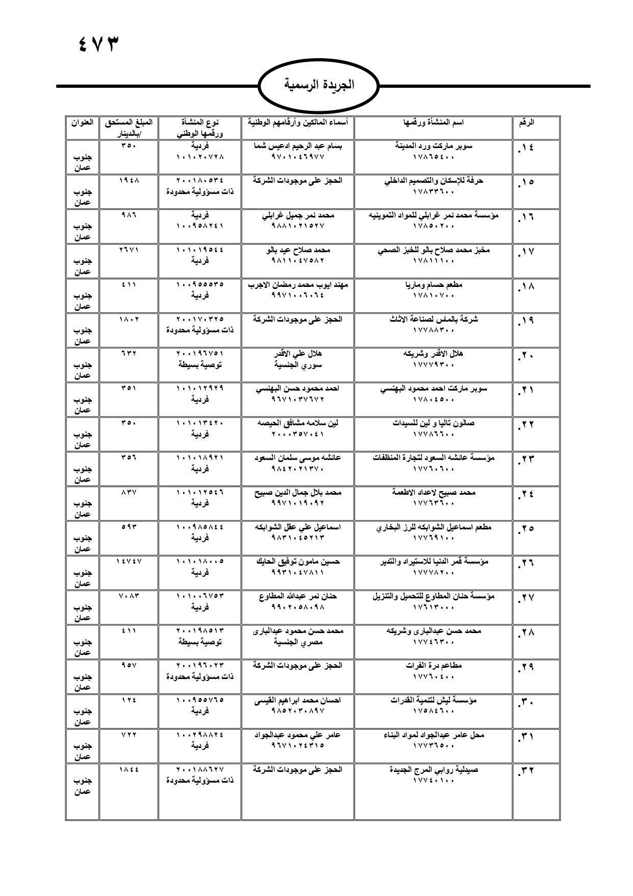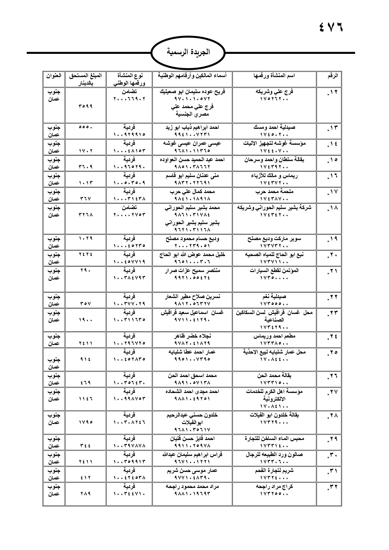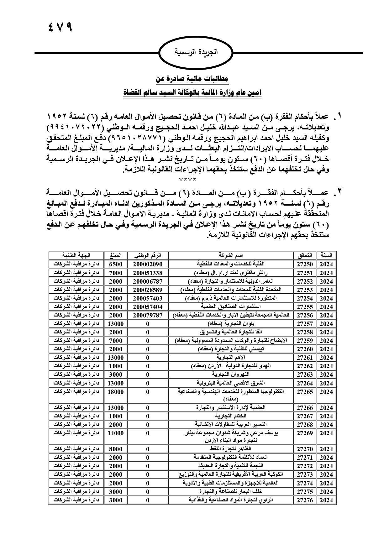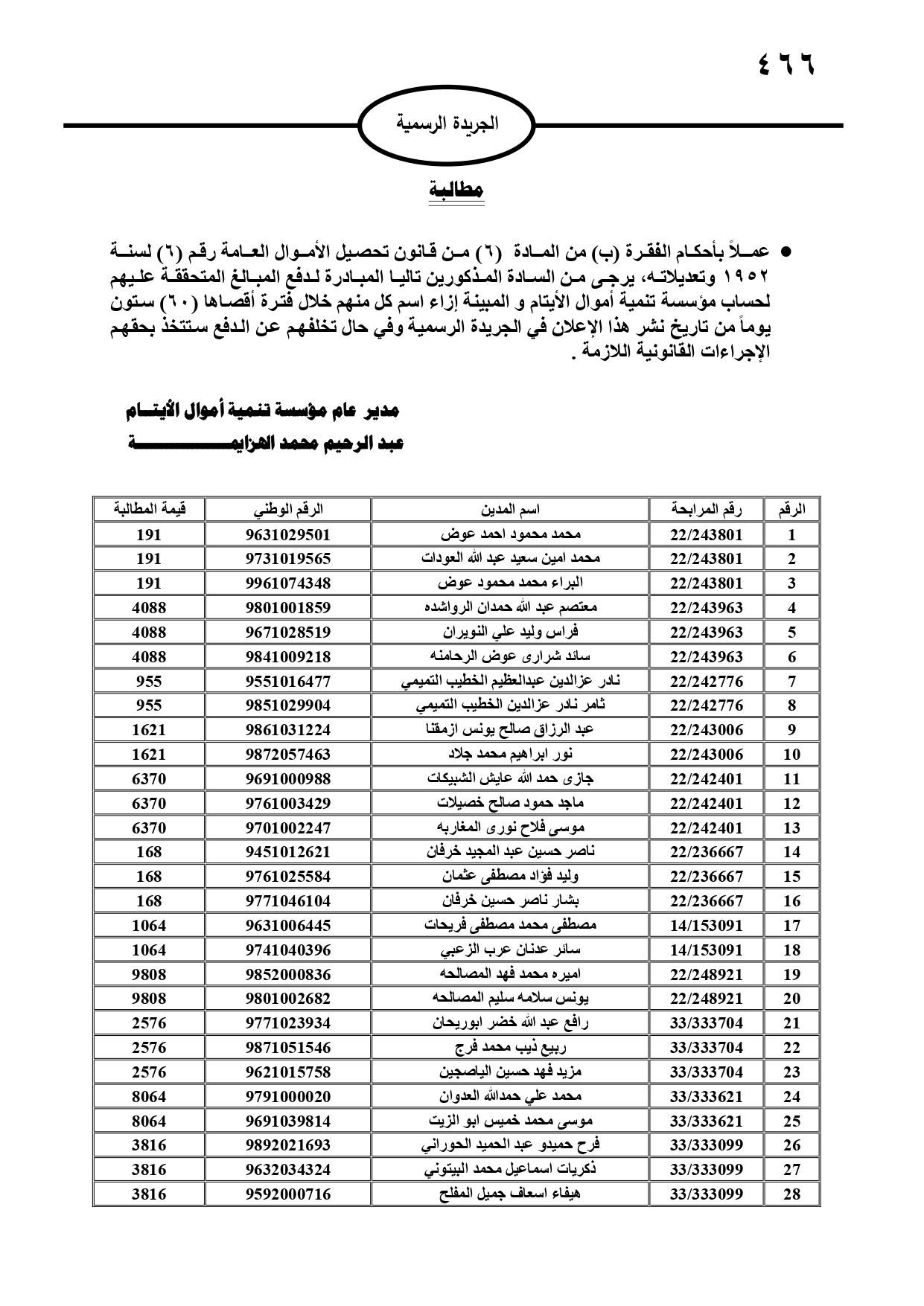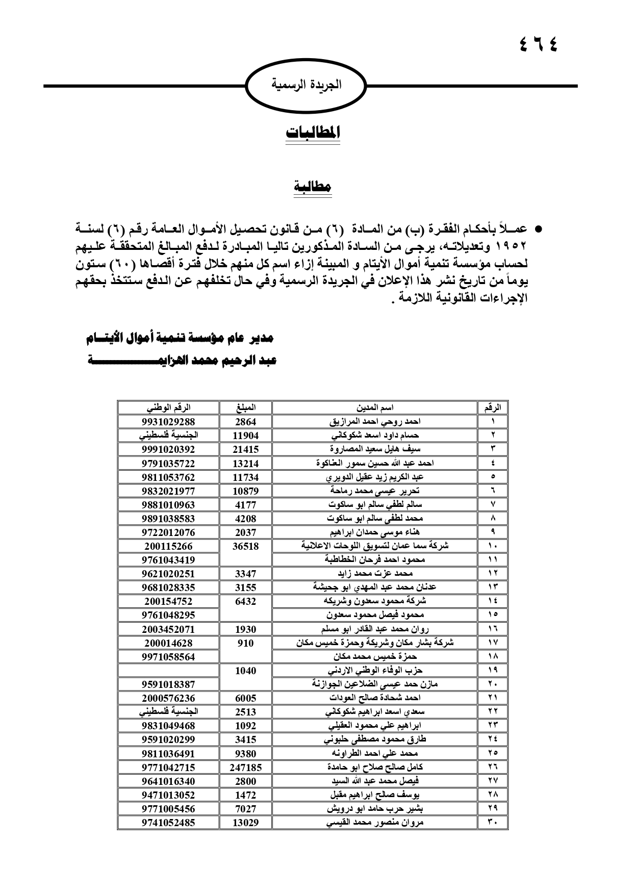 صدر في الجريدة الرسمية، الثلاثاء، مطالبات مالية بحق مدانين لصالح تنمية أموال الأيتام، ومؤسسة تنمية أموال الأيتام، ودائرة الجمارك، والمؤسسة العامة للضمان الاجتماعي، ووزارة المالية، وفي حال عدم تسوية أوضاعهم سيتم اتخاذ الإجراءات القانونية بحقهم