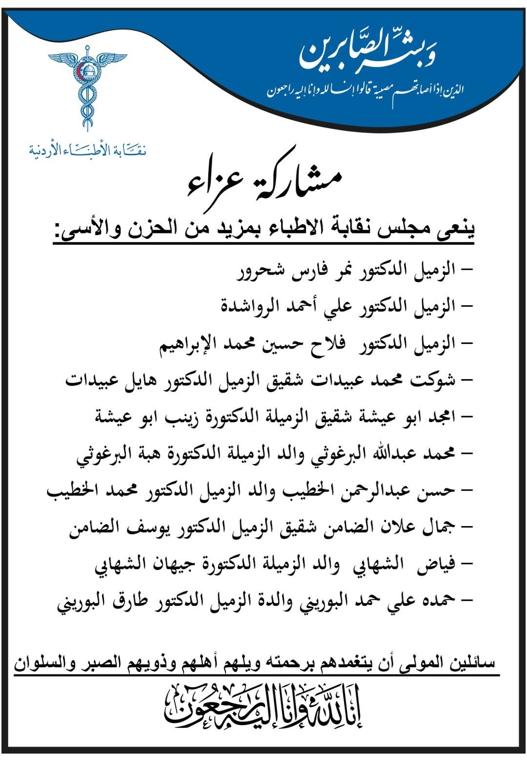 وتقدم مجلس النقابة بخالص التعازي والمواساة لعائلات الفقيدين، سائلاً المولى عز وجل أن يتغمدهم بواسع رحمته وأن يلهم ذويهم الصبر والسلوان.