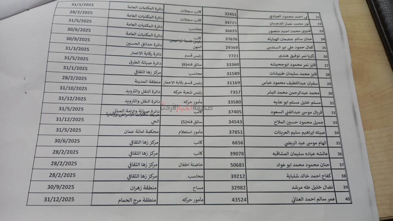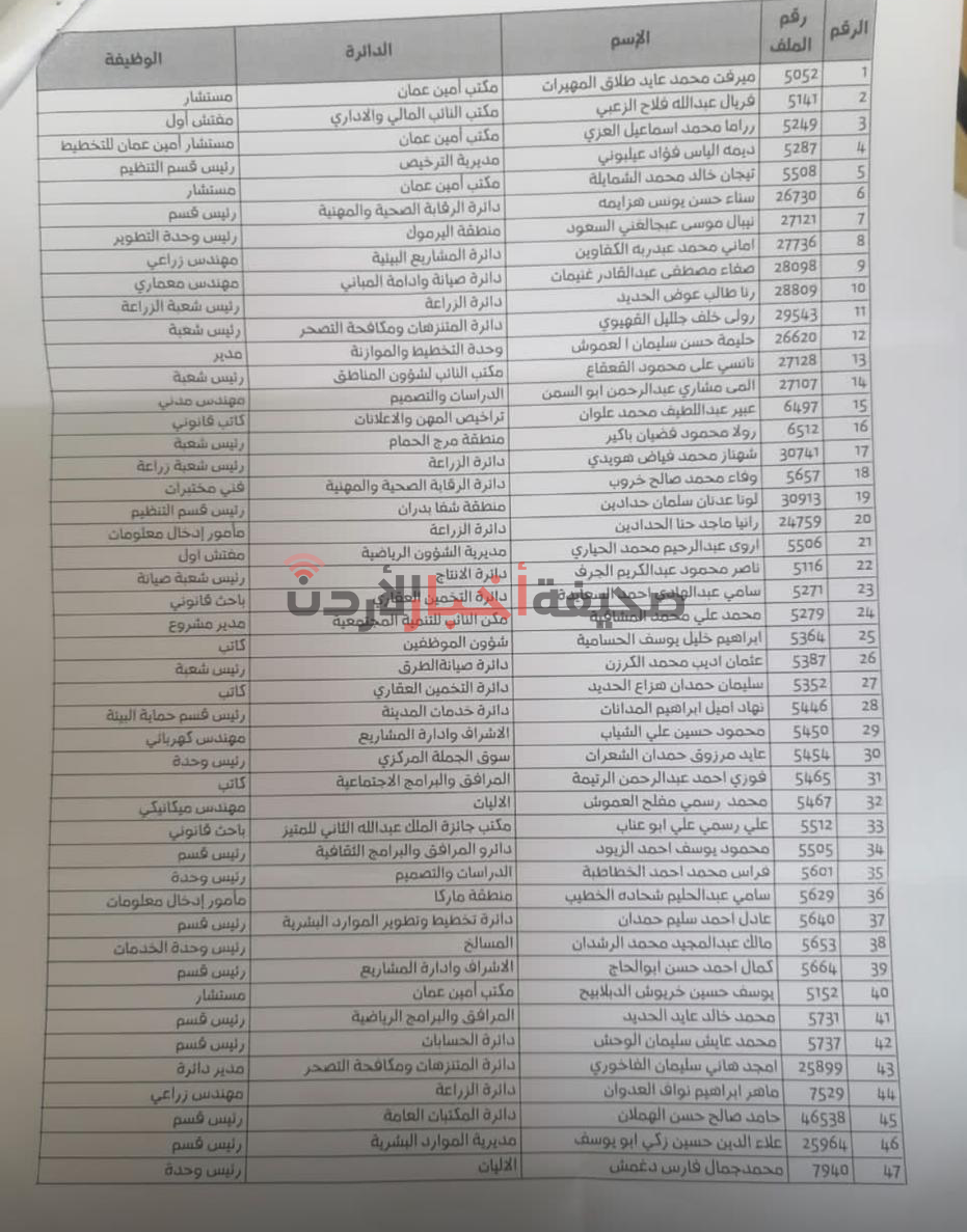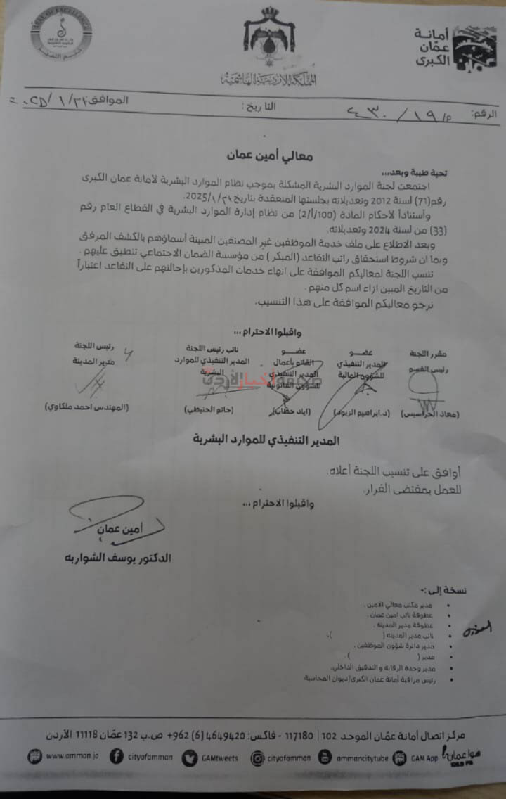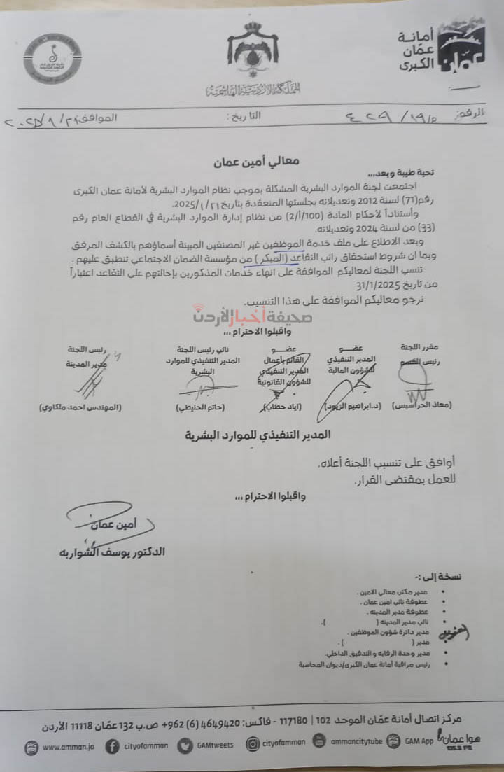 قرر مجلس أمانة عمان الكبرى، خلال جلسته التي عقدها اليوم الثلاثاء، إحالة 620 موظفًا إلى التقاعد، وشملت القائمة رؤساء أقسام، ومديرين، وموظفين مصنفين في درجات عليا.