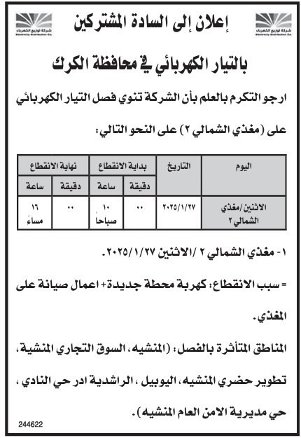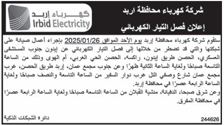 أعلنت شركات الكهرباء عن اضطرارها إلى إجراء فصل مبرمج للتيار الكهربائي في عدد من المناطق بمحافظات معان، ولواء البتراء، والكرك، والمفرق، وإربد، والعقبة، وذلك لغايات تنفيذ أعمال صيانة دورية خلال الأسبوع المقبل.