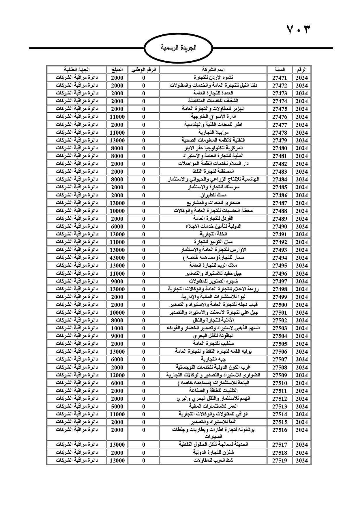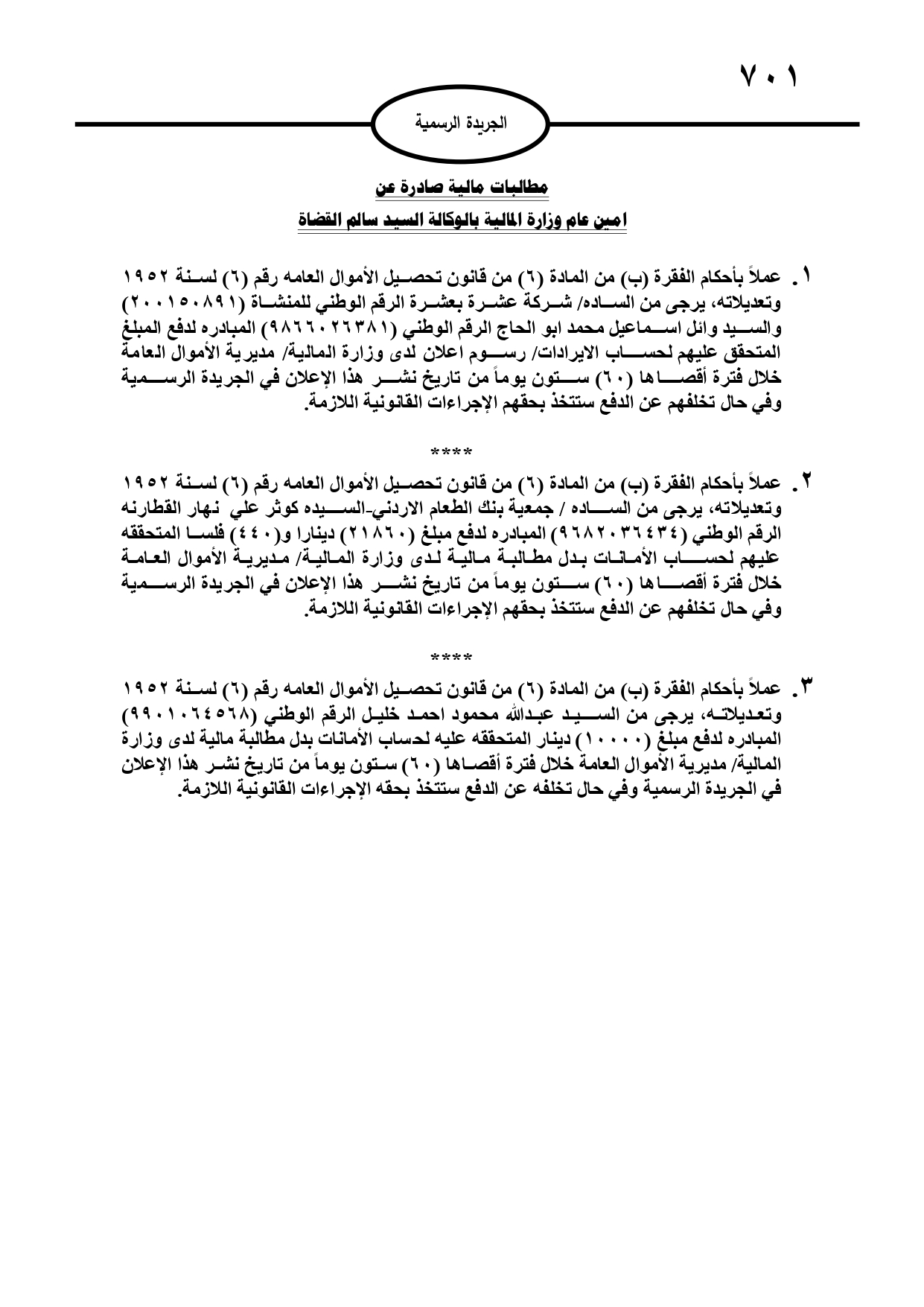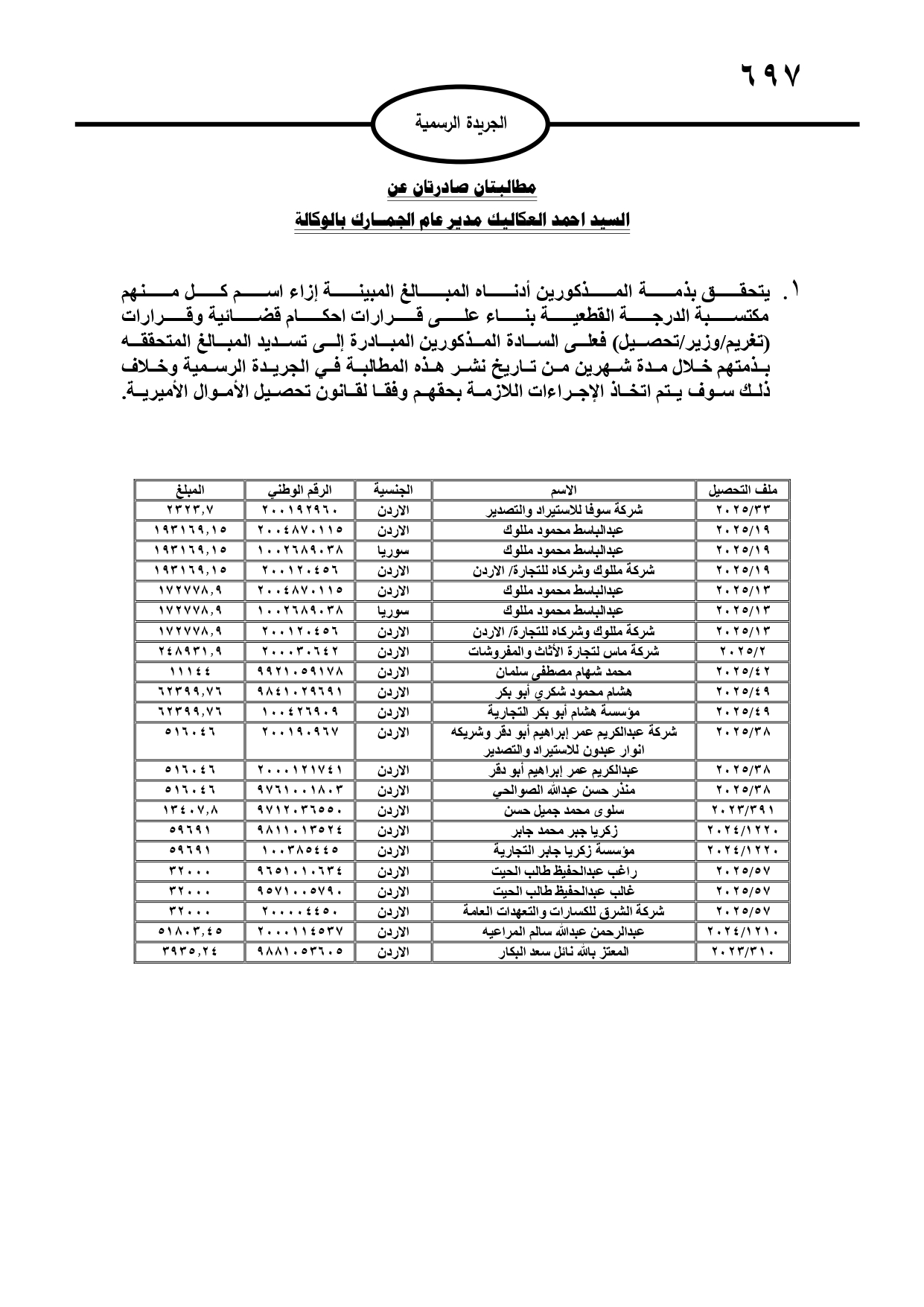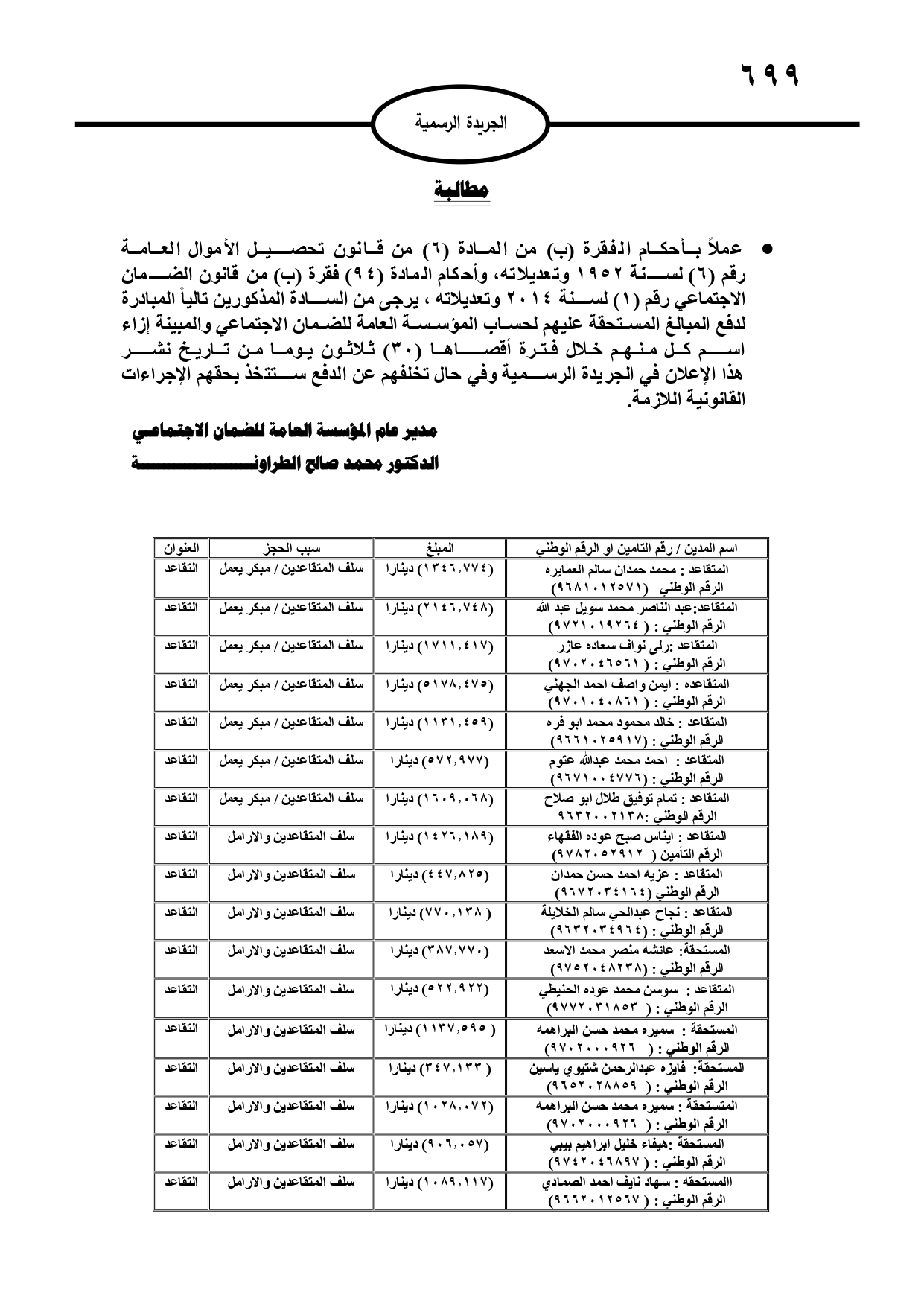 صدر في عدد الجريدة الرسمية، الأحد، مطالبات مالية بحق مدانين لصالح عدة جهات رسمية، وفي حال عدم تسوية أوضاعهم سيتم اتخاذ الإجراءات القانونية بحقهم.