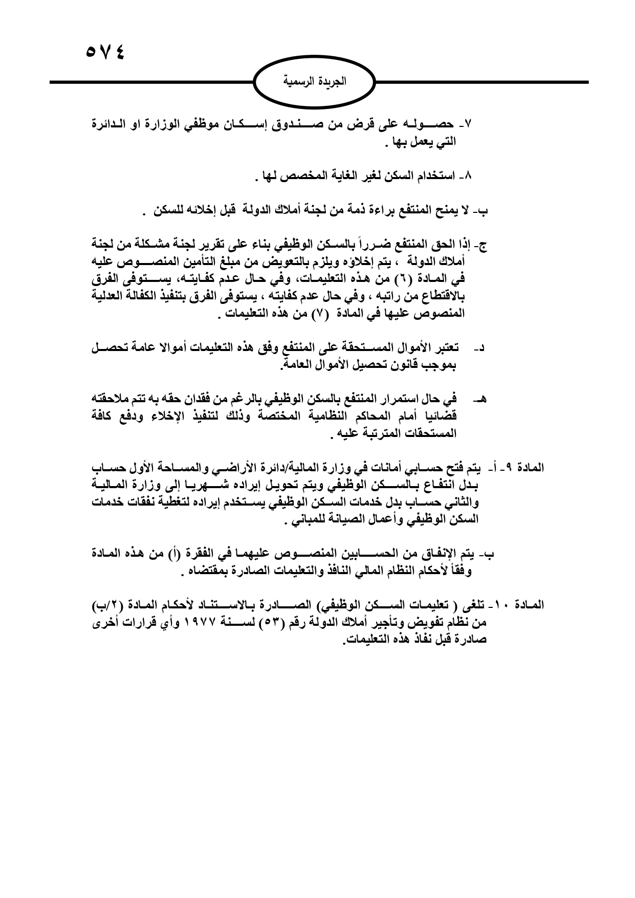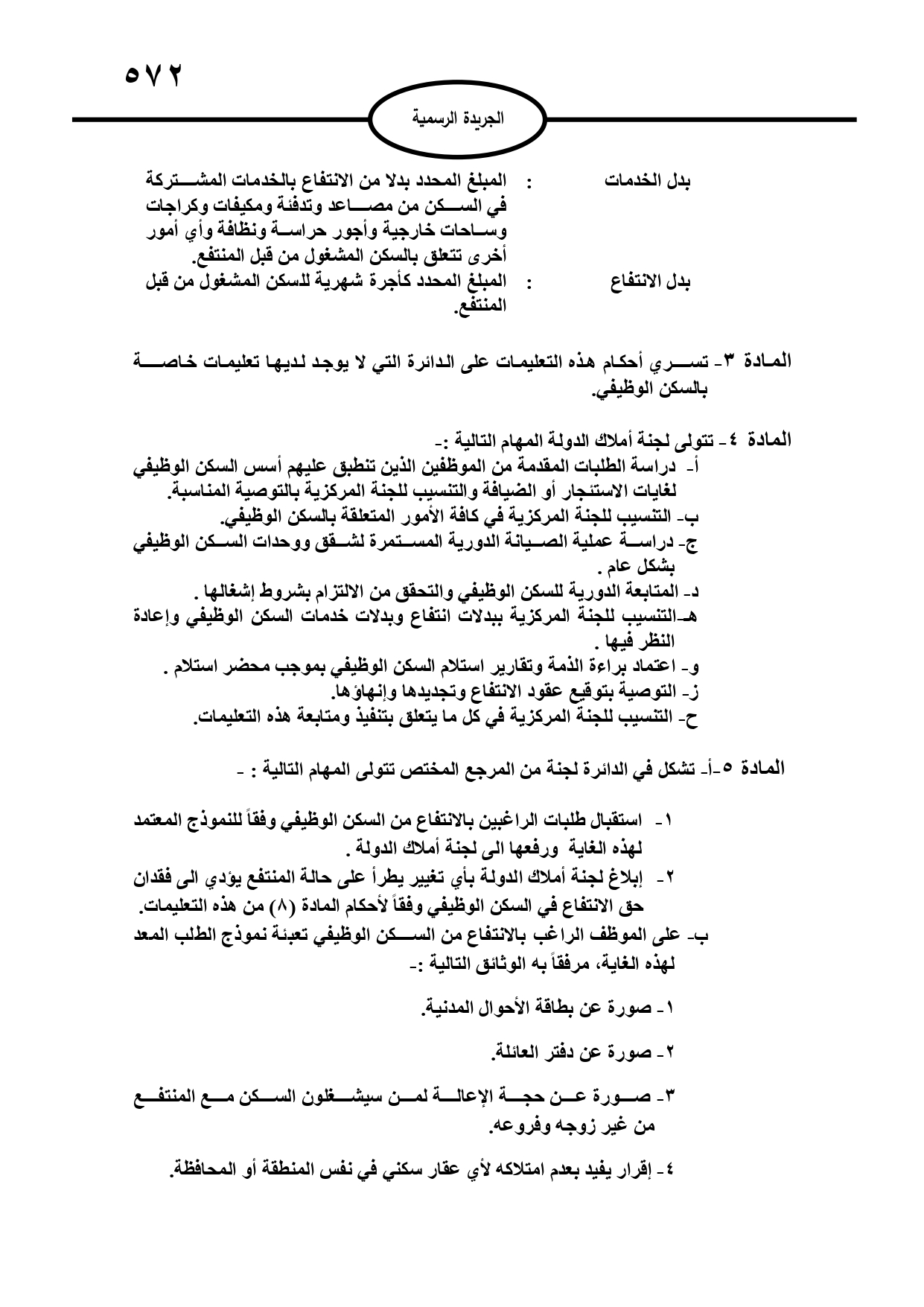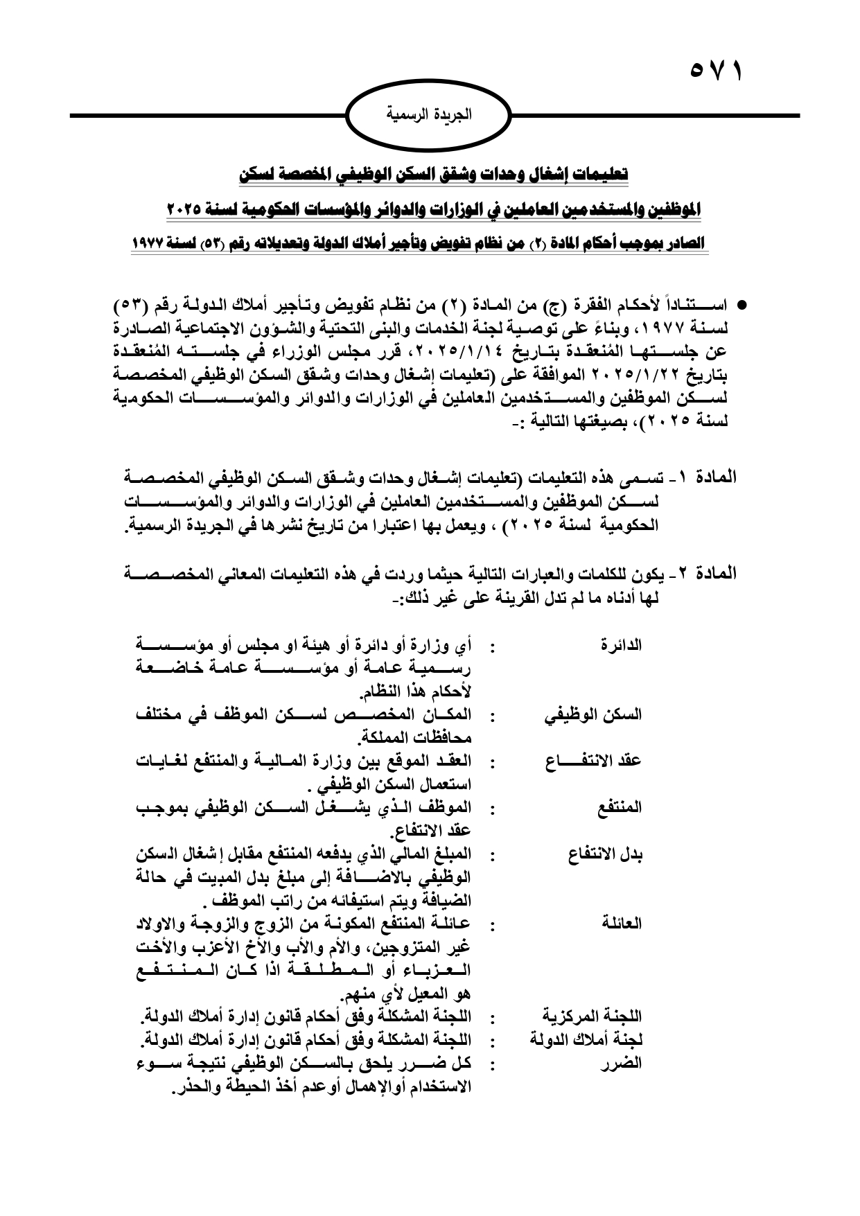نشرت الحكومة في عدد الجريدة الرسمية، الأحد، تعليمات إشغال وحدات وشقق السكن الوظيفي المخصصة لسكن الموظفين والمستخدمين العاملين في الوزارات والدوائر والمؤسسات الحكومية لسنة 2025