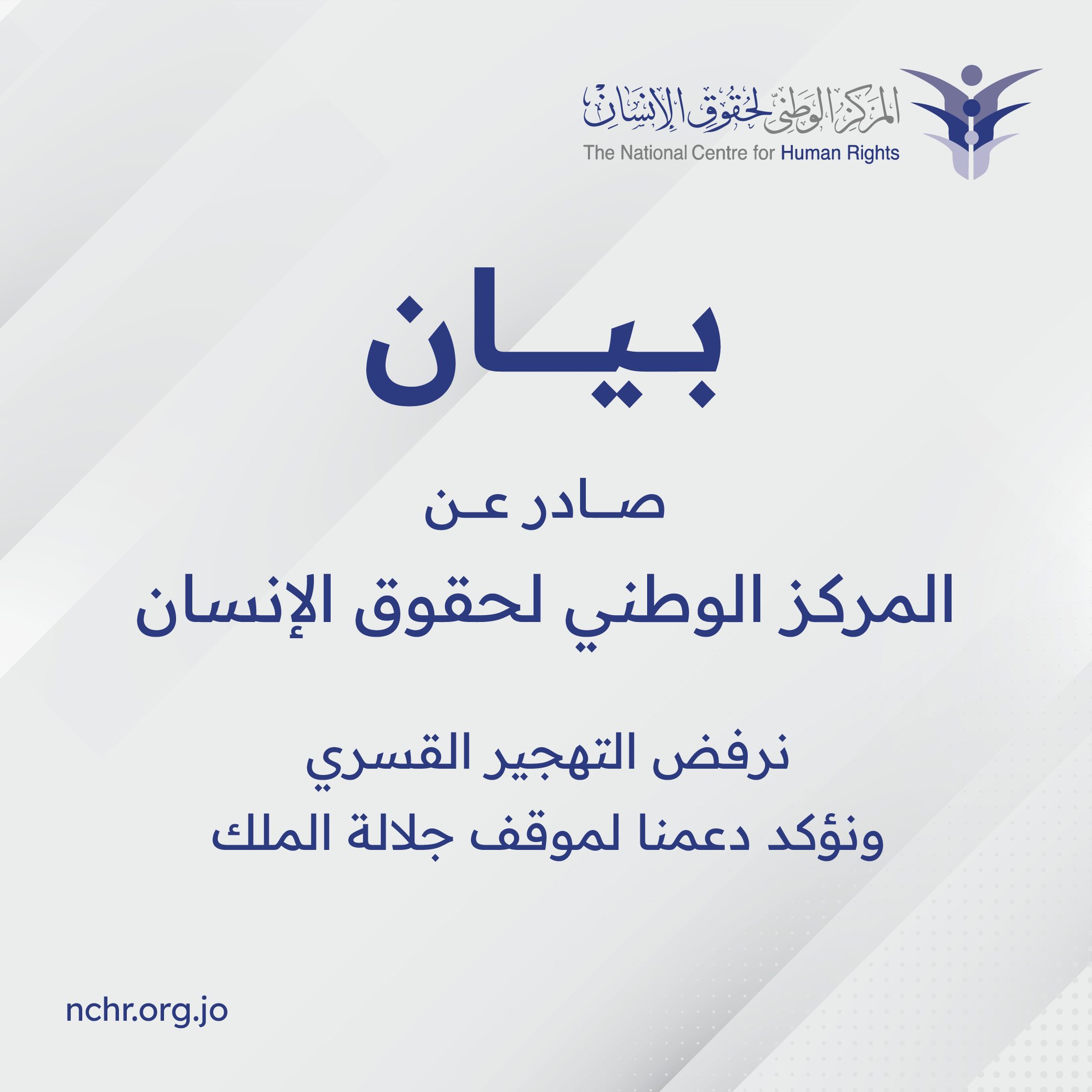 يؤكد المركز الوطني لحقوق الإنسان في الأردن دعمه الكامل لموقف جلالة الملك عبد الله الثاني الرافض بشكل قاطع لأي محاولات لتهجير الفلسطينيين من قطاع غزة أو أي منطقة أخرى، باعتبار ذلك انتهاكًا صارخًا للقانون الدولي الإنساني وحقوق الإنسان.
