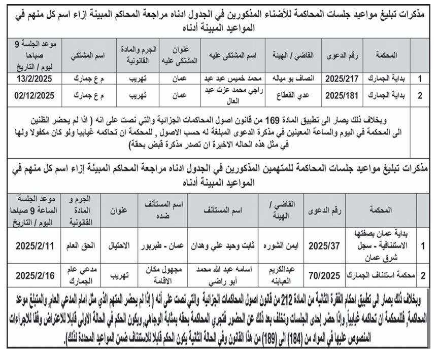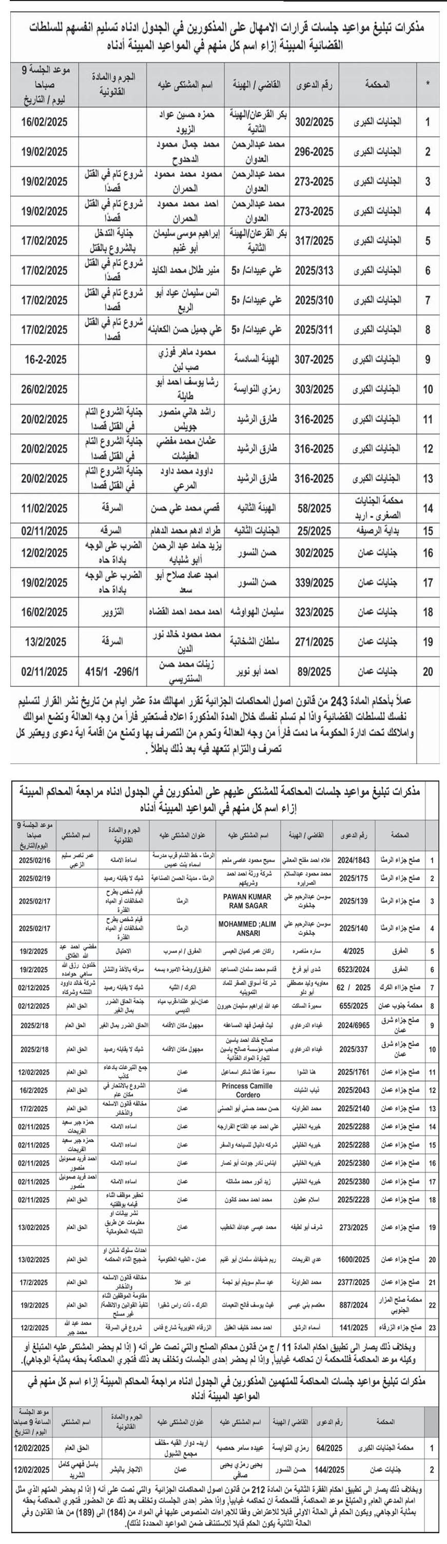 وطلبت المذكرات من المذكورين في الجداول أدناه مراجعة المحاكم المبينة إزاء اسم كل منهم في المواعيد المبينة أدناه.