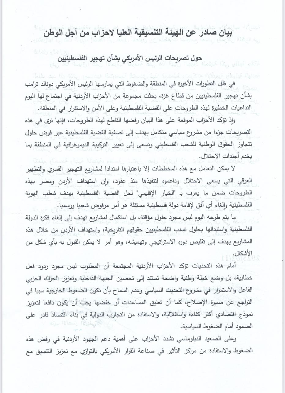 أعلنت الهيئة التنسيقية العليا لأحزاب من أجل الوطن والتي تشكلت من ٩ أحزاب أردنيه بداية هذا العام إنطلاق أعمالها في إجتماعها الذي عقد مساء هذا اليوم الثلاثاء .حيث ترافق الإعلان عن الهيئة مع تنفيذ وقفة لامناء عامين الأحزاب التي تشكل هذه الهيئة لدعم الموقف الوطني الرافض لمشروع التهجير والاعلان عن الوقوف صفا واحدا خلف قيادتنا الهاشميه وإصدار بيان بهذا الخصوص. حيث تزامن ذلك مع زيارة جلالة الملك للولايات المتحدة وإجتماعه مع الرئيس الأمريكي ترامب الله كما تم الإتفاق على وضع خطة قانونية لمواجهة قضية التهجير.ومن الجدير بالذكر ان الهيئة التنسيقة العليا لأحزاب من أجل الوطن تشكلت على فكرة العمل الحزبي التشاركي للوصول لتحالفات دائمة بين أعضاء الهيئة.كما سيكون هناك خطة عمل مشتركة لأعضاء الهيئة تعالج عدد من التحديات التي تواجه العمل الحزبي وتخلق فرص لشراكة فاعلة ومستدامه.