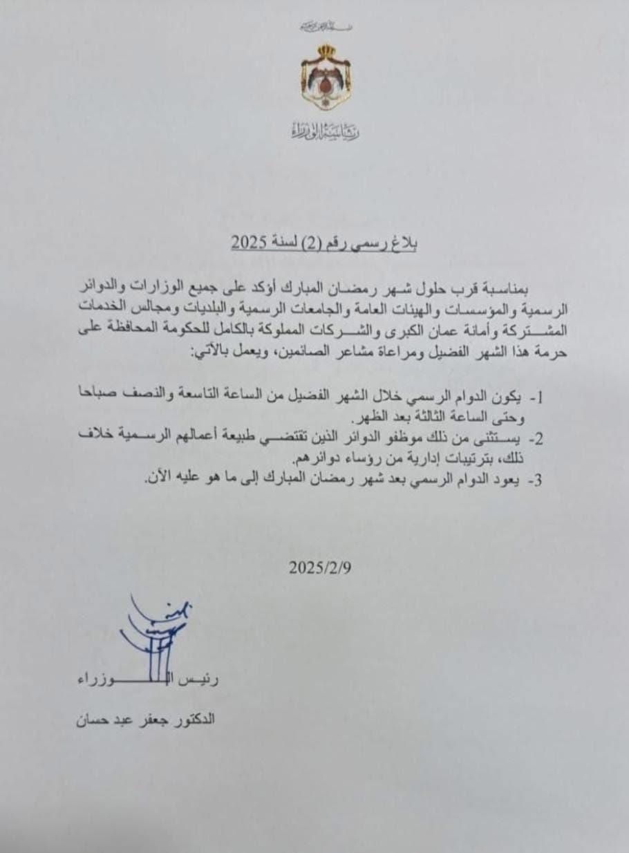 بمناسبة قرب حلول شهر رمضان المبارك، أكد رئيس الوزراء جعفر حسان على جميع الوزارات والدوائر الرسمية والمؤسسات والهيئات العامة والجامعات الرسمية والبلديات ومجالس الخدمات المشتركة وأمانة عمان الكبرى والشركات المملوكة بالكامل للحكومة، المحافظة على حرمة هذا الشهر الفضيل ومراعاة مشاعر الصائمين، والعمل بالآتي: