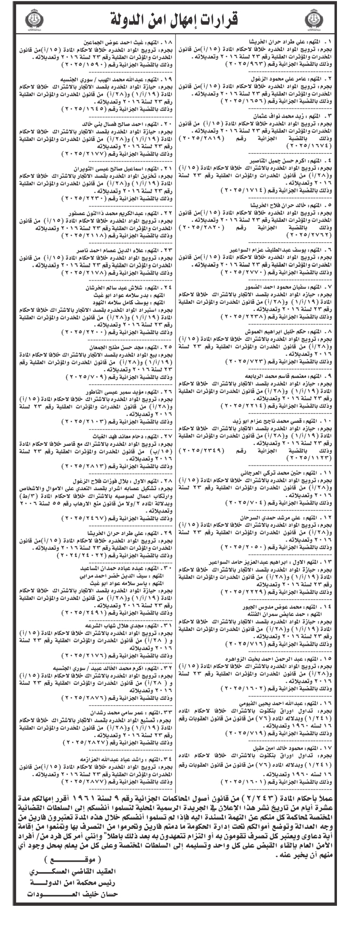 وأكد العقيد القاضي العسكري، رئيس محكمة أمن الدولة، حسان خليف العودات، أنه في حال عدم امتثال المتهمين خلال المهلة المحددة، سيتم اعتبارهم فارين من وجه العدالة، وستوضع أموالهم تحت إدارة الحكومة ما داموا متوارين عن الأنظار، كما سيُحرمون من التصرف بها أو إقامة أي دعاوى قانونية، ويُعد أي تصرف أو التزام قانوني يقومون به لاحقًا باطلًا.