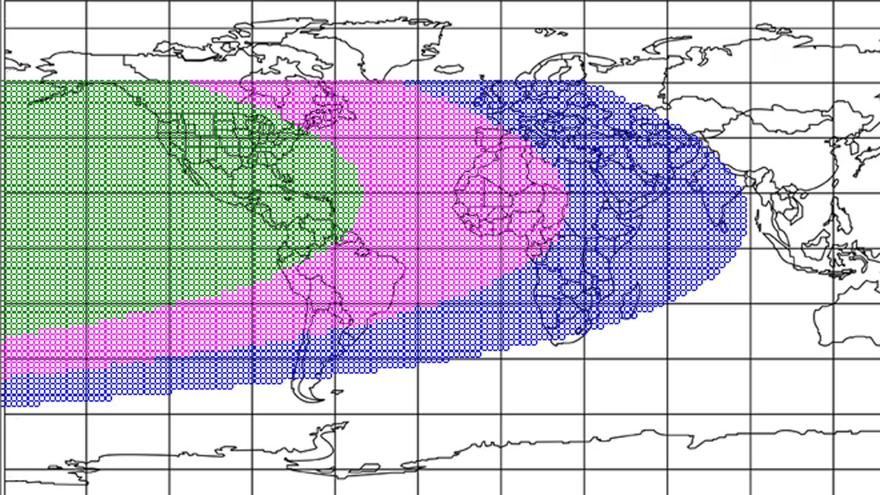 اللون الأحمر: رؤية الهلال مستحيلة، إما بسبب غروب القمر قبل غروب الشمس أو بسبب حدوث الاقتران الفلكي بعد غروب الشمس.