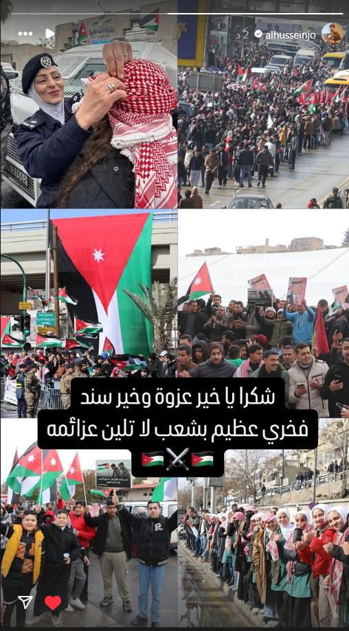 شكر سمو الأمير الحسين بن عبدالله الثاني، ولي العهد، الأردنيين بعد توافدهم من مختلف محافظات المملكة، إلى عمّان، للمشاركة في الاستقبال الشعبي الحاشد لجلالة للملك عبدالله الثاني وسمو الأمير الحسين بن عبدالله الثاني ولي العهد، بعد عودتهما من زيارة العمل في الولايات المتحدة الأميركية.