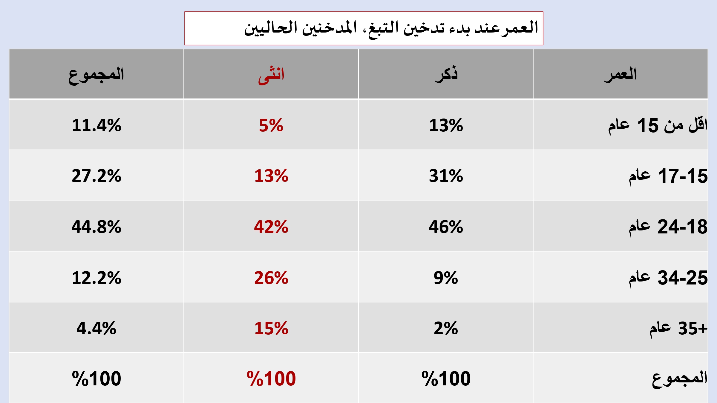 🔹 النسبة التي بدأت التدخين قبل سن 18 عامًا: 38.6%