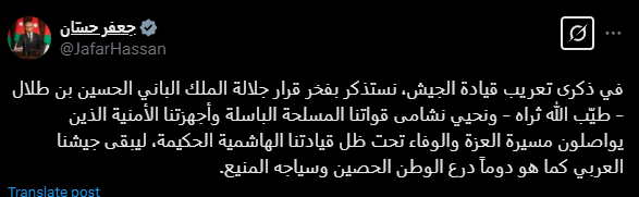 وحيا حسان عبر منصة "إكس" نشامى القوات المسلحة الباسلة قائلا: "نحيي نشامى قواتنا المسلحة الباسلة وأجهزتنا الأمنية الذين يواصلون مسيرة العزة والوفاء تحت ظل قيادتنا الهاشمية الحكيمة، ليبقى جيشنا العربي كما هو دوماً درع الوطن الحصين وسياجه المنيع. وأجهزتنا الأمنية الذين يواصلون مسيرة العزة والوفاء تحت ظل قيادتنا الهاشمية الحكيمة، ليبقى جيشنا العربي كما هو دوماً درع الوطن الحصين وسياجه المنيع".