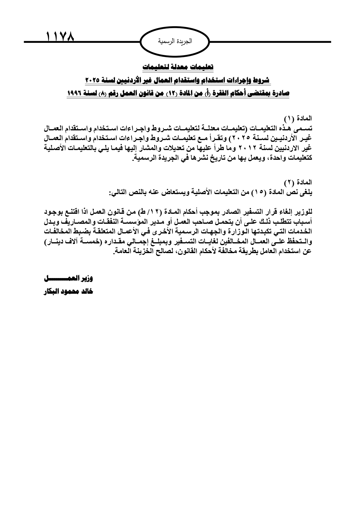 صدر في عدد الجريدة الرسمية اليوم الأحد، تعليمات معدلة لتعليمات شروط وإجراءات استخدام واستقدام العمال غير الأردنيين لسنة 2025.