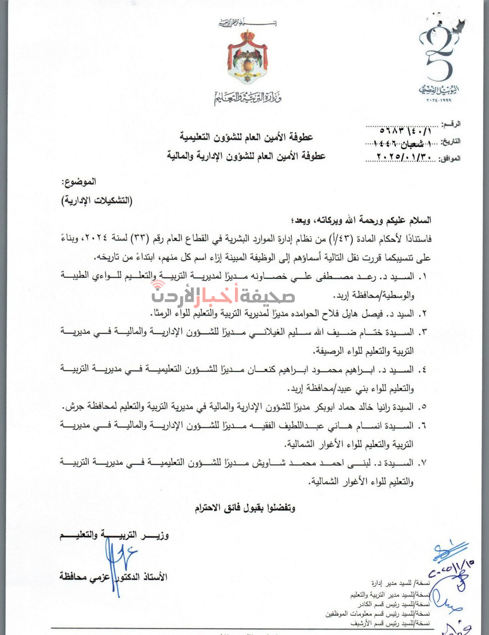 قرر وزير التربية والتعليم الدكتور عزمي محافظة، إجراء التشكيلات الإدارية التالية: