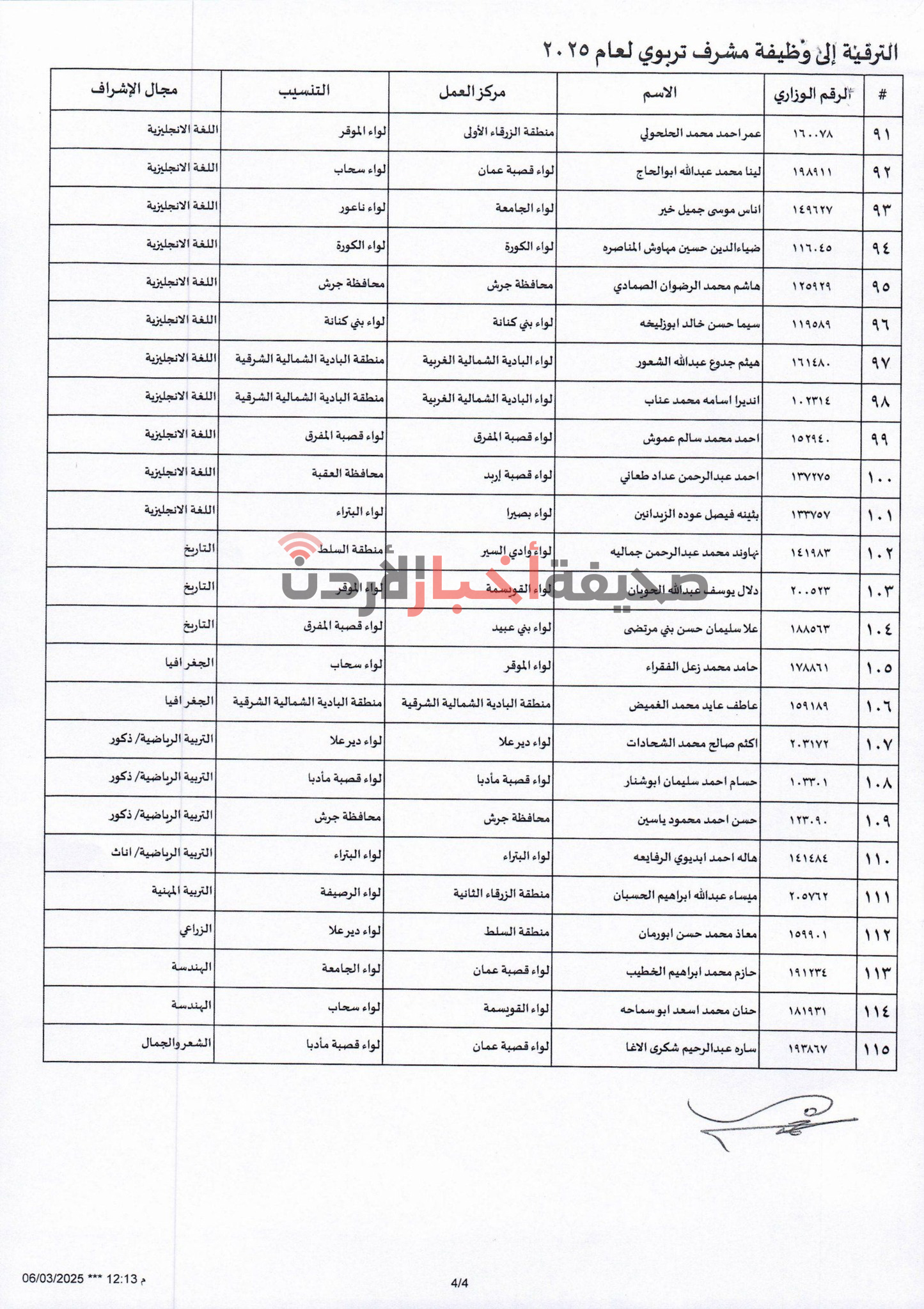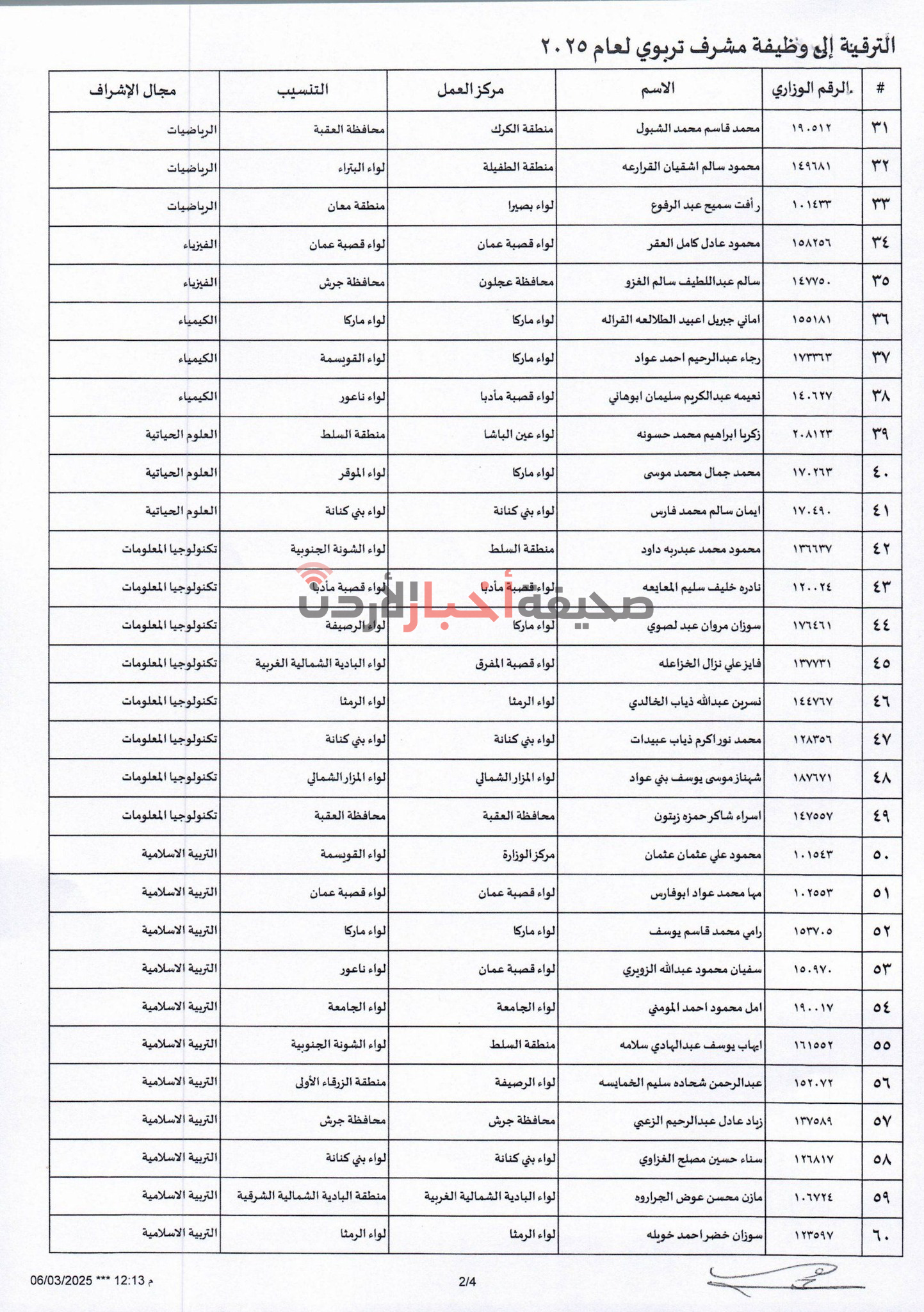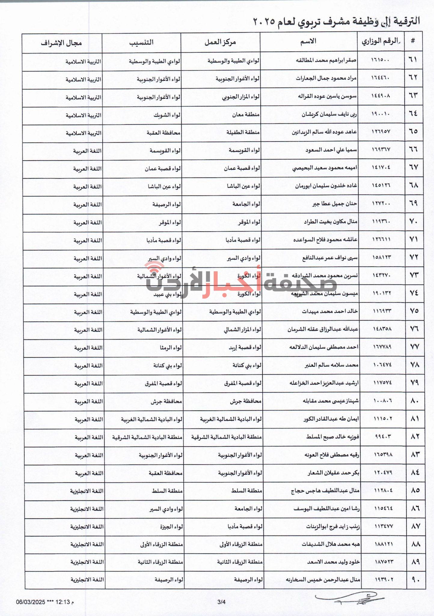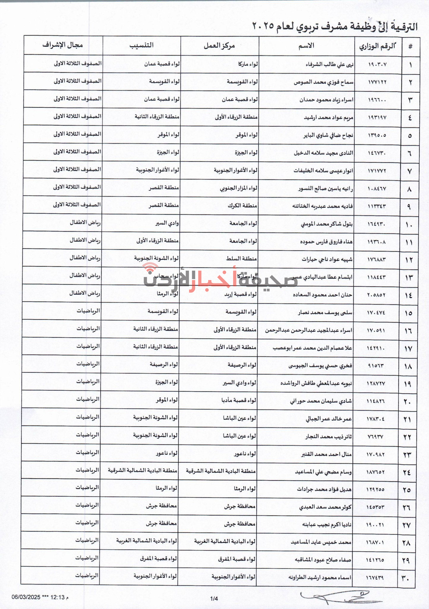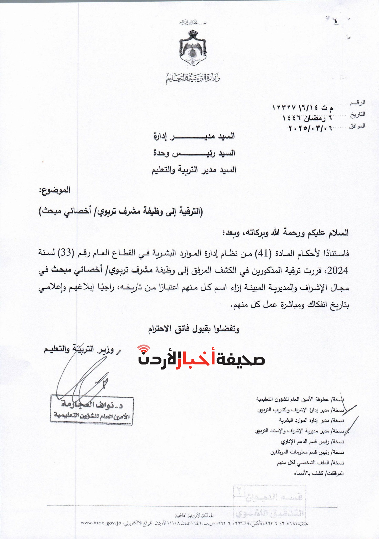 قرر وزير التربية والتعليم الدكتور عزمي محافظة ترقية عدد من الموظفين إلى وظيفة مشرف تربوي.