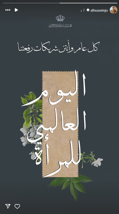 هنأ سمو الأمير الحسين بن عبدالله، ولي العهد، الأردنيات باليوم العالمي للمرأة، وقال: "كل عام وأنتن شريكات رفعتنا".