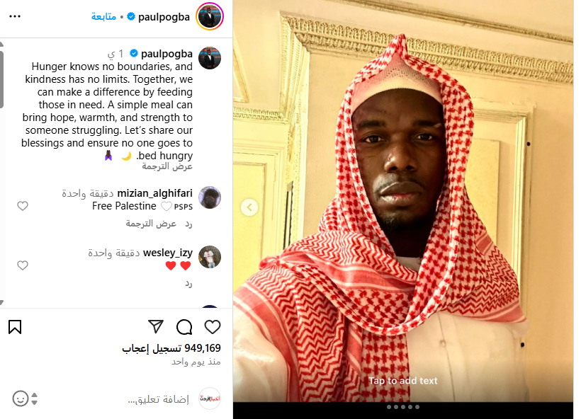 وعبر حسابه على موقع "إنستغرام"، كتب بوغبا: "الجوع لا يعرف حدودًا، ومعًا يمكننا إحداث فرق من خلال إطعام المحتاجين. وجبة بسيطة يمكن أن تجلب الأمل والدفء والقوة لمن يواجه صعوبات. لنشارك نعمنا ونضمن ألا ينام أحد جائعًا".