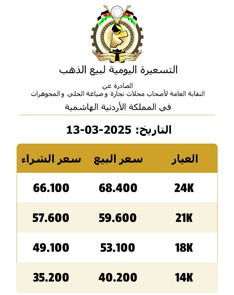 كما بلغ سعر بيع الغرام الواحد من الذهب عياري 24 و18 في محلات الصاغة 68.40 دينار و53.10 دينار على التوالي، في حين بلغ سعر بيع غرام الذهب عيار 14 حوالي 40.20 دينار.