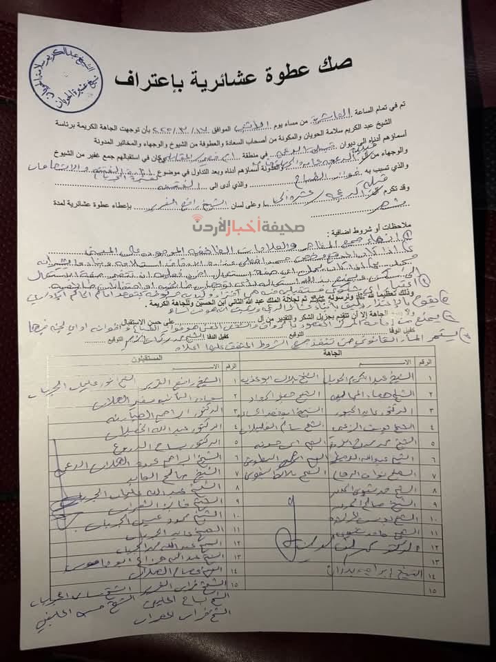 وجرى توقيع صك العطوة بالاعتراف، وسط حضور وجهاء العشائر وشخصيات اجتماعية، تأكيدًا على الالتزام ببنود الاتفاق وإنهاء الخلاف.