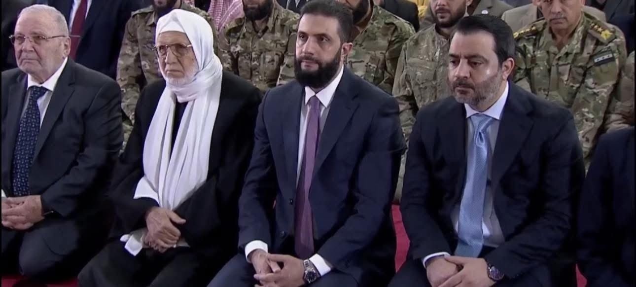 وظهر الشرع مع مجموعة من كبار المسؤوليين السوريين وبجانبه وزير الخارجية أسعد الشيباني ورئيس مجلس الإفتاء الشيخ أسامة الرفاعي وغيرهم من القادة العسكريين في وزارة الدفاع السورية وممثلين عن السلطة السورية ومواطنين سوريين.