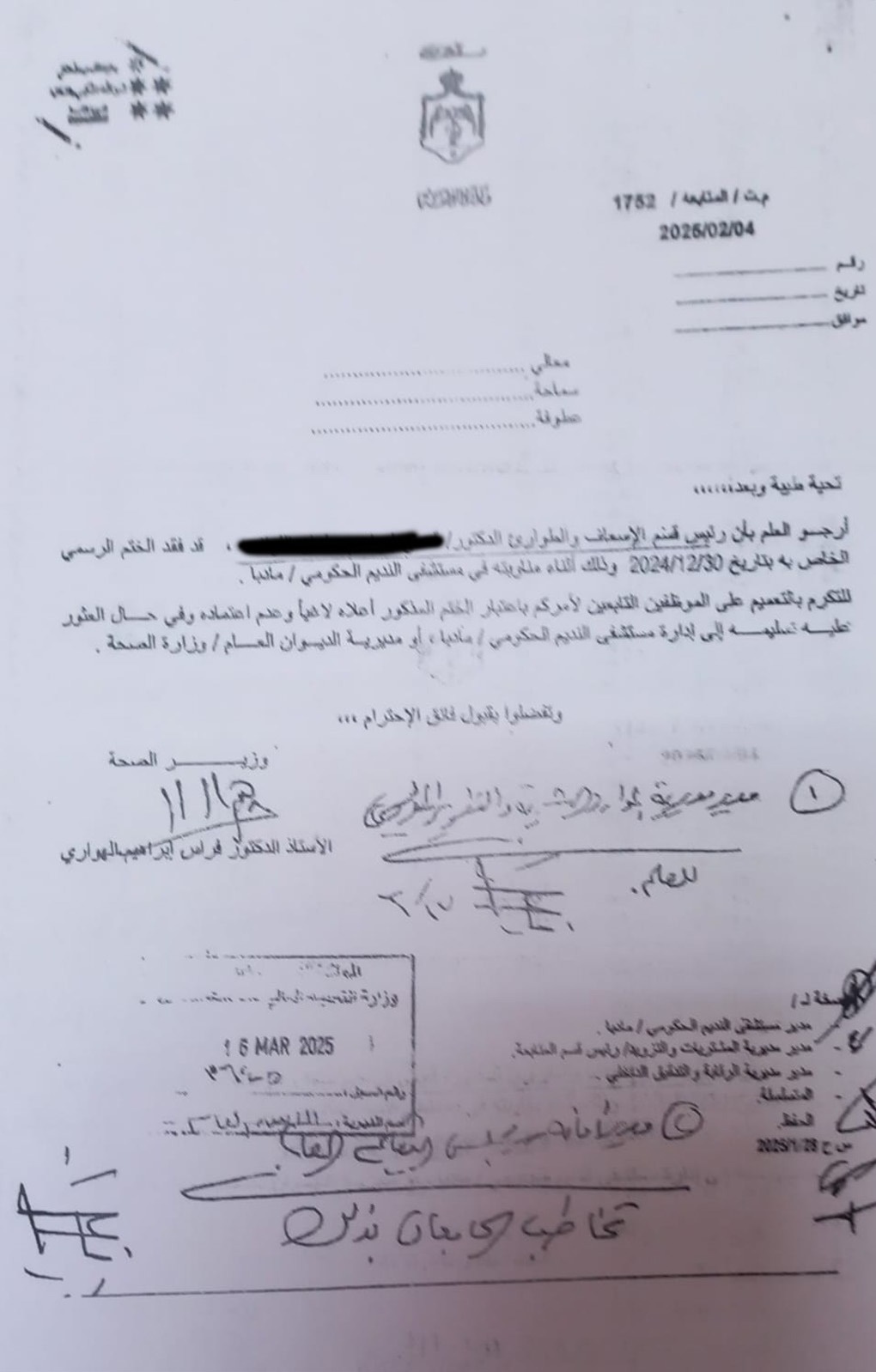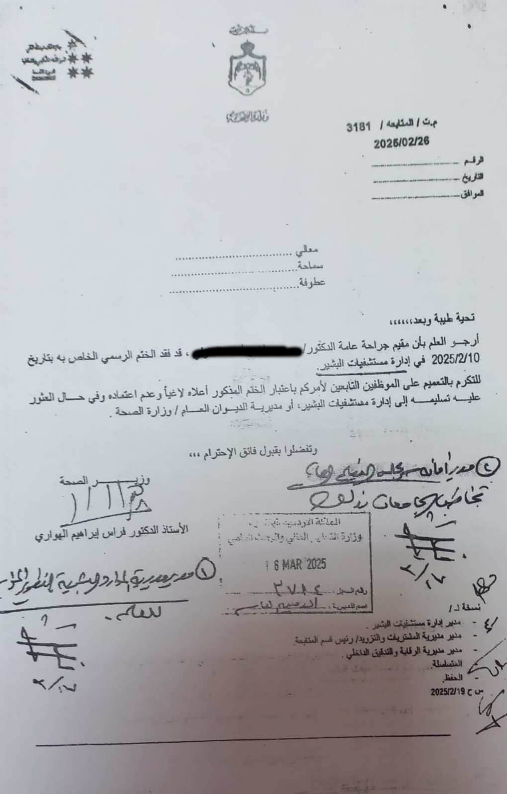 أصدر وزير الصحة، الدكتور فراس الهواري، تعميمًا إلى مستشفيات وزارة الصحة والجامعات المعنية، بخصوص فقدان أختام عدد من الأطباء في مستشفيات مختلفة، بما في ذلك مستشفيات البشير، الحسين – السلط، والنديم الحكومي.