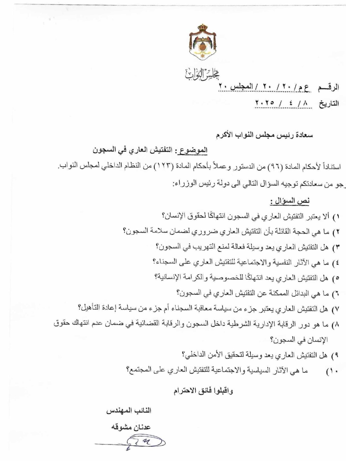 وجه النائب عدنان مشوقة، سؤالا نيابيا لرئيس الوزراء، حول حقيقة "التفتيش العاري في السجون".