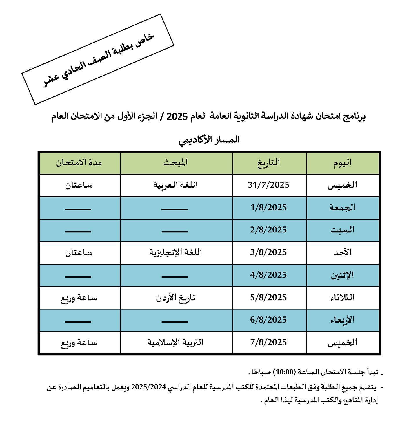 أعلنت وزارة التربية والتعليم اليوم، جدول امتحانات شهادة الدراسة الثانوية العامة (التوجيهي) لعام 2025 لطلبة الصف الحادي عشر.
