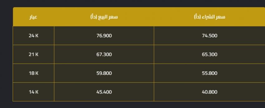 وبلغت أسعار بيع غرامات الذهب من العيارات 24 و18 و14 على التوالي 76.9دينارًا 59.8 دينارًا و45.4 دينارًا على التوالي.