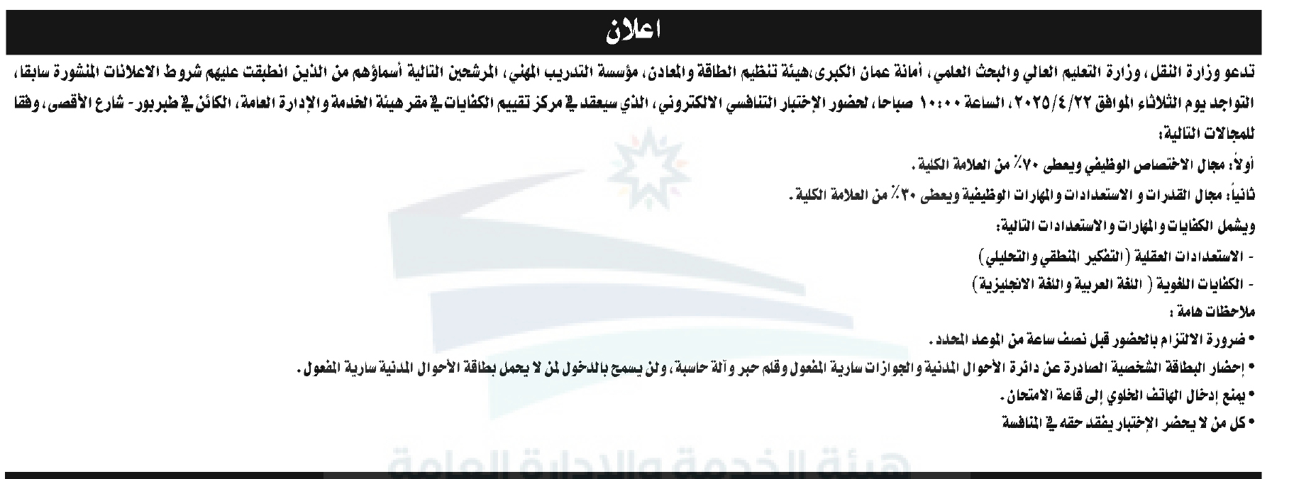 دعت عدة جهات رسمية، مرشحين لحضور الامتحان التنافسي الإلكتروني في هيئة الخدمة والإدارة العامة وفقا للمواعد والتفاصيل التالي: