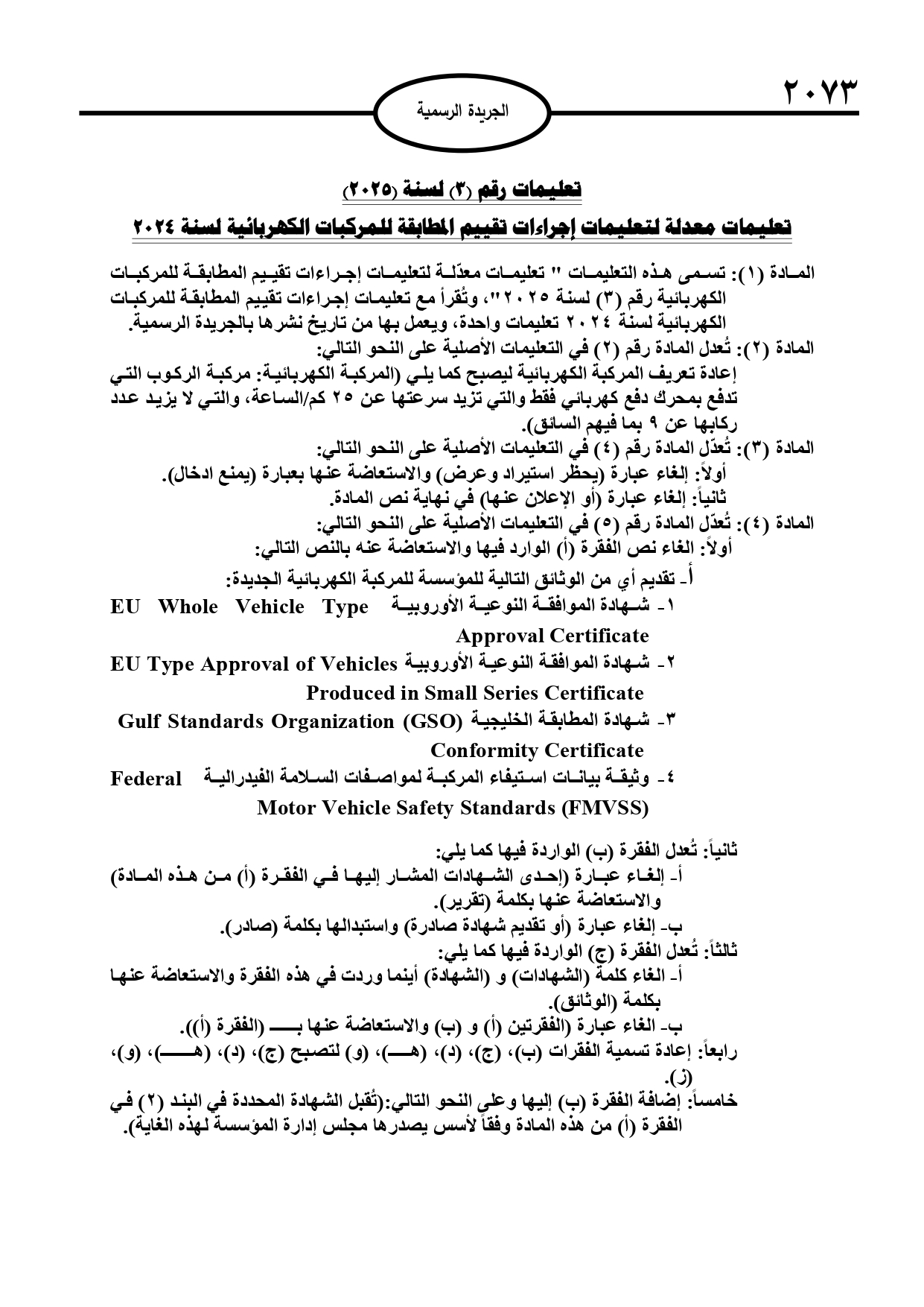 وفي المادة 5، جرى تعديل الفقرة (أ) بإلزام تقديم إحدى الوثائق التالية للمركبة الكهربائية الجديدة: شهادة الموافقة النوعية الأوروبية EU Whole Vehicle Type Approval Certificate، شهادة الموافقة النوعية الأوروبية EU Type Approval of Vehicles Produced in Small Series Certificate، شهادة المطابقة الخليجية ( Gulf Standards Organization Conformity Certificate (GSO، وثيقة بيانات استيفاء المركبة لمواصفات السلامة الفيدرالية Federal Motor Vehicle Safety Standards (FMVSS).