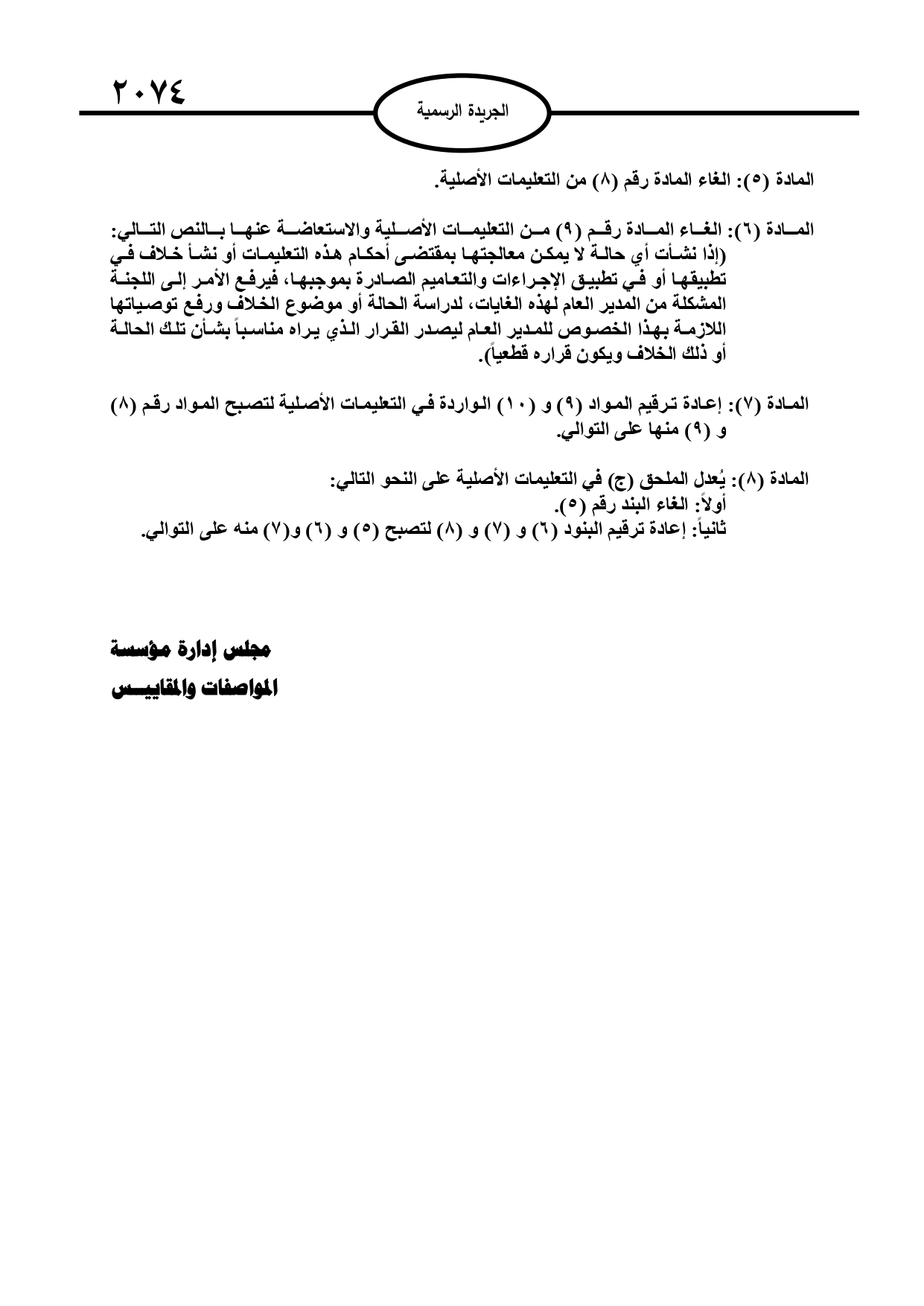 كما تم إلغاء المادتين (8) و(9) من التعليمات الأصلية، وتعديل المادة رقم (9) السابقة لتُصبح مادة جديدة تنص على تشكيل لجنة من قِبل المدير العام للنظر في أي حالات أو خلافات تنشأ حول تطبيق التعليمات، ويُعتبر قرار المدير العام في هذه الحالات نهائيًا.