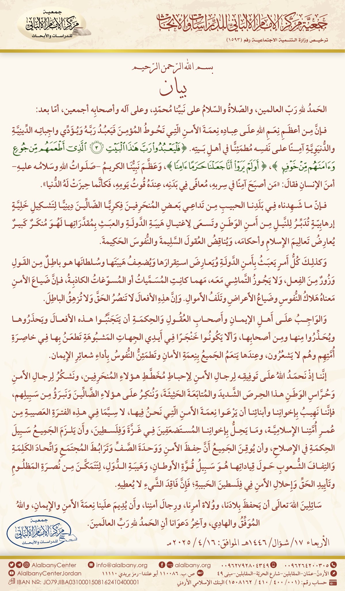 قالت جمعية مركز الإمام الألباني للدراسات والأبحاث، ومقرها عمّان، إن محاولات النيل من أمن الوطن والعبث بمقدراته، هو "منكر كبير يعارض تعاليم الإسلام وأحكامه".