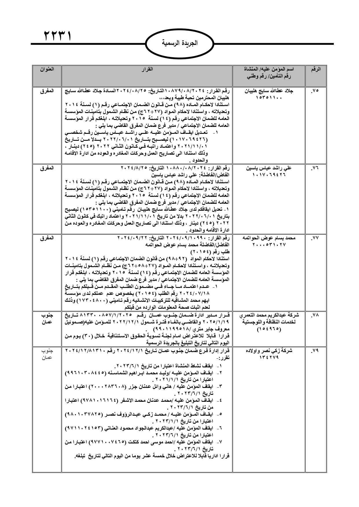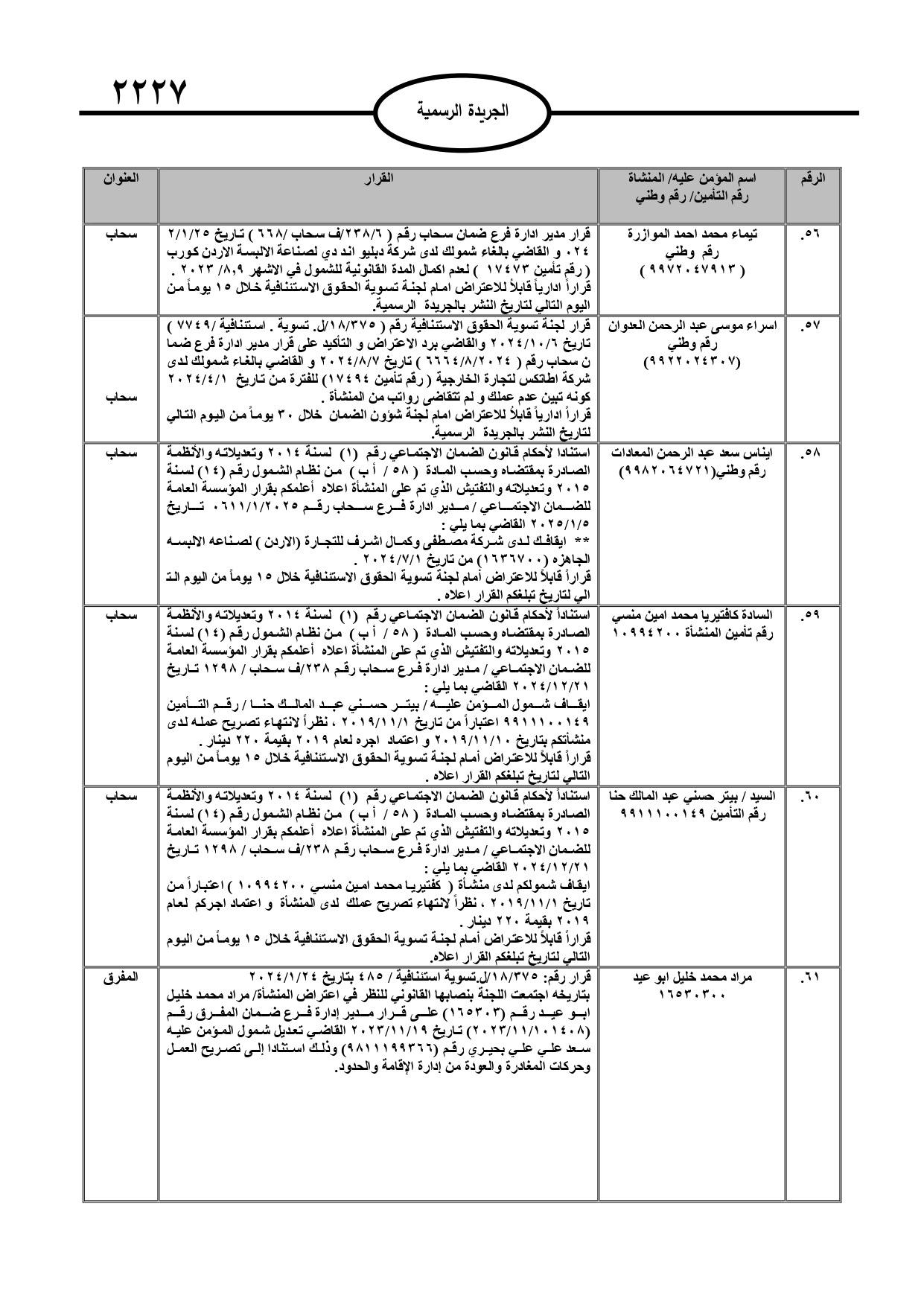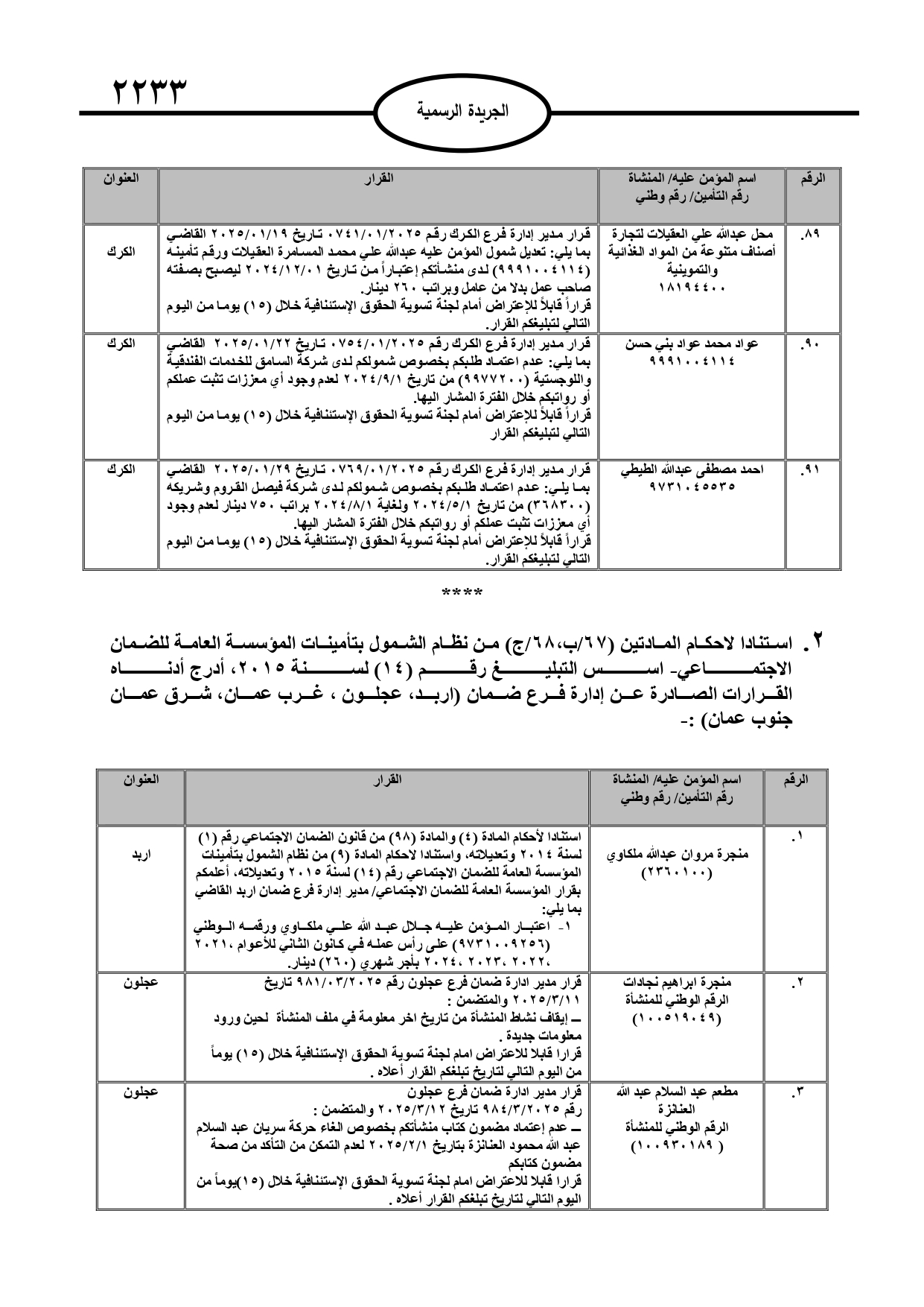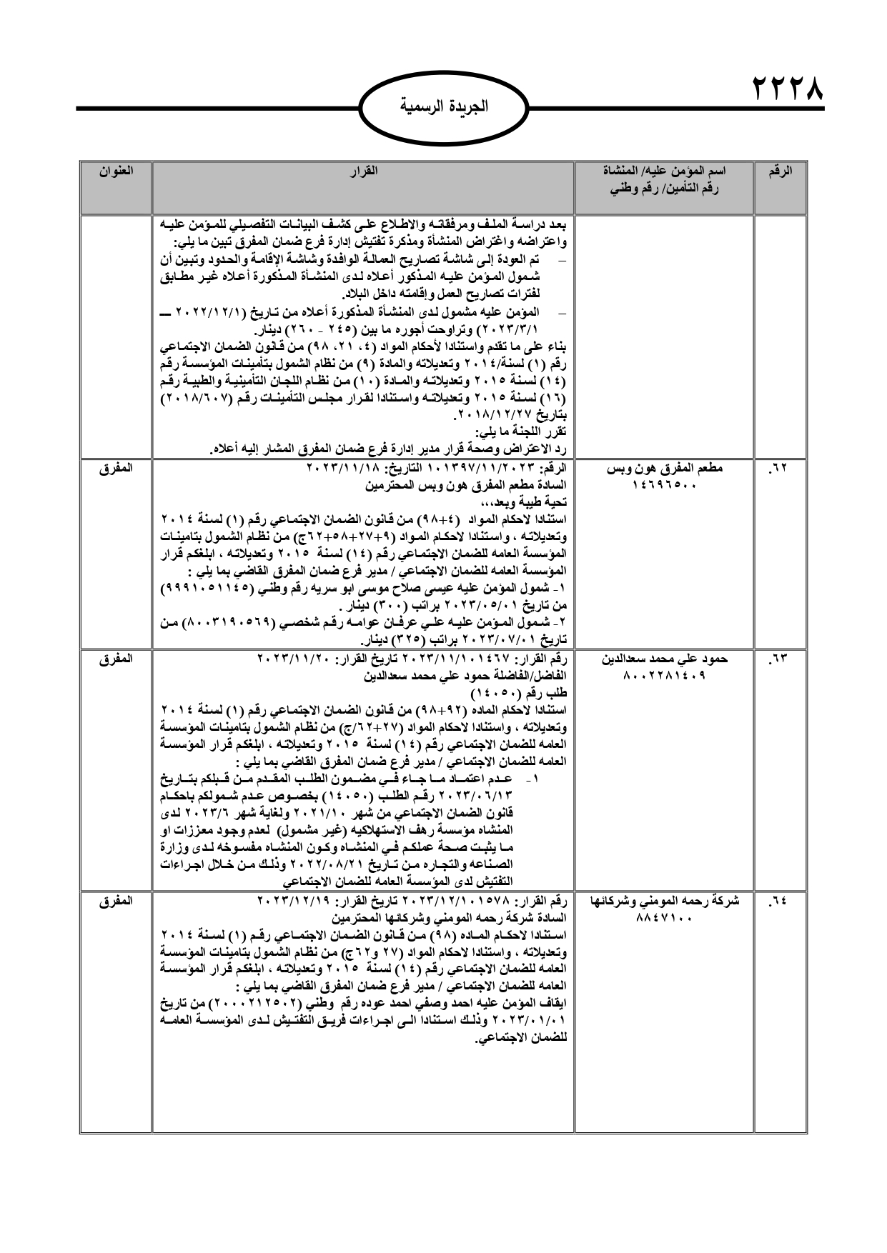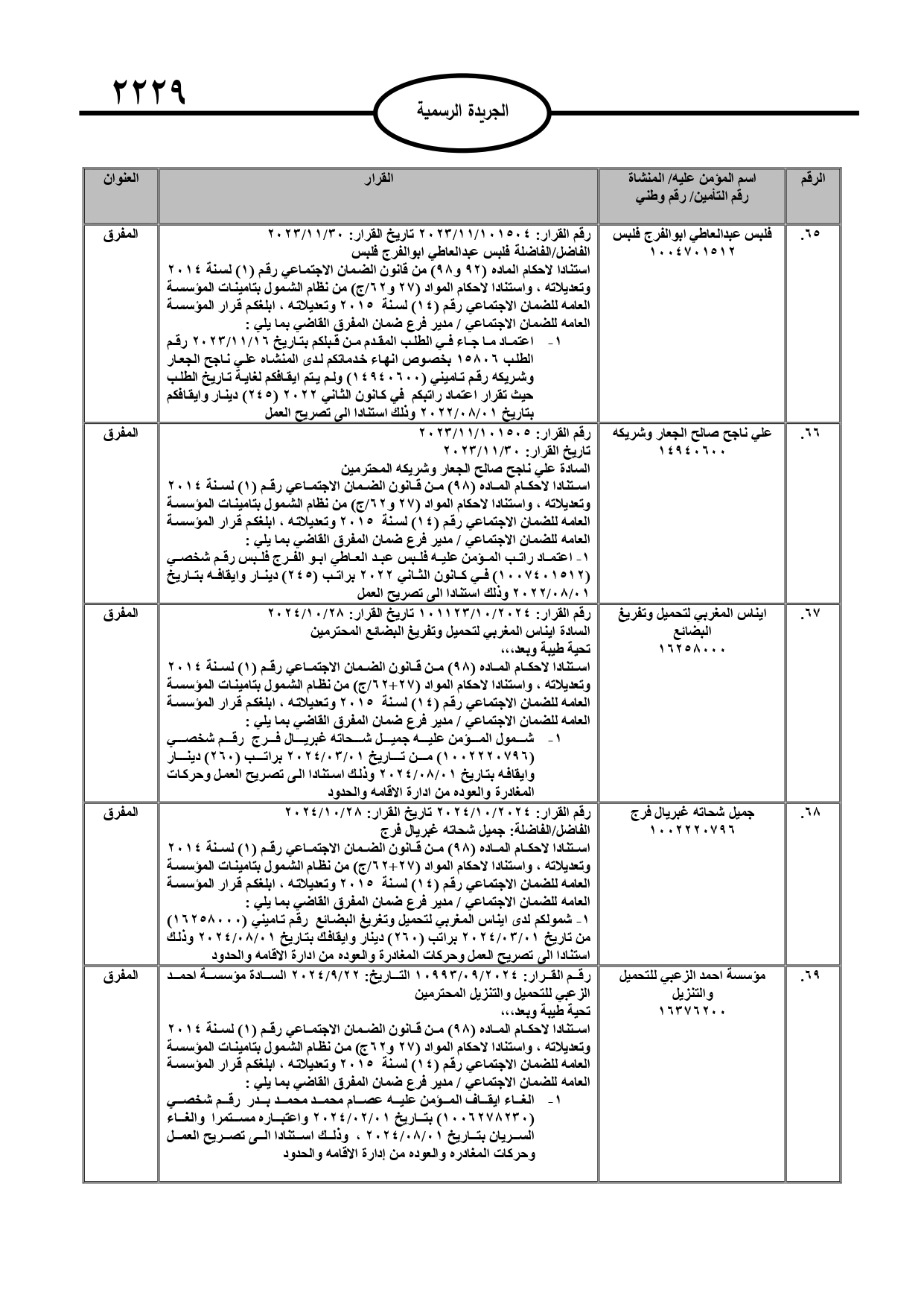 نُشر في عدد الجريدة الرسمية، الأربعاء، قرارات صادرة عن مدير عام المؤسسة العامة للضمان الاجتماعي.