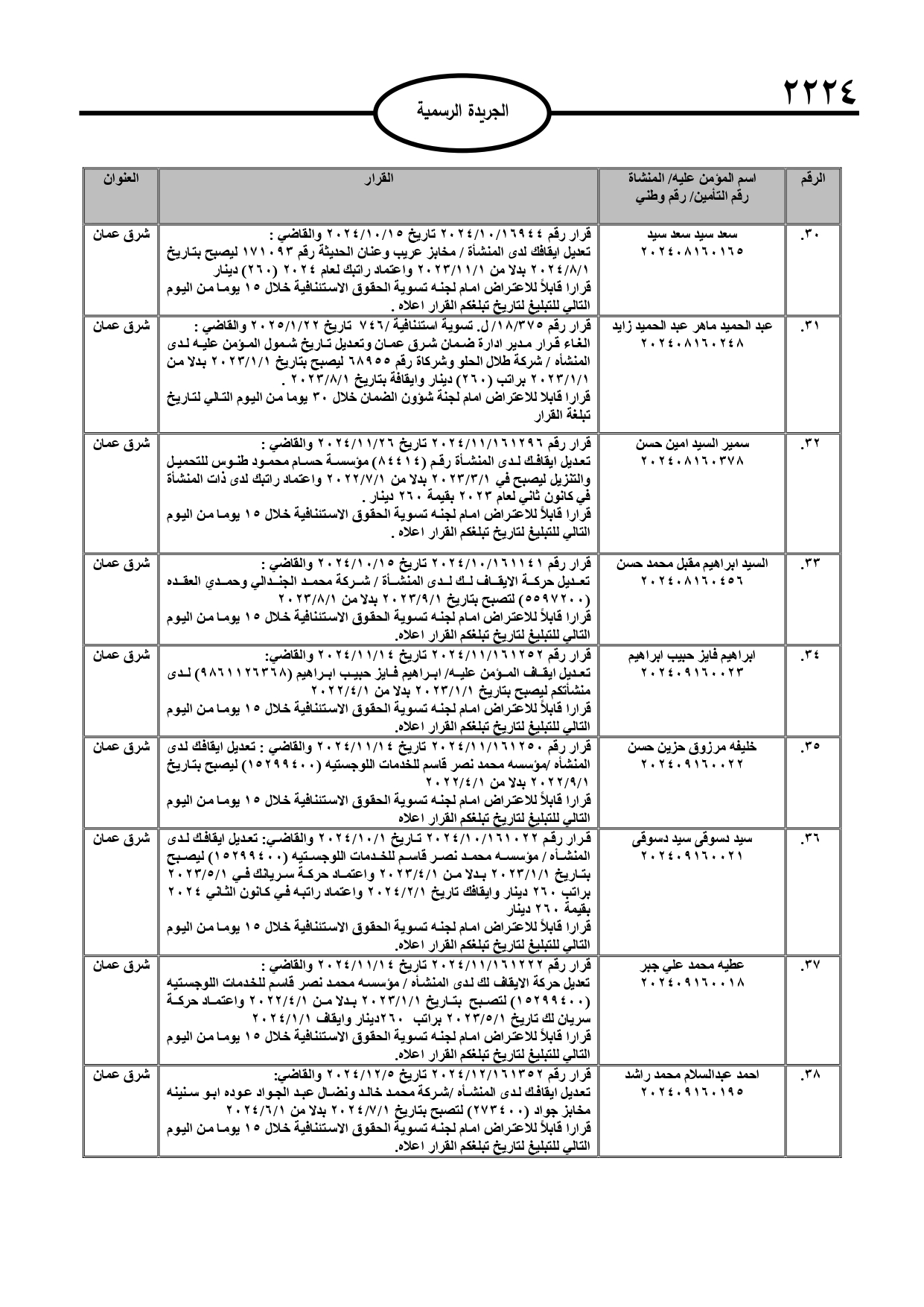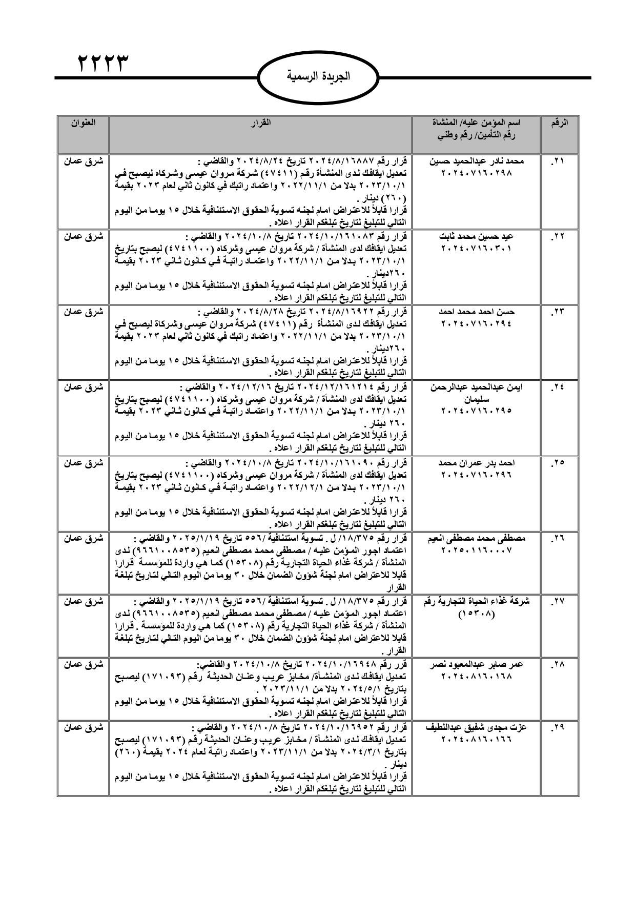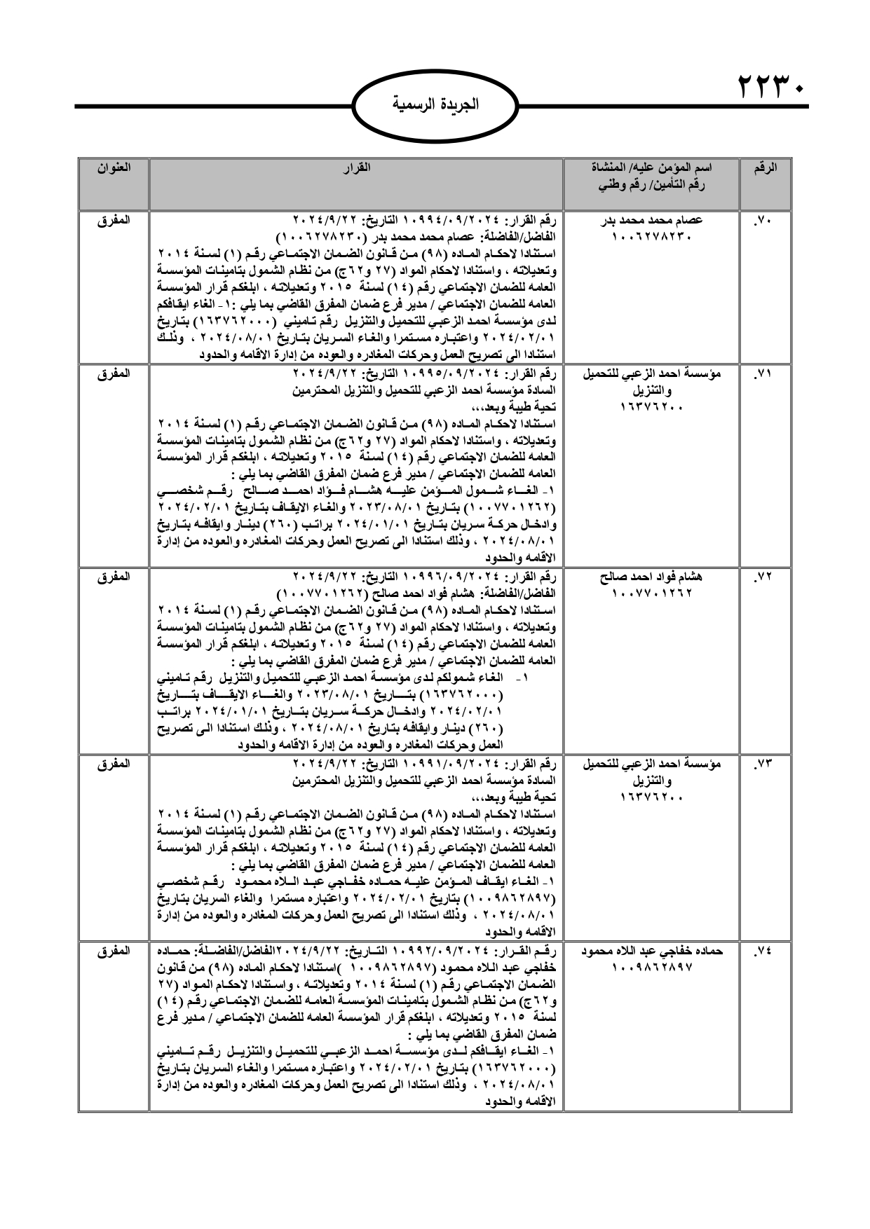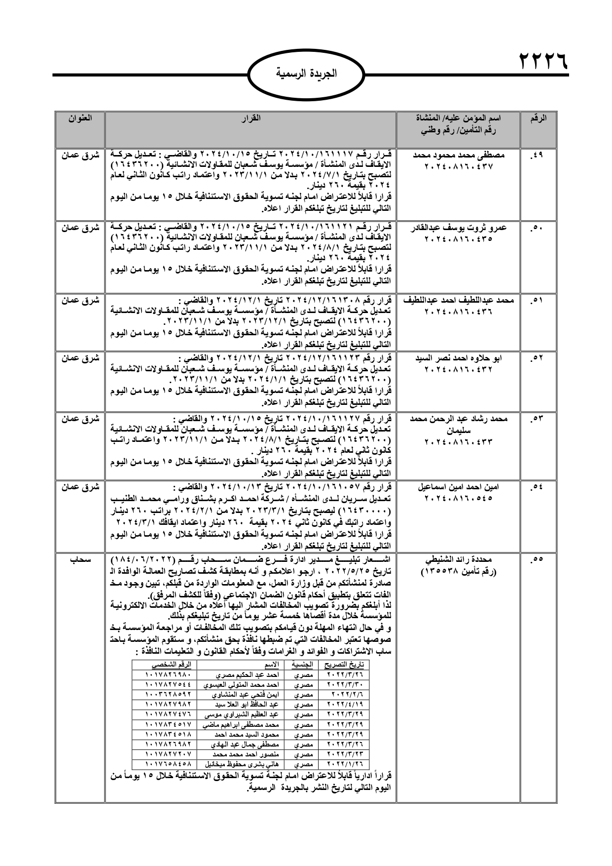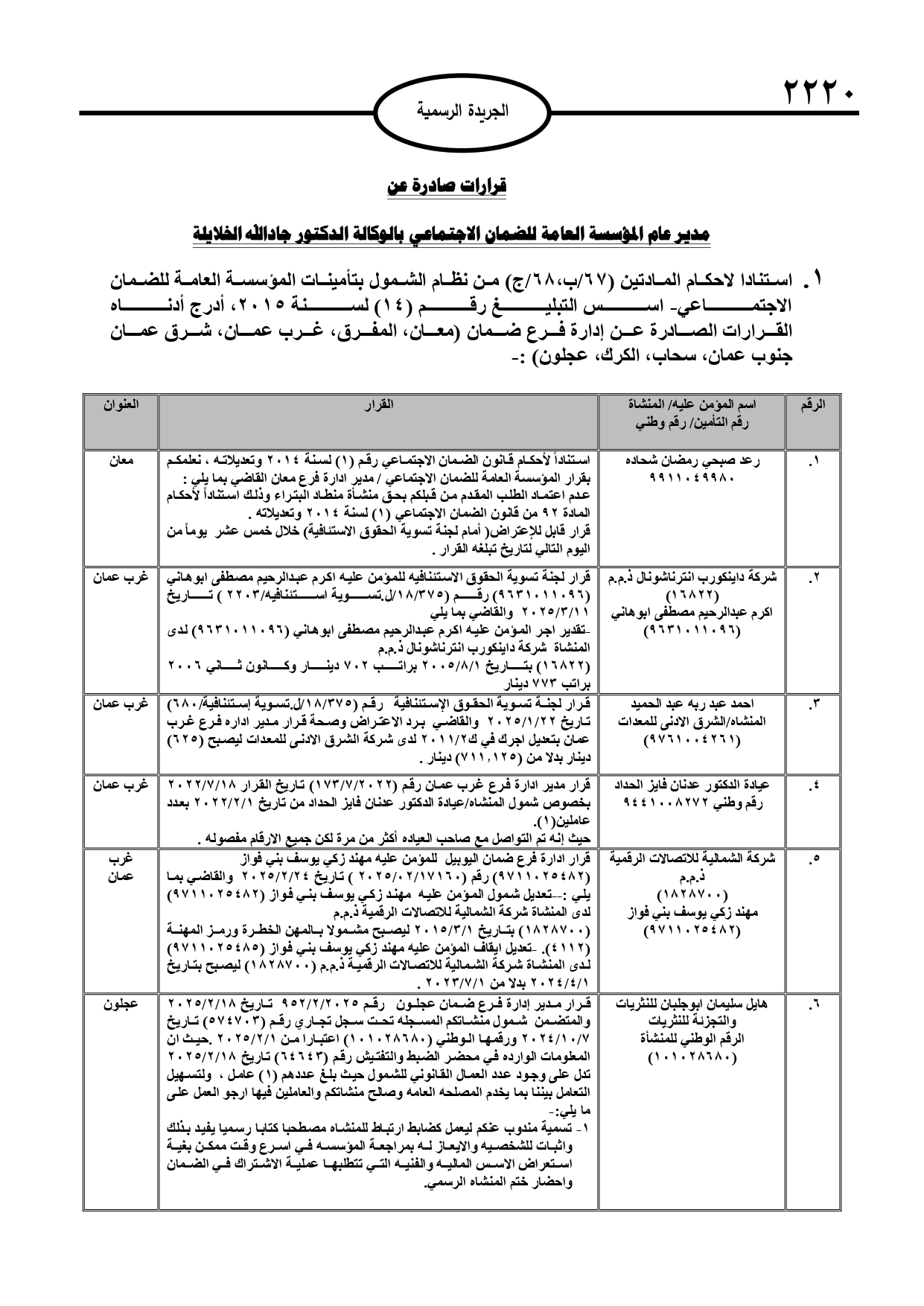 نُشر في عدد الجريدة الرسمية، الأربعاء، قرارات صادرة عن مدير عام المؤسسة العامة للضمان الاجتماعي.