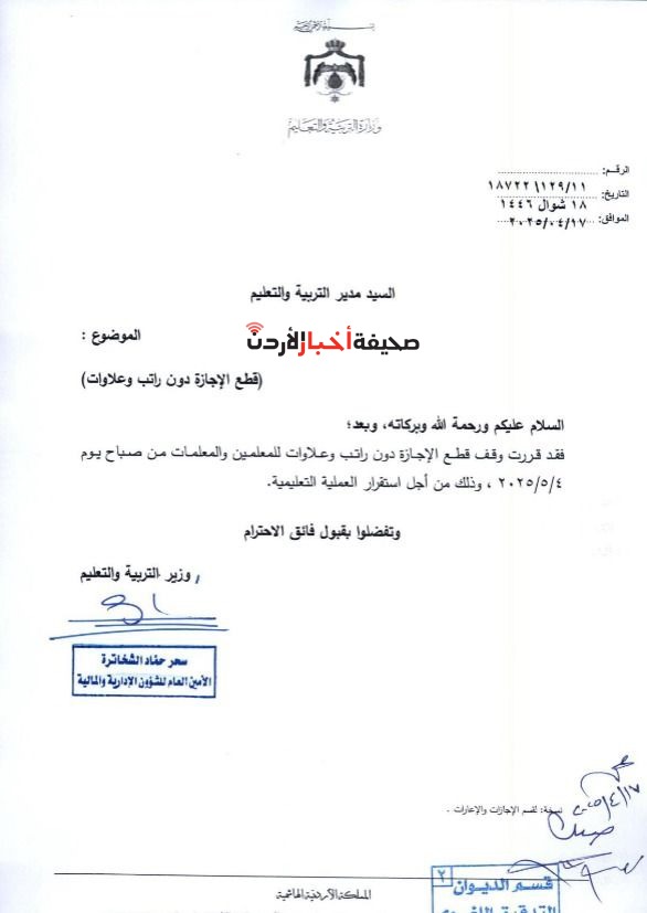 قرر وزير التربية والتعليم، وقف قطع الإجازة دون راتب وعلاوات للمعلمين والمعلمات من صباح يوم 4- 5- 2025، وذلك من أجل استقرار العملية التعليمية.