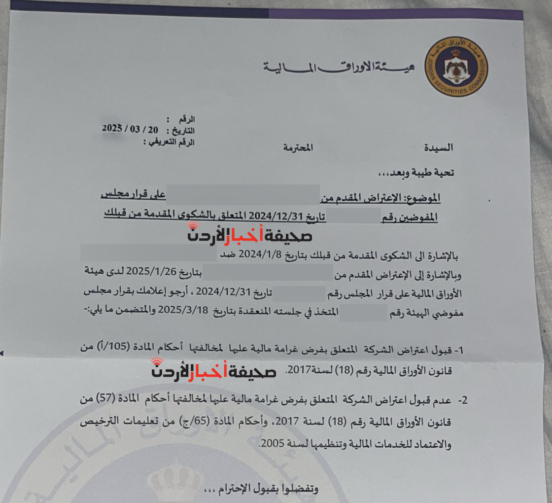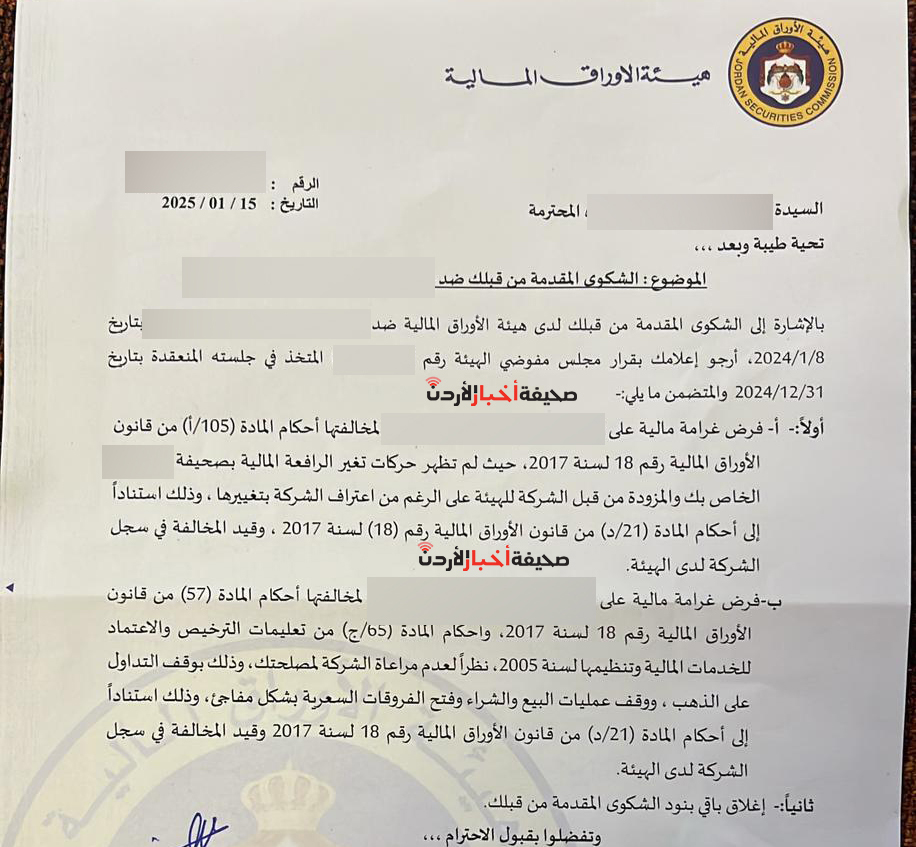 أظهرت وثيقة رسمية وصلت صحيفة "أخبار الأردن" الإلكترونية، صادرة عن هيئة الأوراق المالية، واحدة من أخطر قضايا الفساد المالي، وتحديدًا داخل شركة وساطة مالية وتداول.