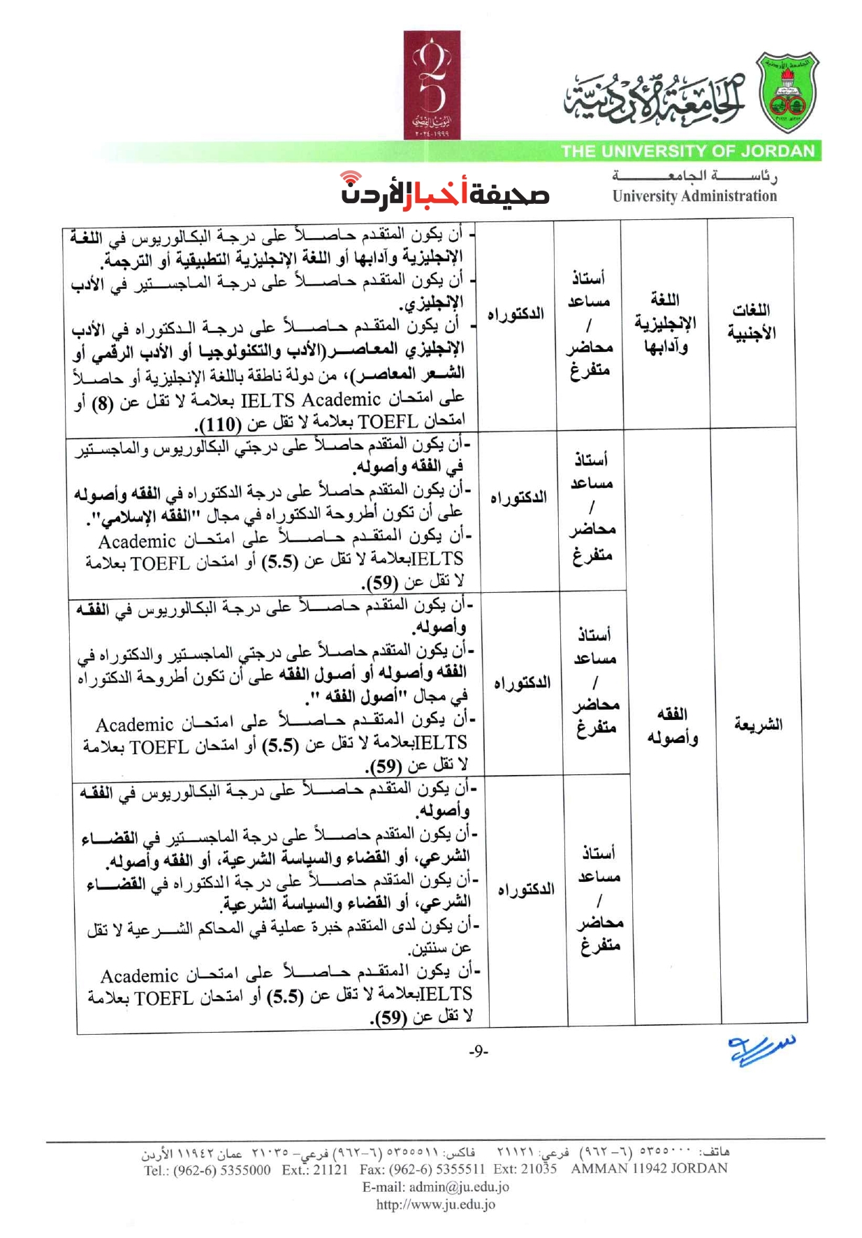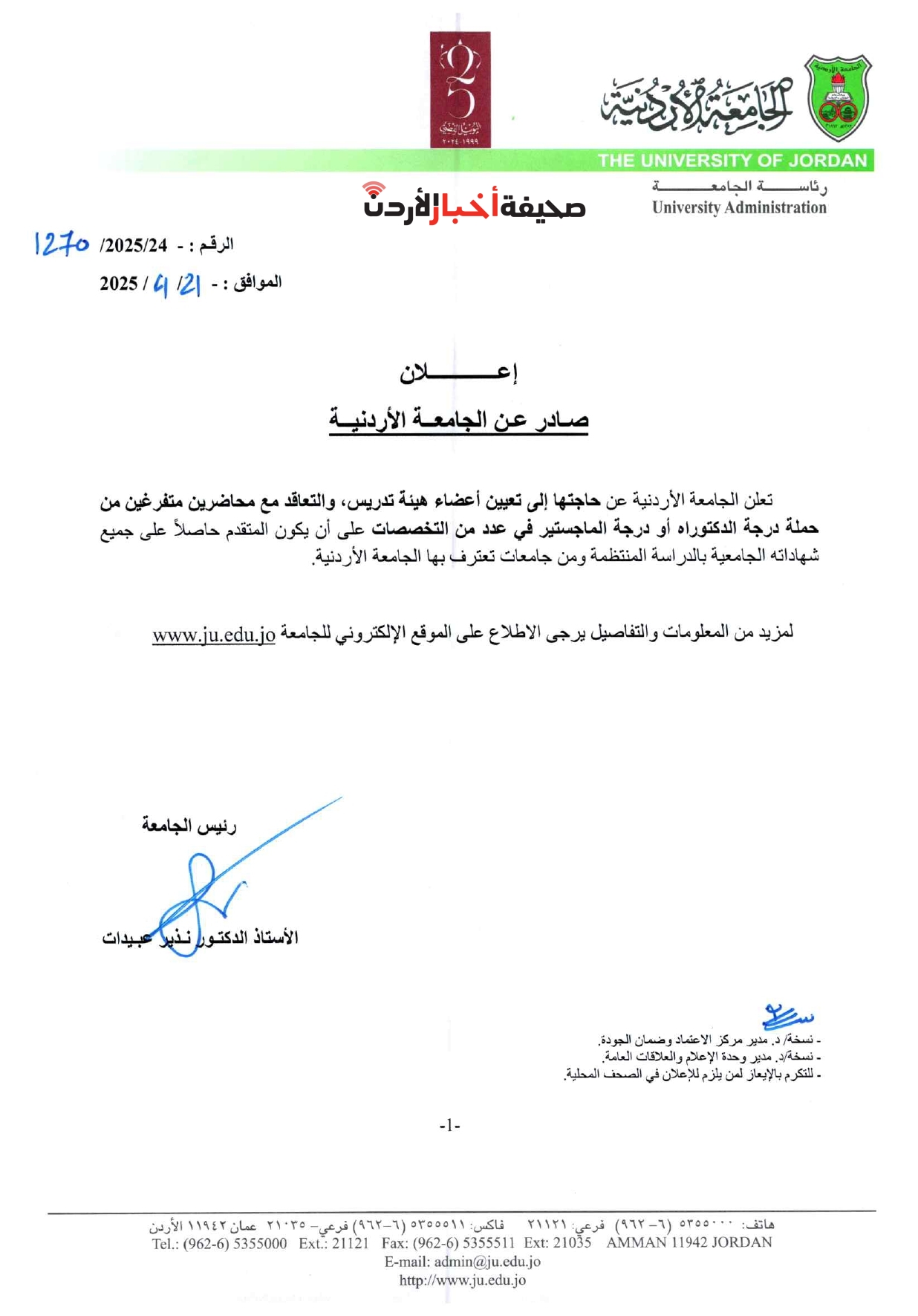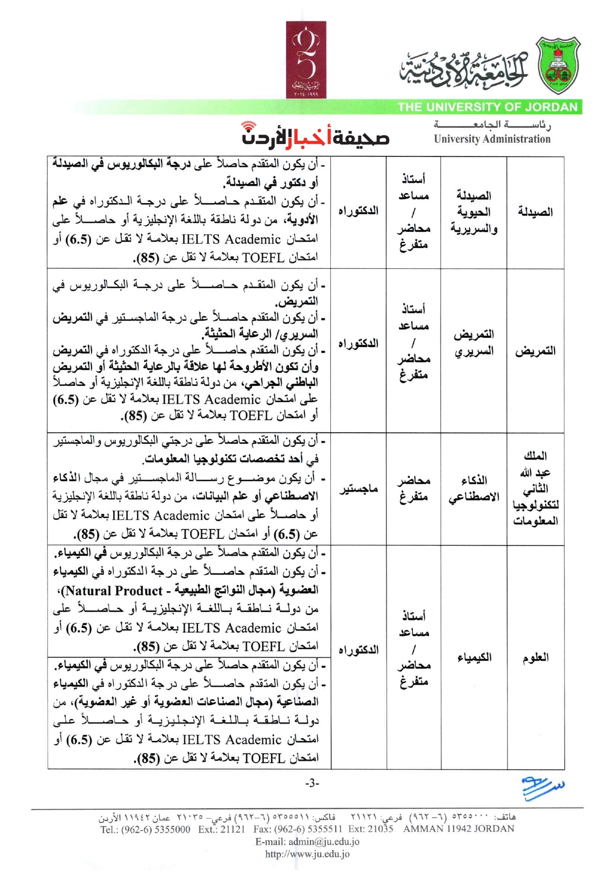 أعلنت الجامعة الأردنية، يوم الاثنين، عن توفر شواغر لتعيين أعضاء هيئة تدريس، إلى جانب التعاقد مع محاضرين متفرغين من حملة شهادة الدكتوراه أو الماجستير في عدد من التخصصات الأكاديمية.