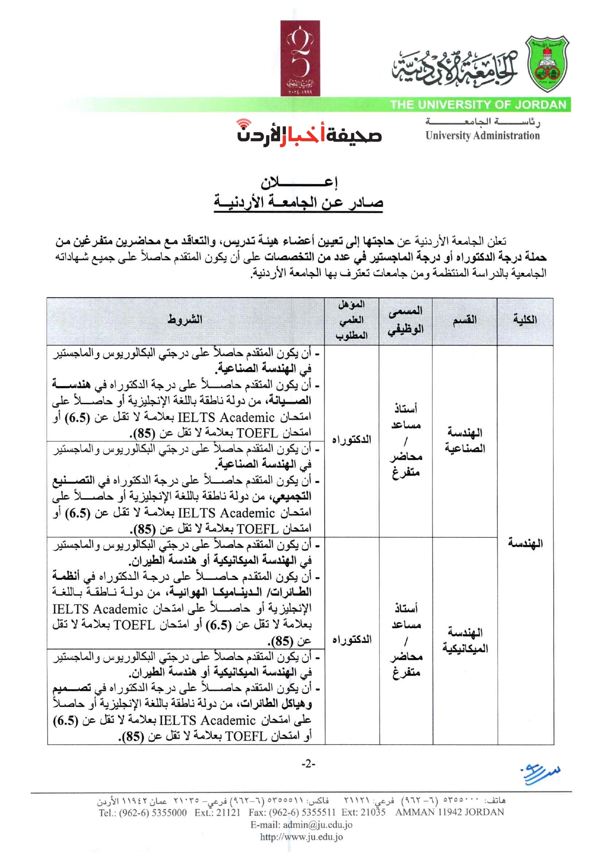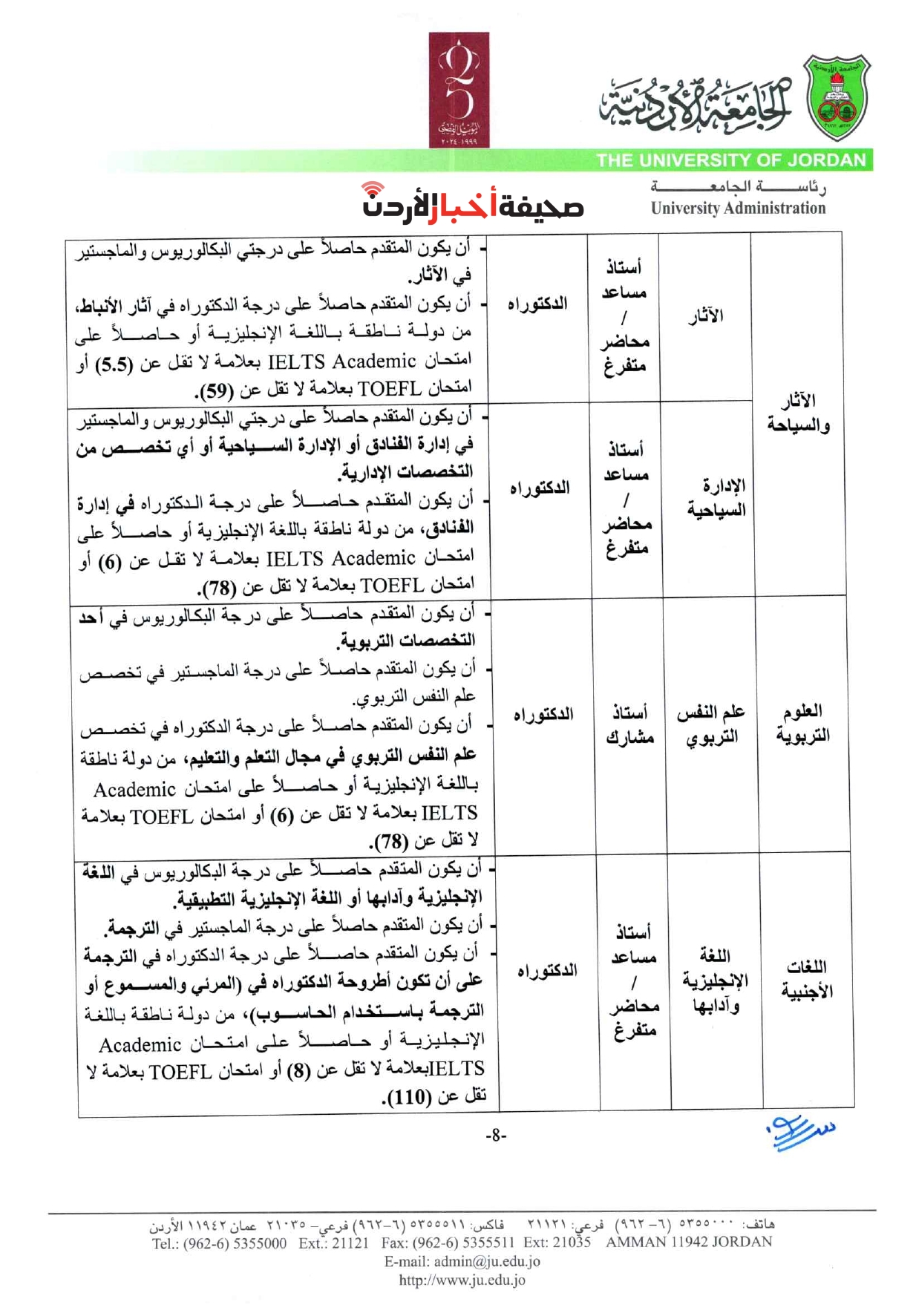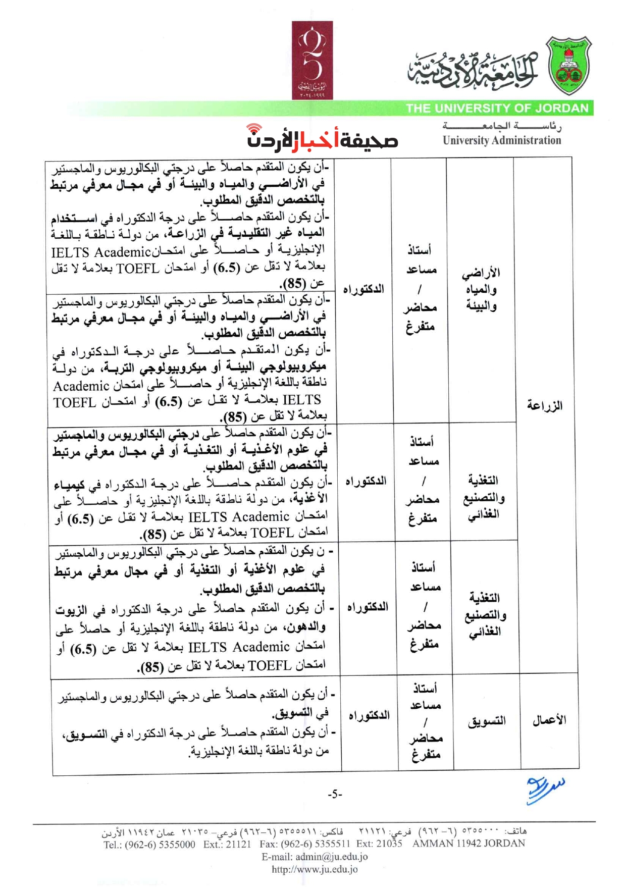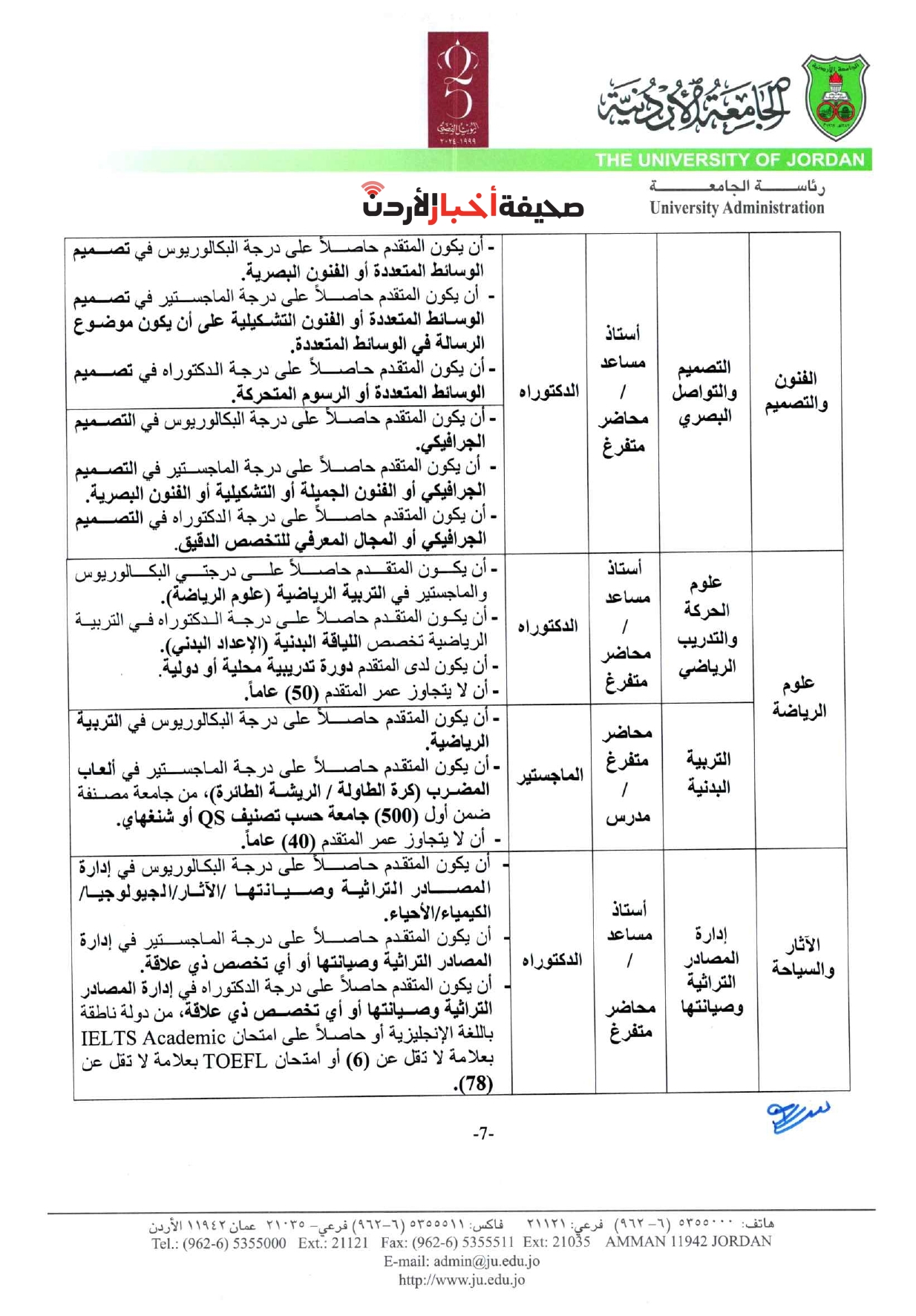 أعلنت الجامعة الأردنية، يوم الاثنين، عن توفر شواغر لتعيين أعضاء هيئة تدريس، إلى جانب التعاقد مع محاضرين متفرغين من حملة شهادة الدكتوراه أو الماجستير في عدد من التخصصات الأكاديمية.