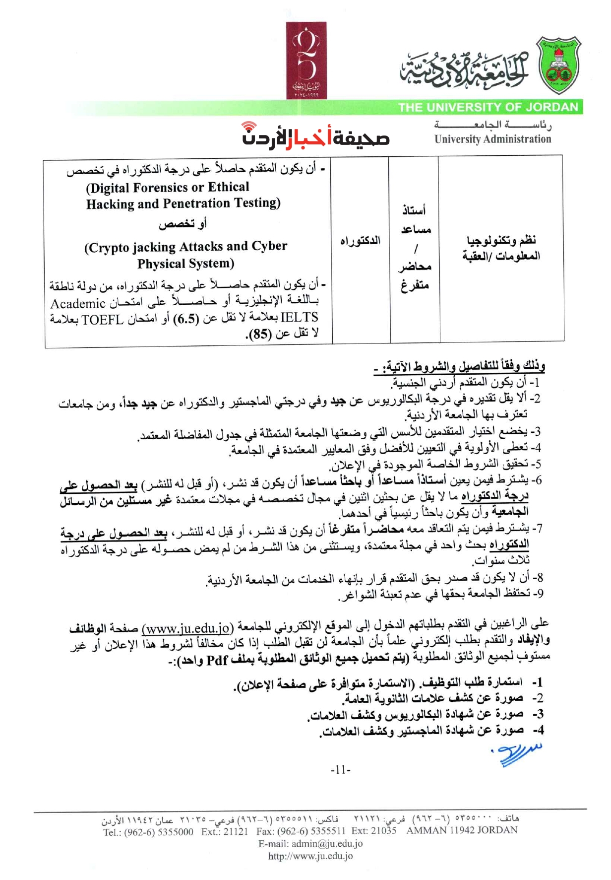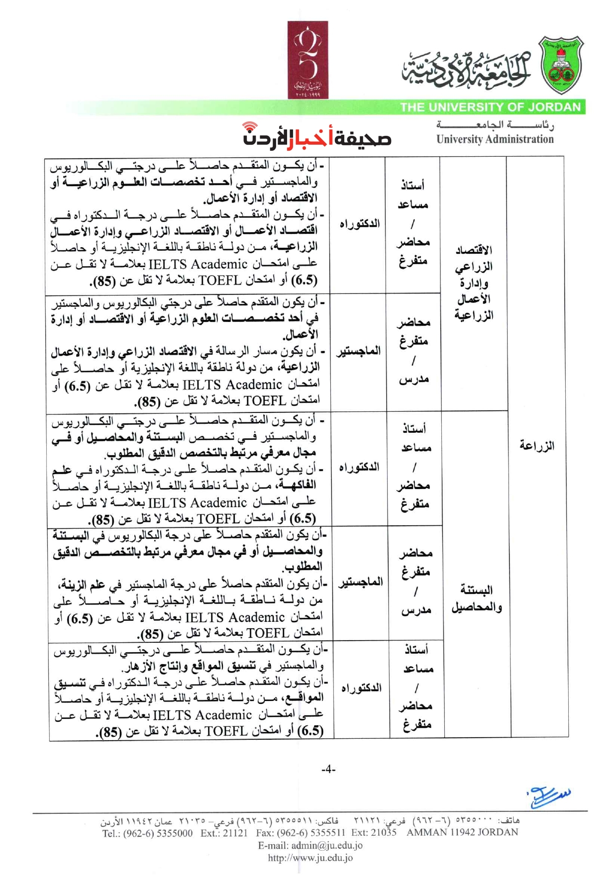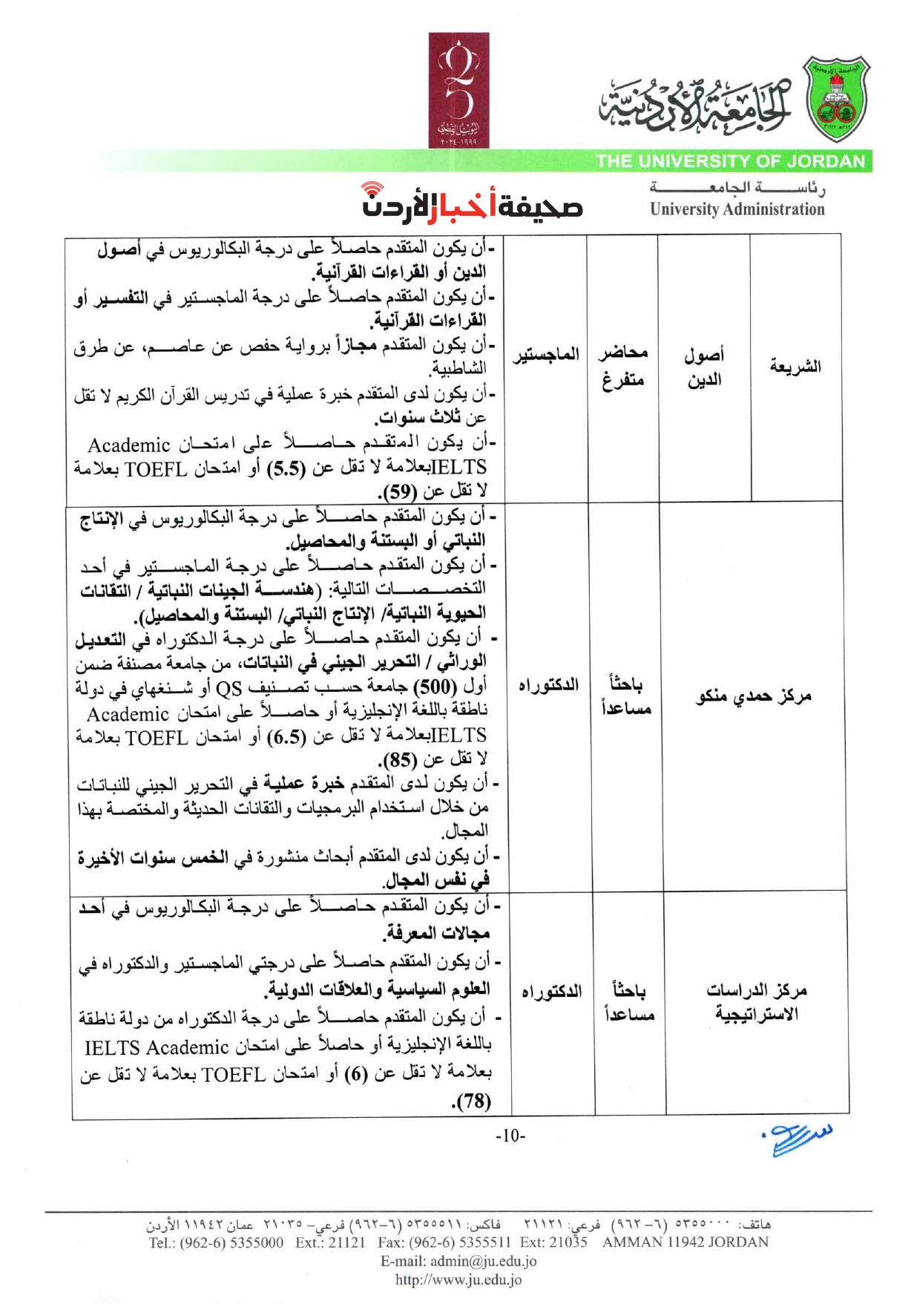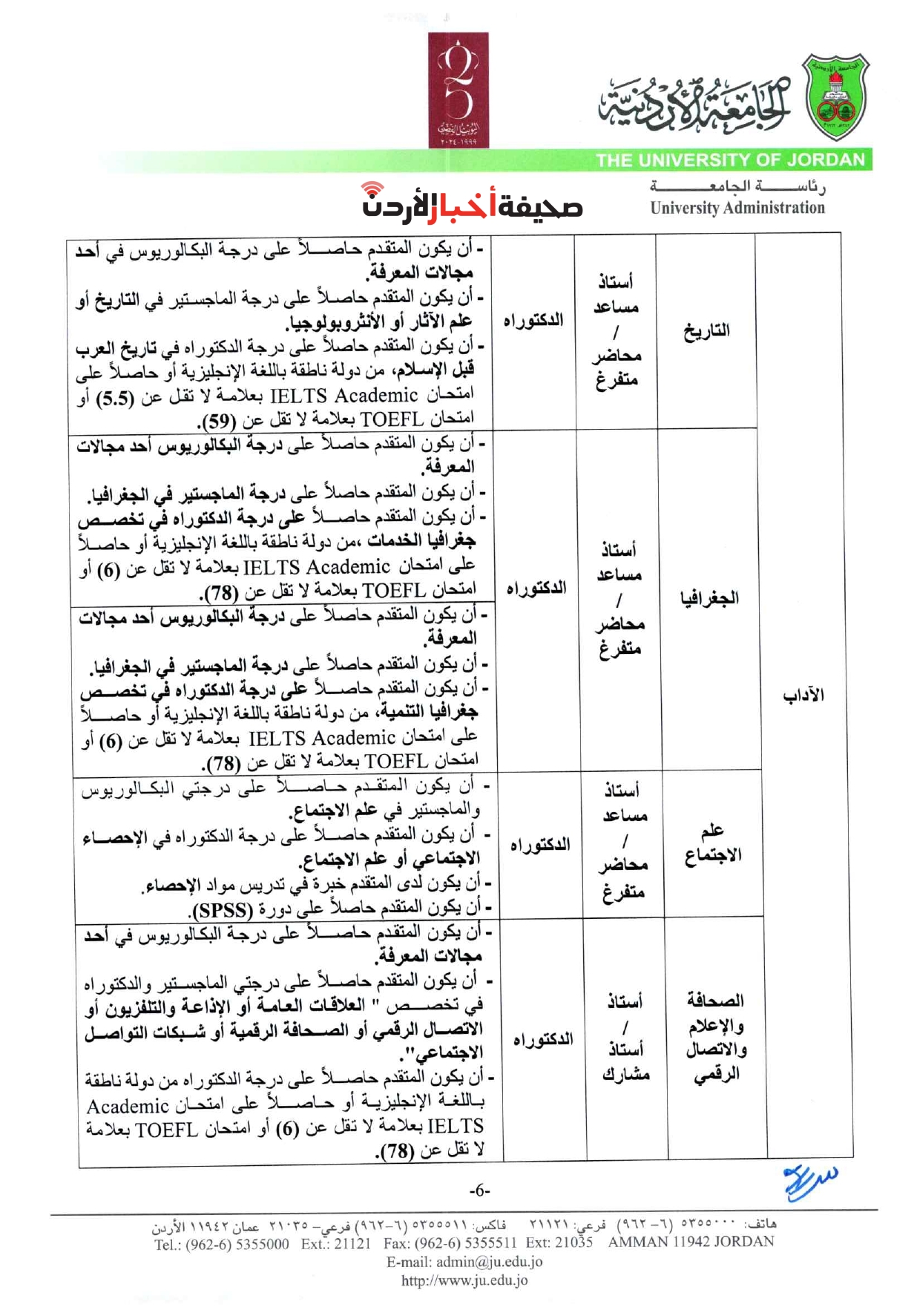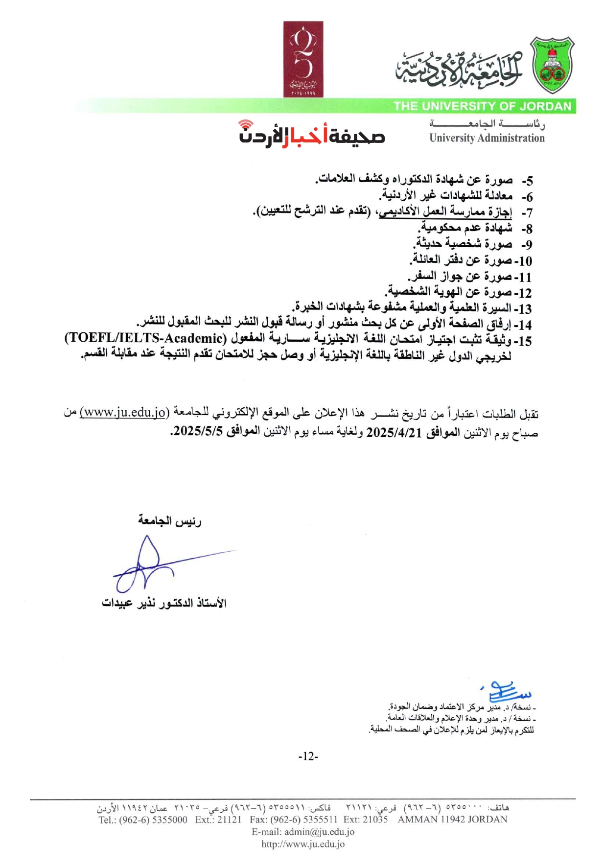 وأوضحت الجامعة أن من شروط التقدم أن يكون المتقدم حاصلًا على جميع شهاداته الأكاديمية من خلال الدراسة المنتظمة ومن جامعات معترف بها رسميًا من قبل الجامعة الأردنية.