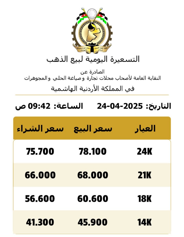 وأظهرت نشرة الأسعار الرسمية أن سعر غرام الذهب من عيار 24 بلغ 78.10 دينار، بينما سجل عيار 18 نحو 60.60 دينار، فيما وصل سعر غرام الذهب من عيار 14 إلى 45.90 دينار.
