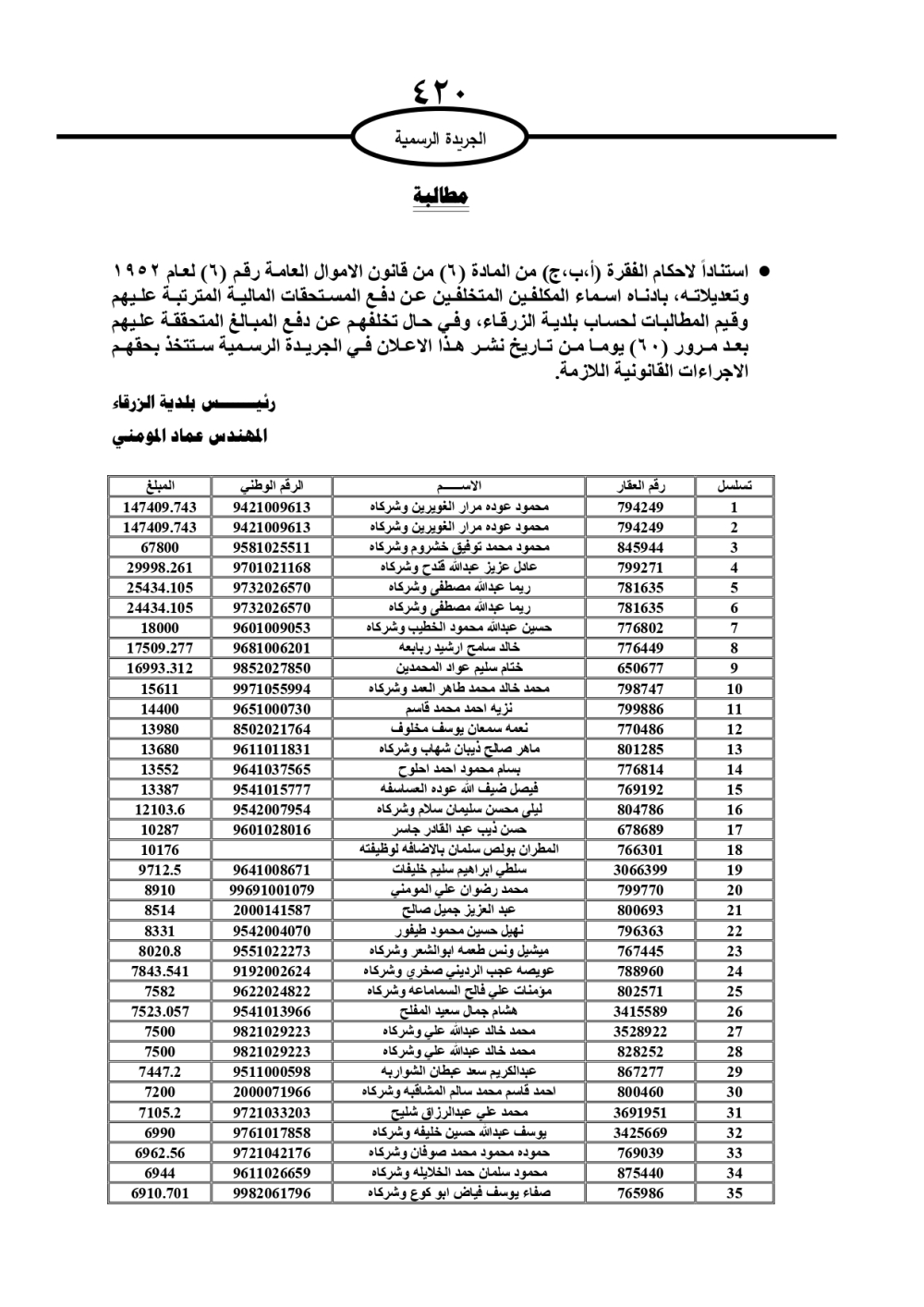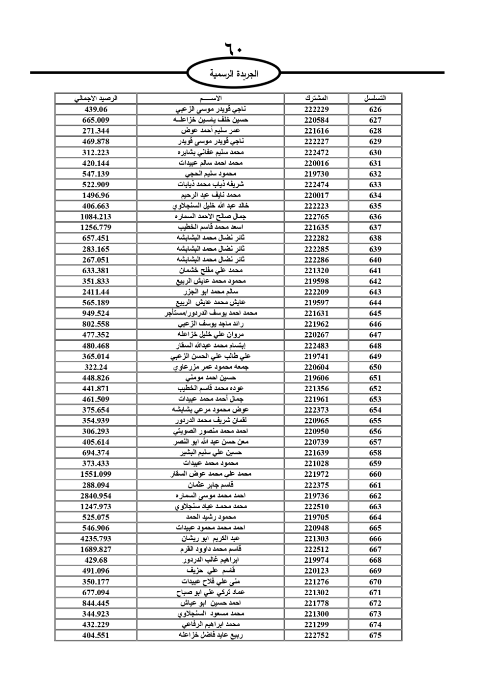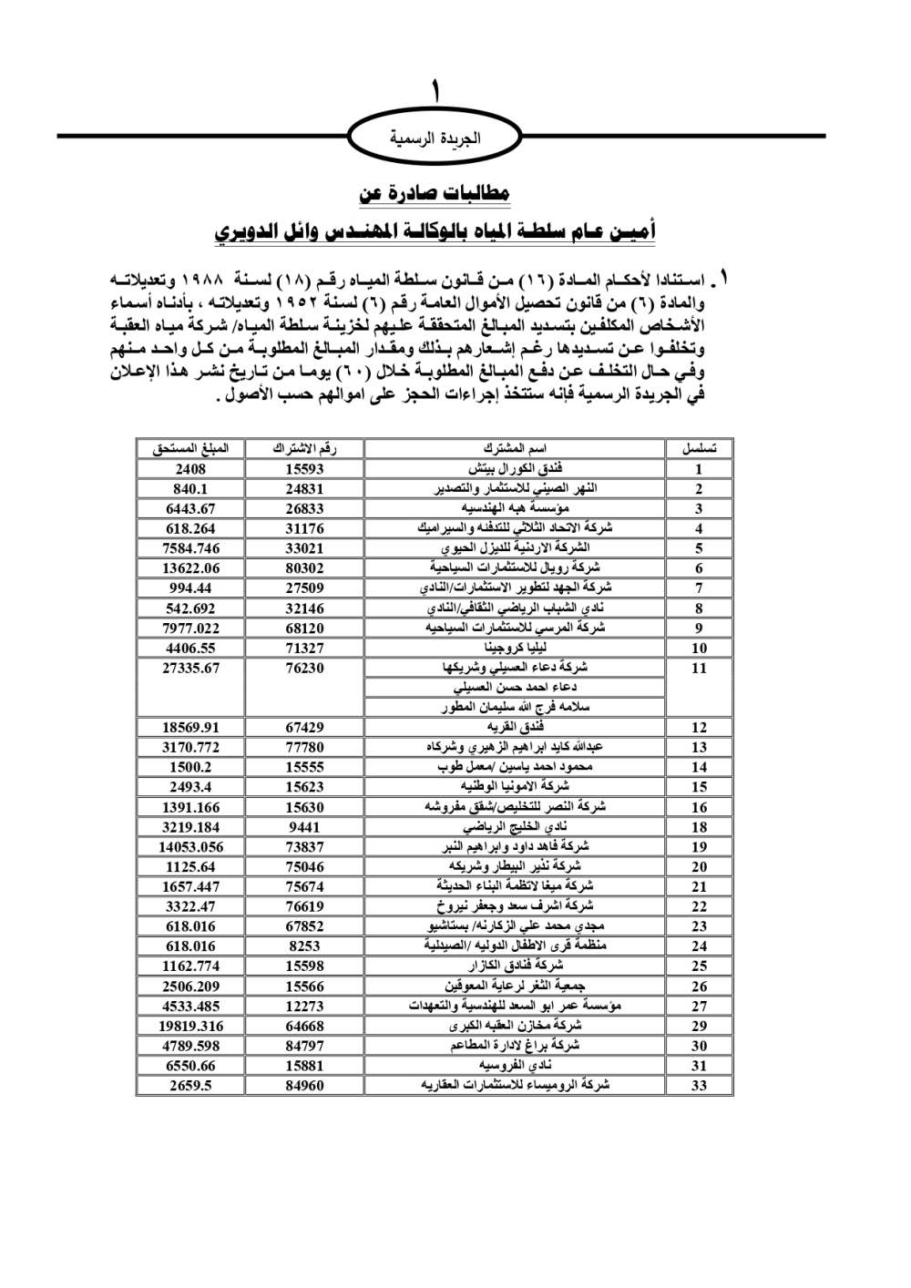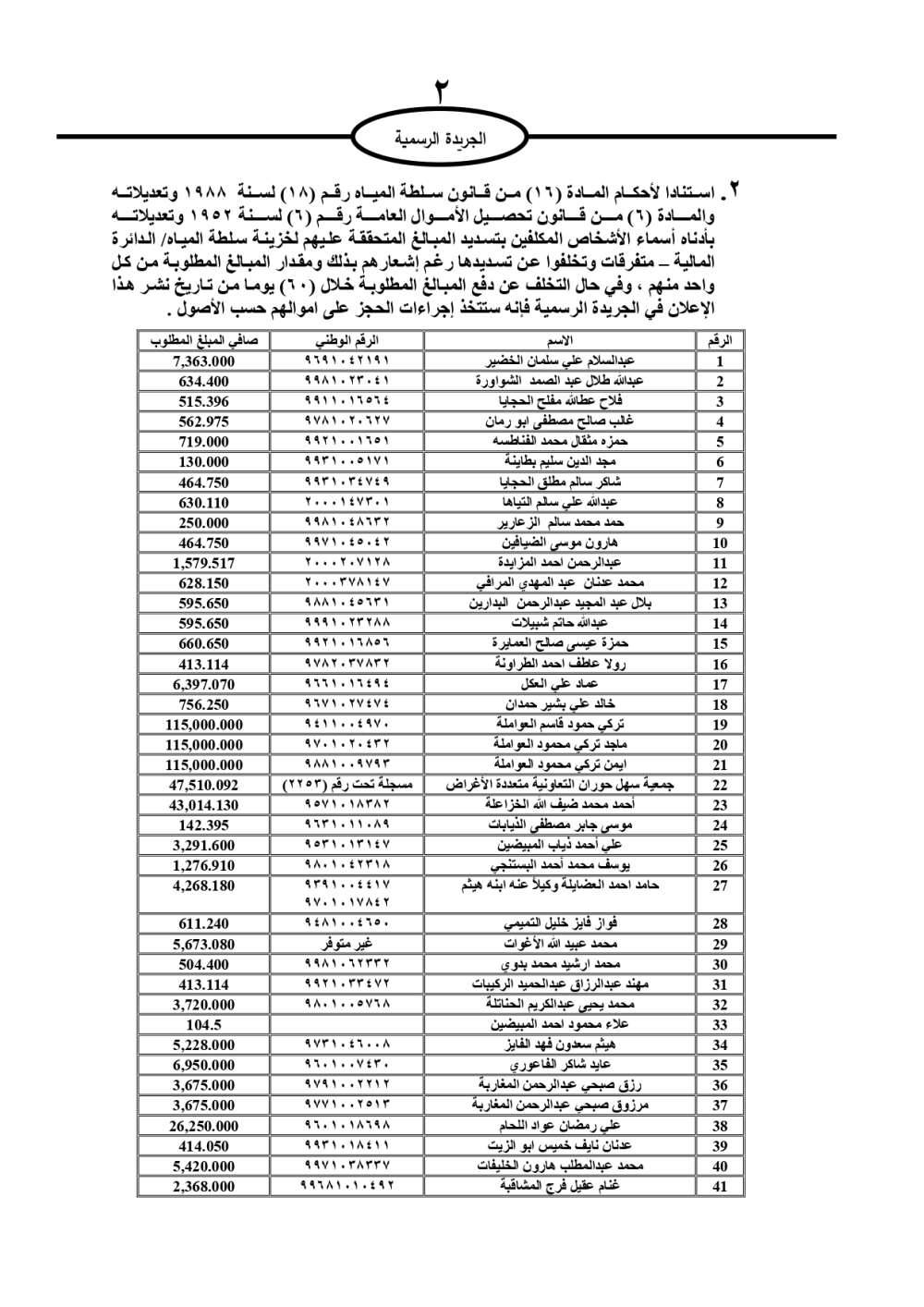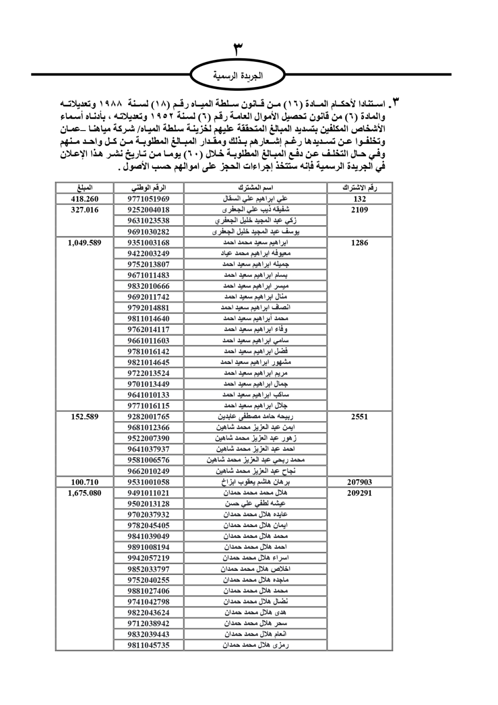 دعت سلطة المياه وبلدية الزرقاء، عشرات آلاف الأردنيين الواردة أسماؤهم بالكشوفات المرفقة، إلى ضرورة مراجعتها لتسوية أوضاعهم المالية كونه ترتب عليهم ذمم مالية، وذلك لتجنب الحجز على الأموال المنقولة وغير المنقولة بعد انقضاء 60 يوما من تاريخ النشر، علما أنه تم نشر هذه الأسماء في الجريدة الرسمية بتاريخ 16/2/2025.