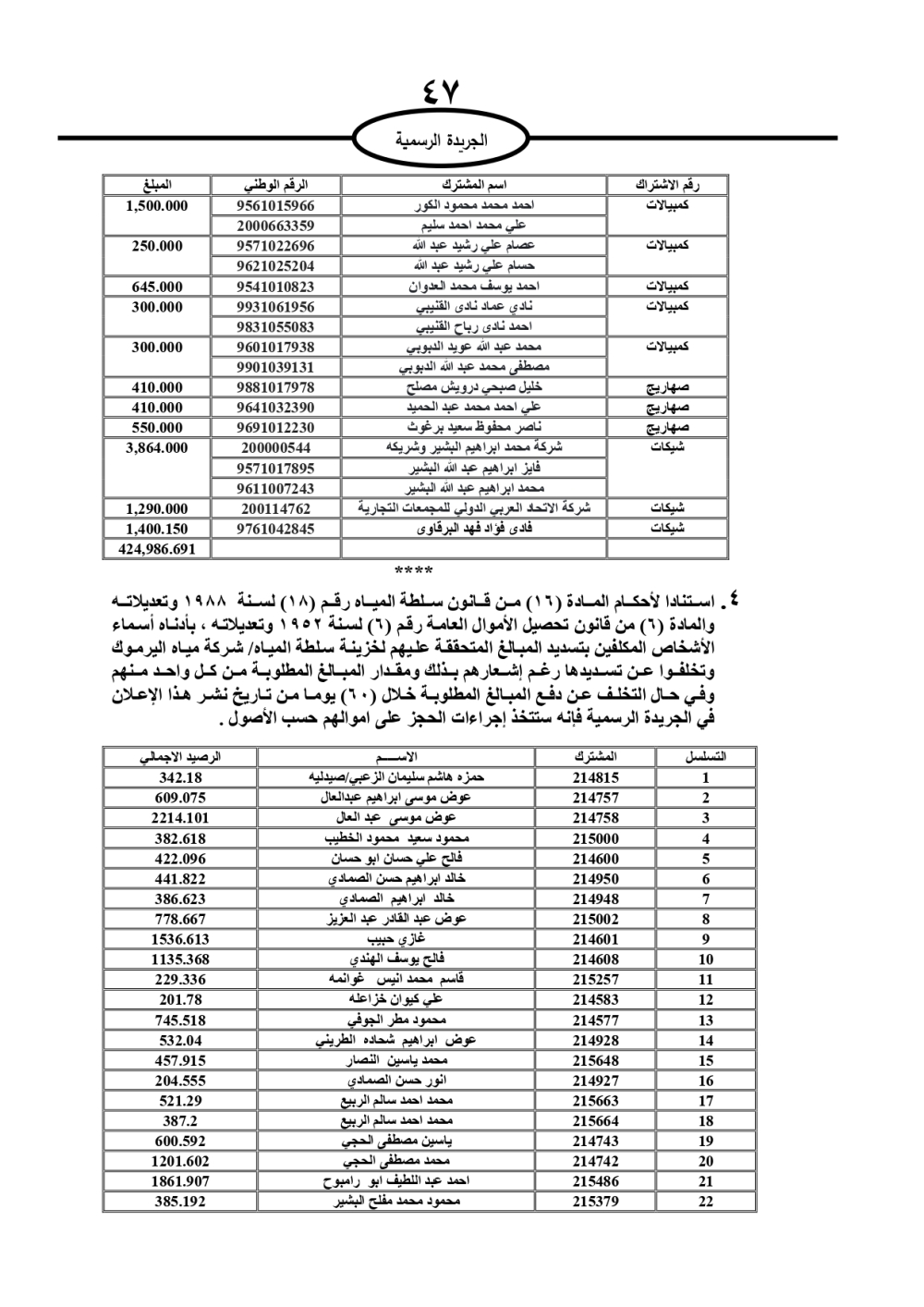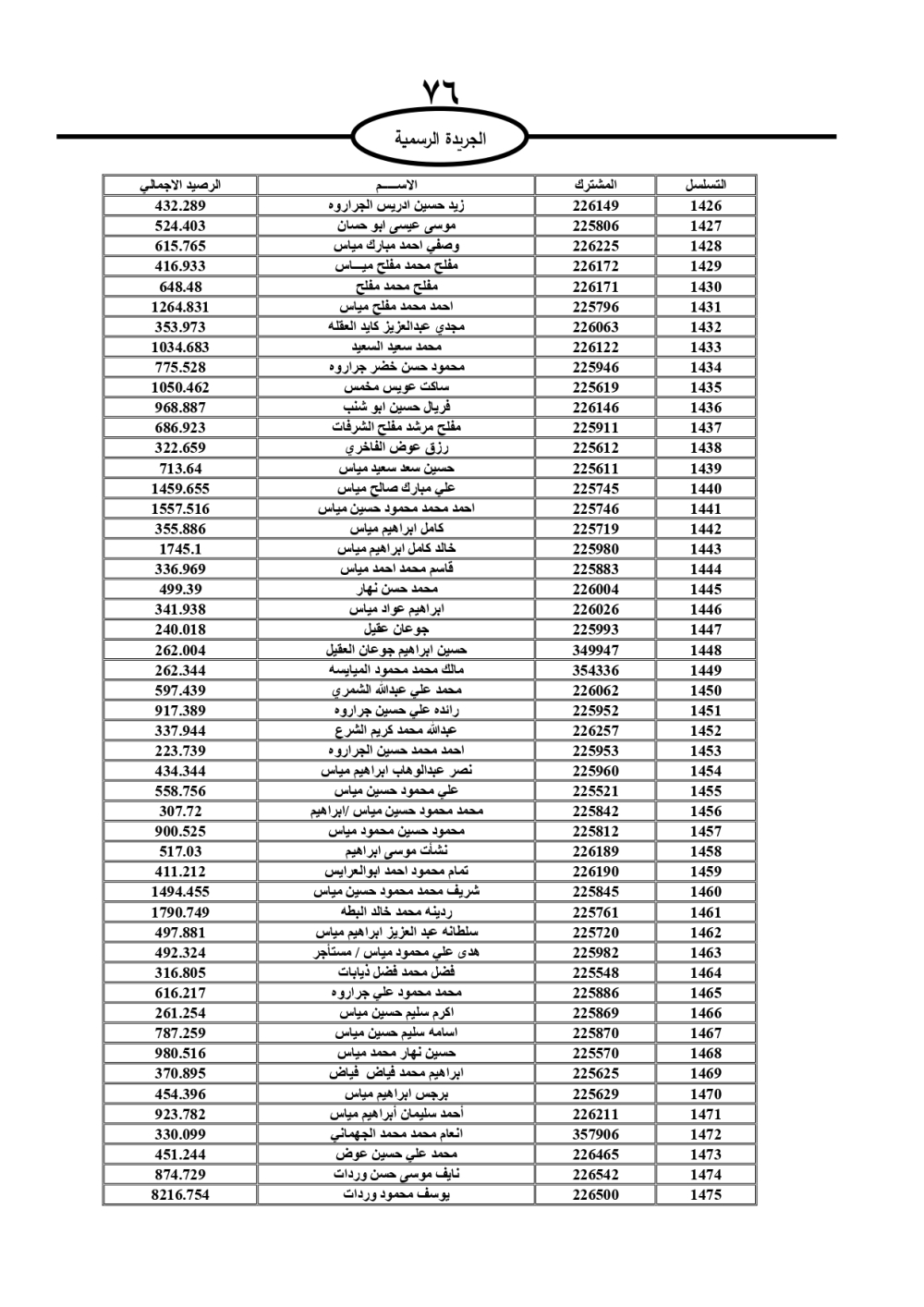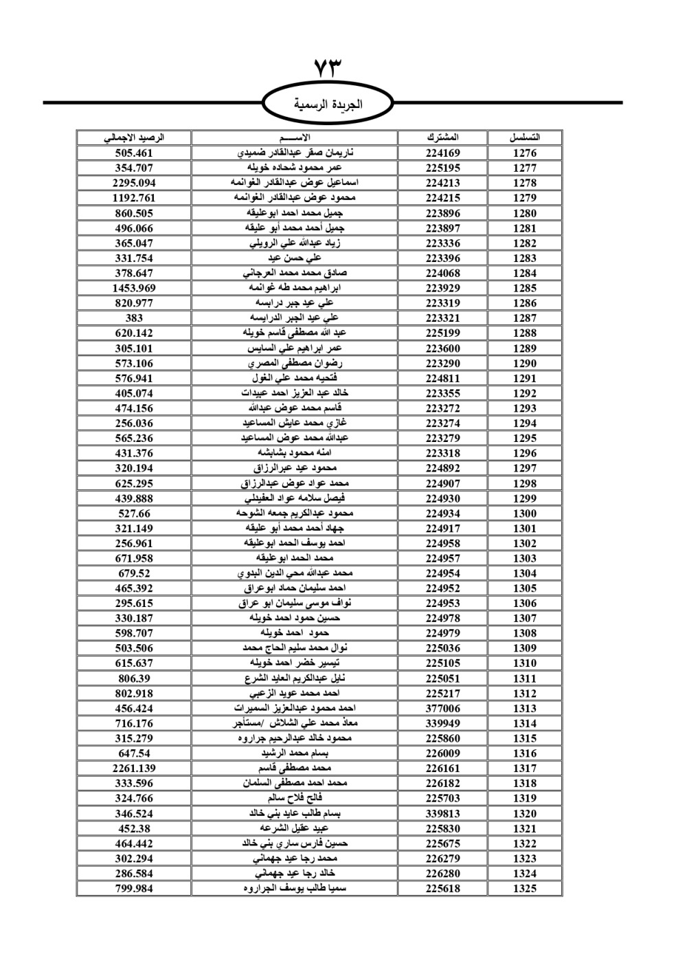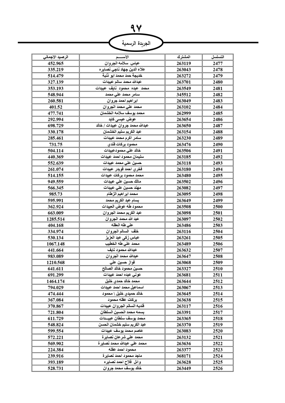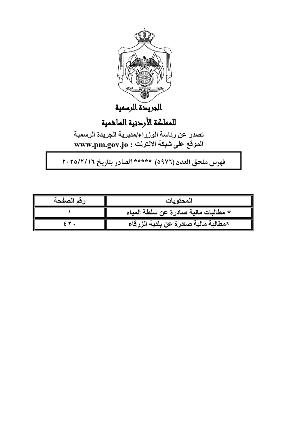دعت سلطة المياه وبلدية الزرقاء، عشرات آلاف الأردنيين الواردة أسماؤهم بالكشوفات المرفقة، إلى ضرورة مراجعتها لتسوية أوضاعهم المالية كونه ترتب عليهم ذمم مالية، وذلك لتجنب الحجز على الأموال المنقولة وغير المنقولة بعد انقضاء 60 يوما من تاريخ النشر، علما أنه تم نشر هذه الأسماء في الجريدة الرسمية بتاريخ 16/2/2025.