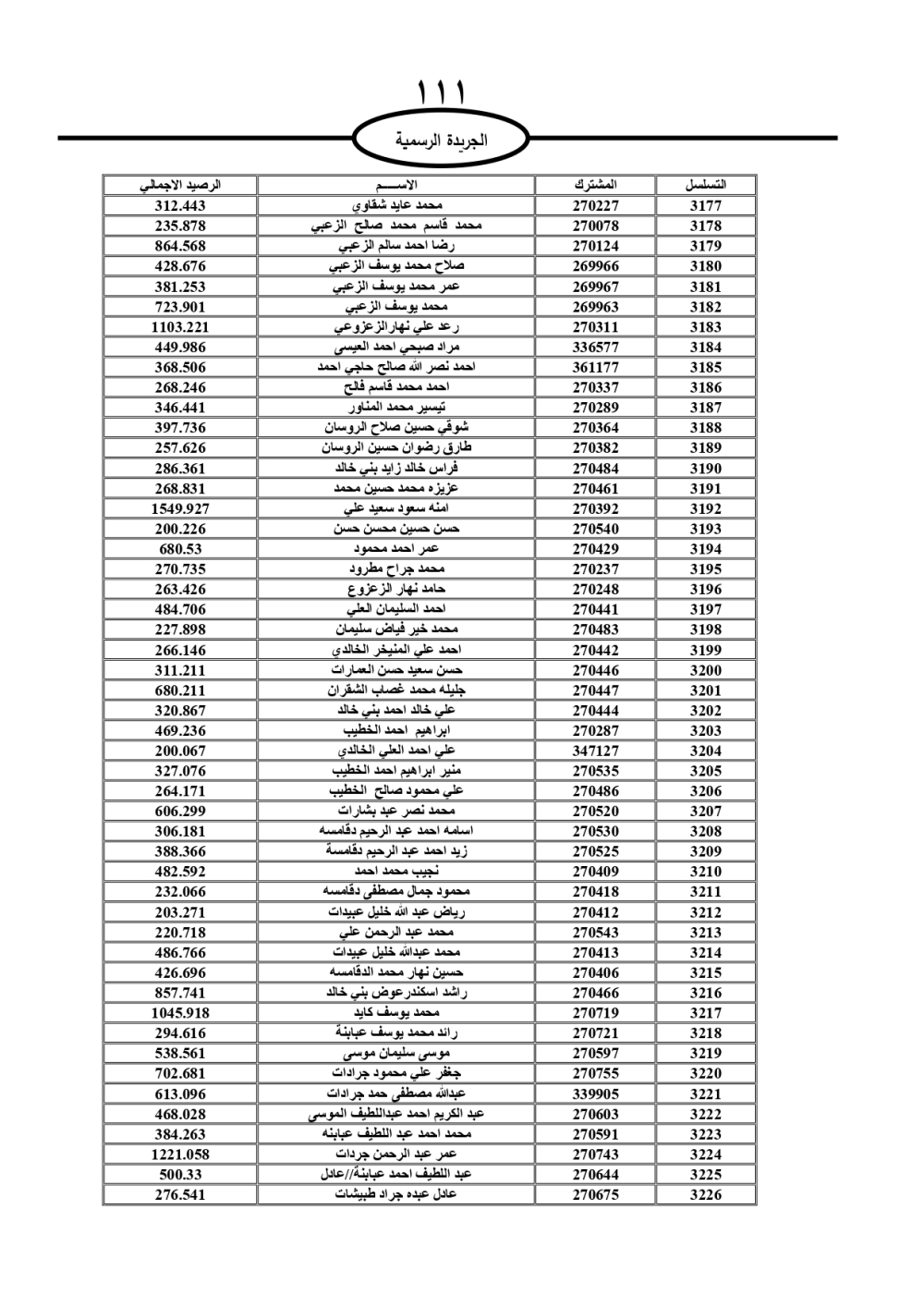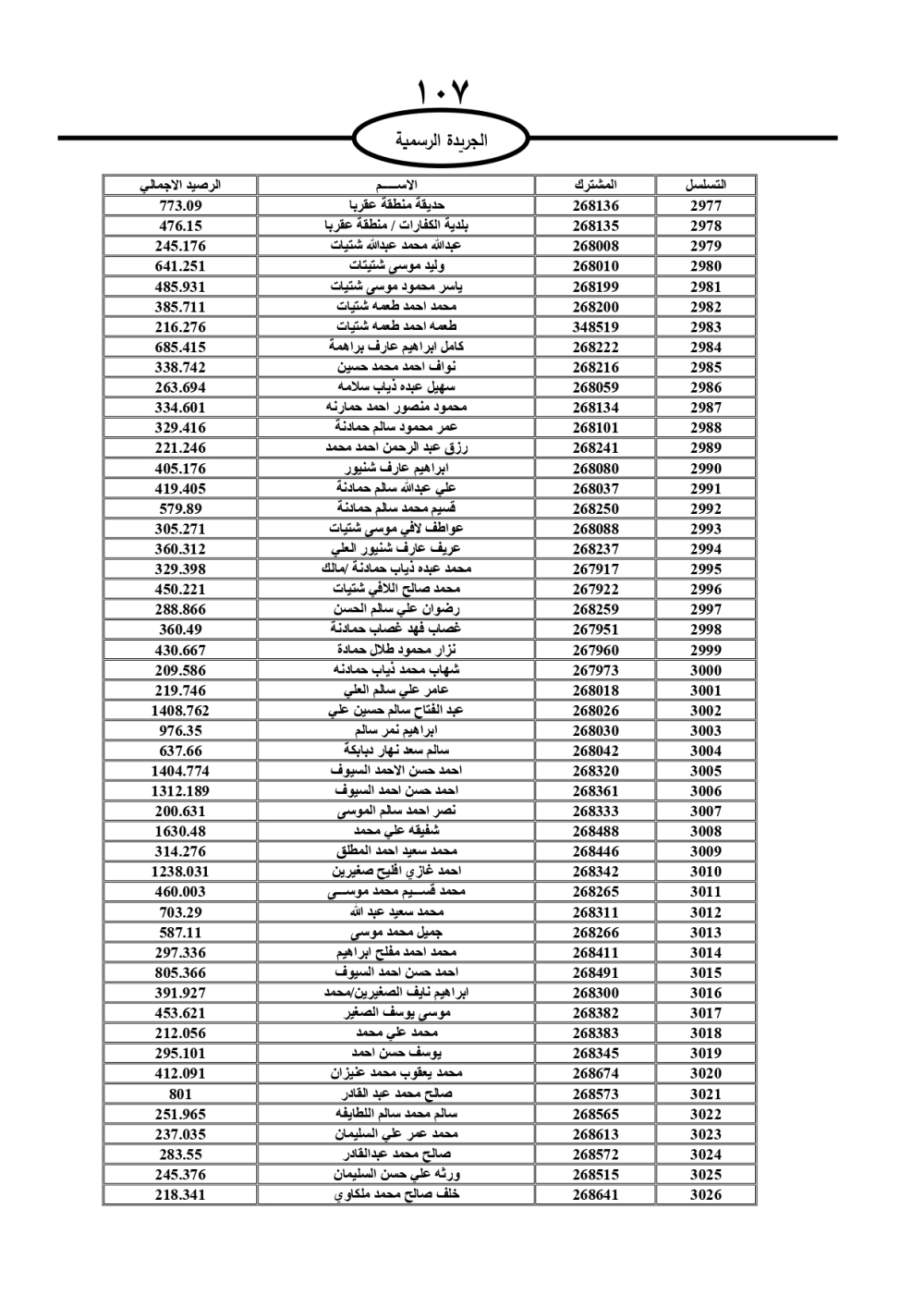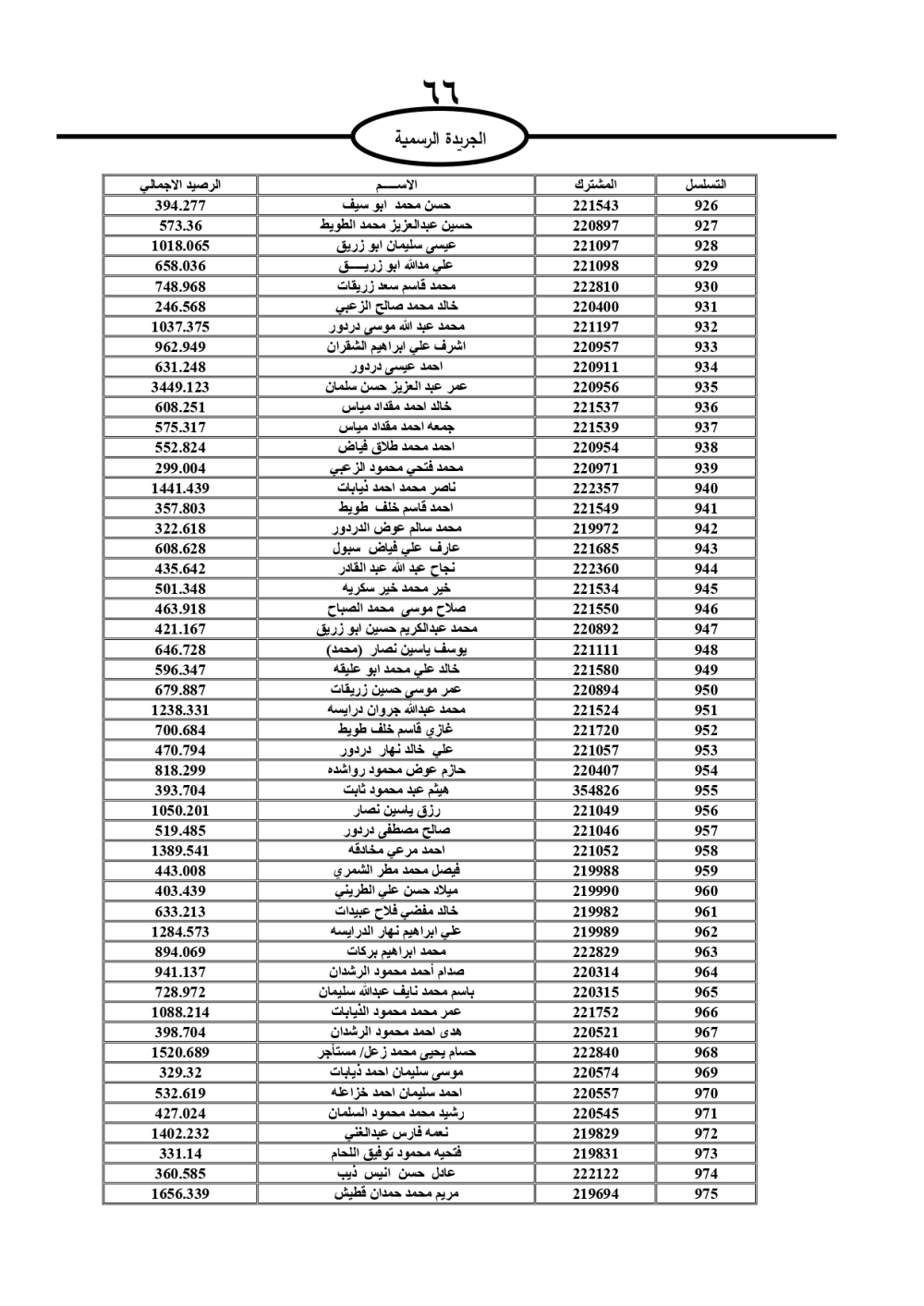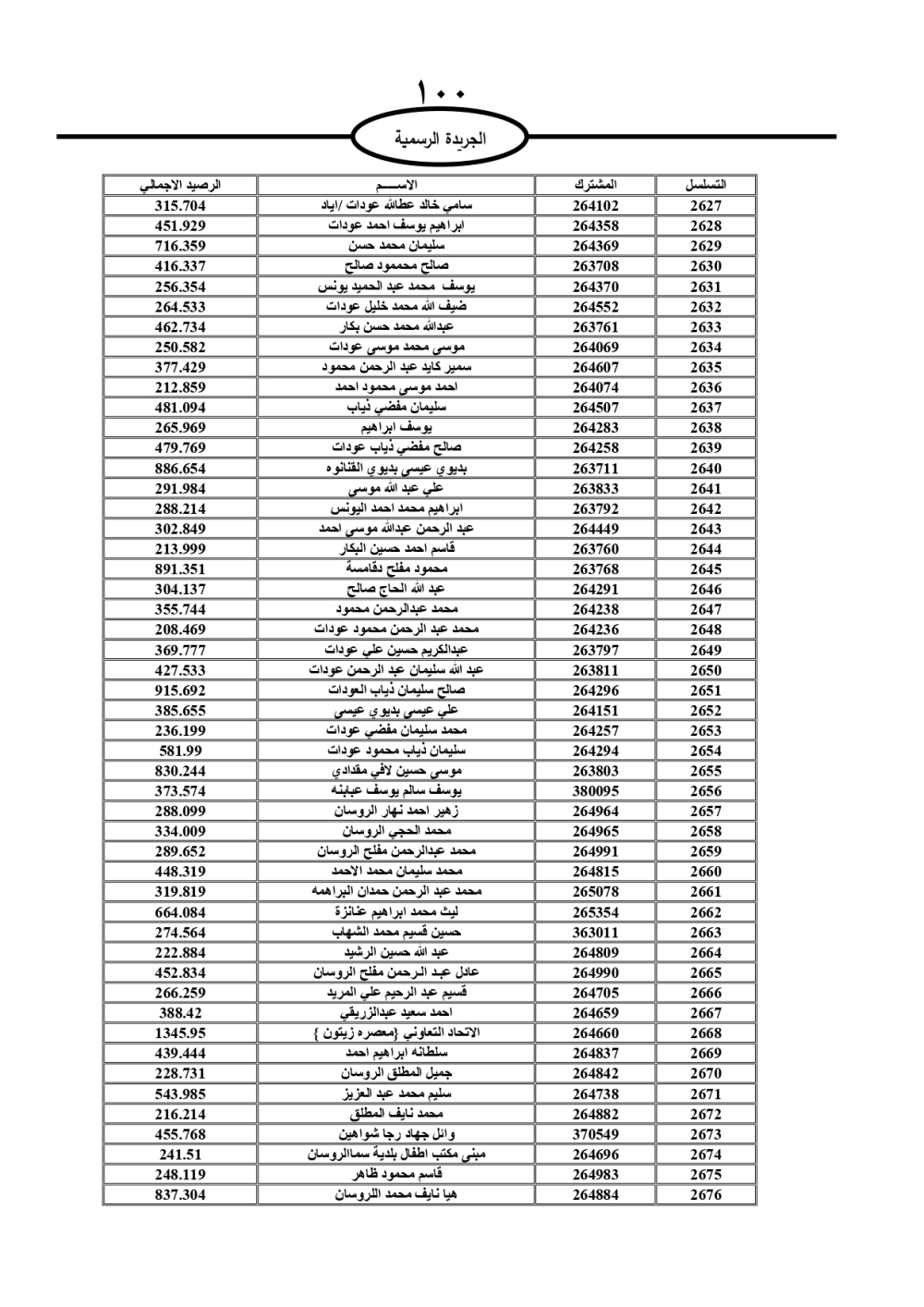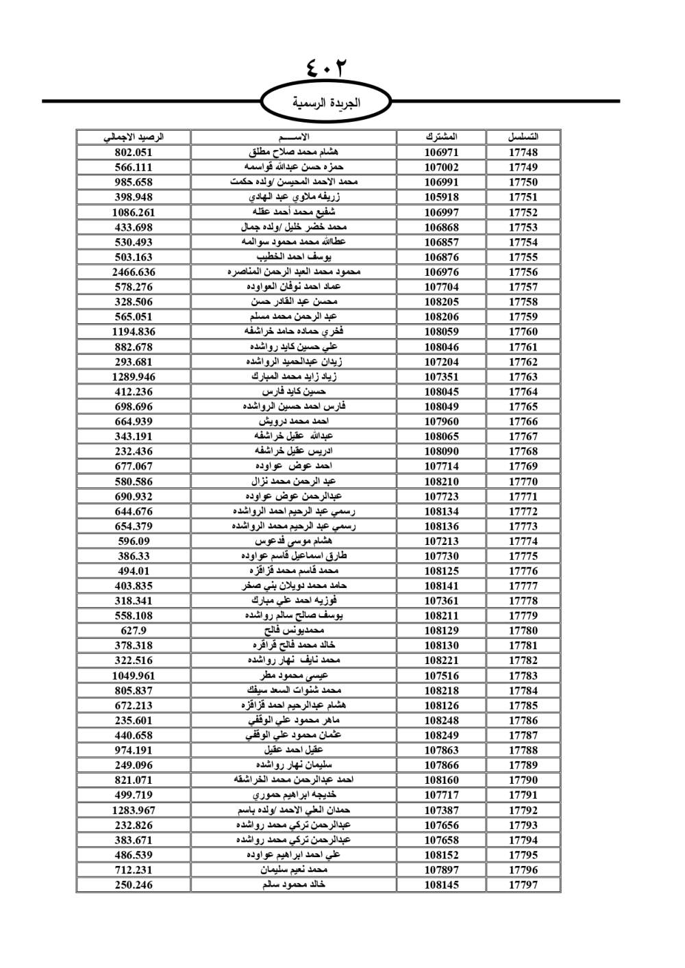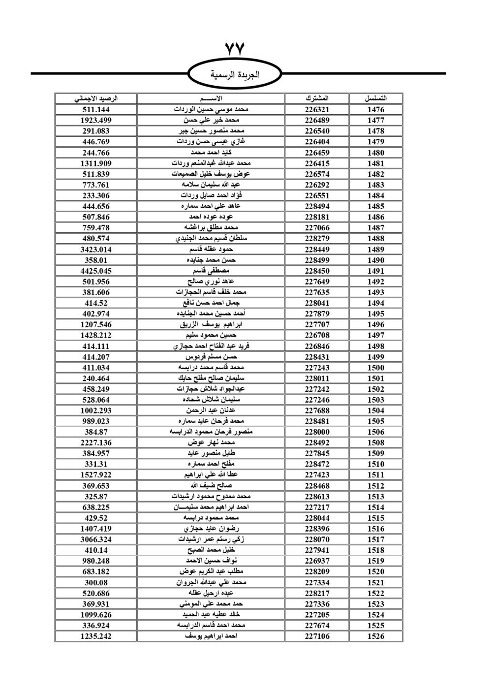 دعت سلطة المياه وبلدية الزرقاء، عشرات آلاف الأردنيين الواردة أسماؤهم بالكشوفات المرفقة، إلى ضرورة مراجعتها لتسوية أوضاعهم المالية كونه ترتب عليهم ذمم مالية، وذلك لتجنب الحجز على الأموال المنقولة وغير المنقولة بعد انقضاء 60 يوما من تاريخ النشر، علما أنه تم نشر هذه الأسماء في الجريدة الرسمية بتاريخ 16/2/2025.