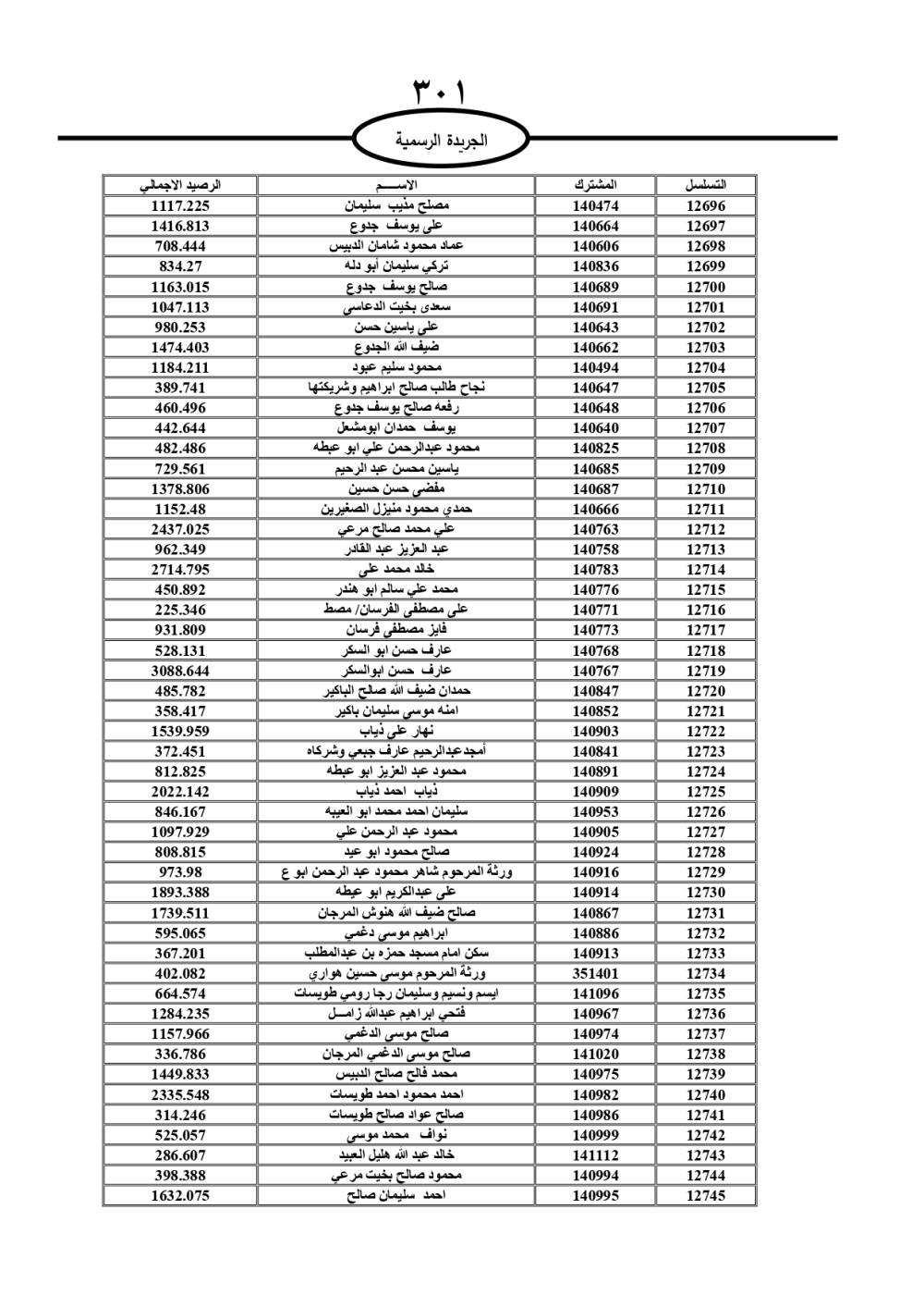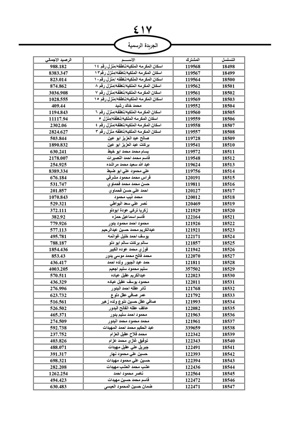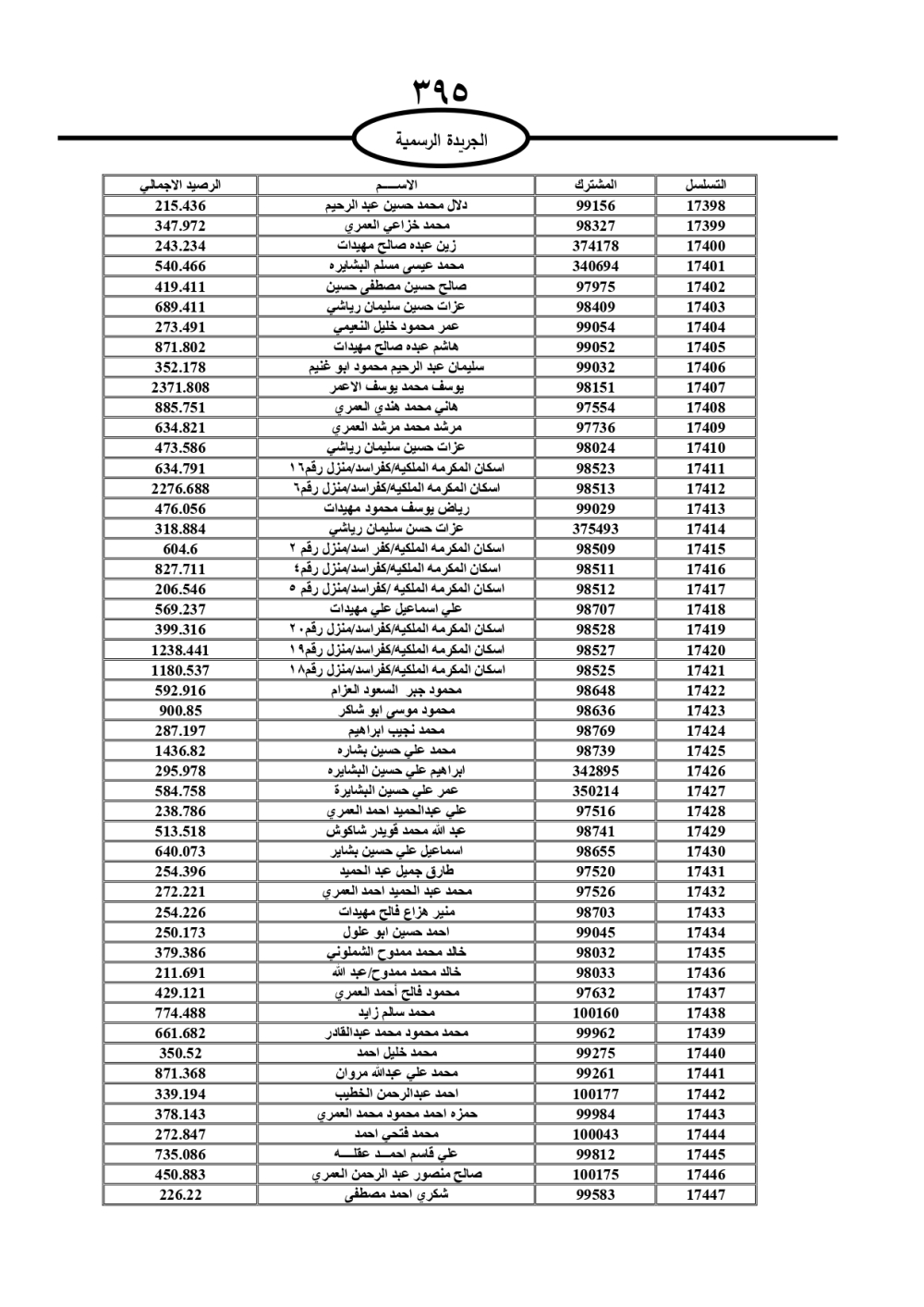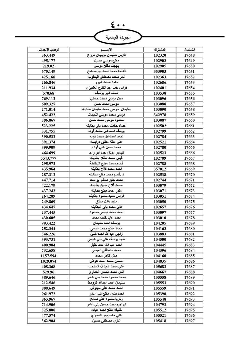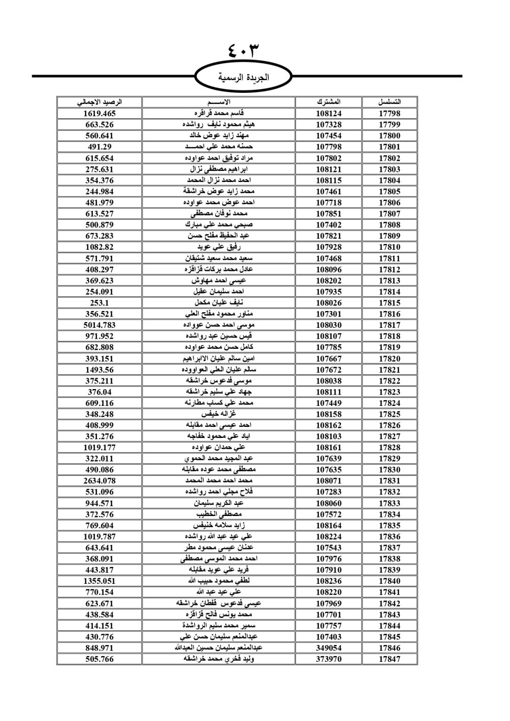 دعت سلطة المياه وبلدية الزرقاء، عشرات آلاف الأردنيين الواردة أسماؤهم بالكشوفات المرفقة، إلى ضرورة مراجعتها لتسوية أوضاعهم المالية كونه ترتب عليهم ذمم مالية، وذلك لتجنب الحجز على الأموال المنقولة وغير المنقولة بعد انقضاء 60 يوما من تاريخ النشر، علما أنه تم نشر هذه الأسماء في الجريدة الرسمية بتاريخ 16/2/2025.