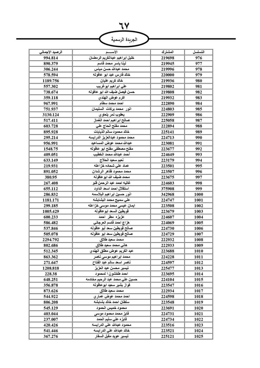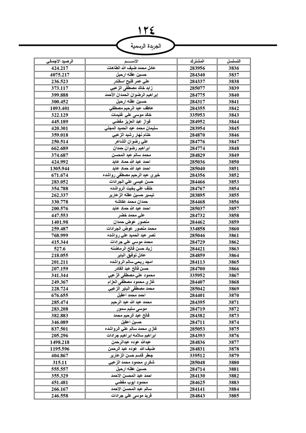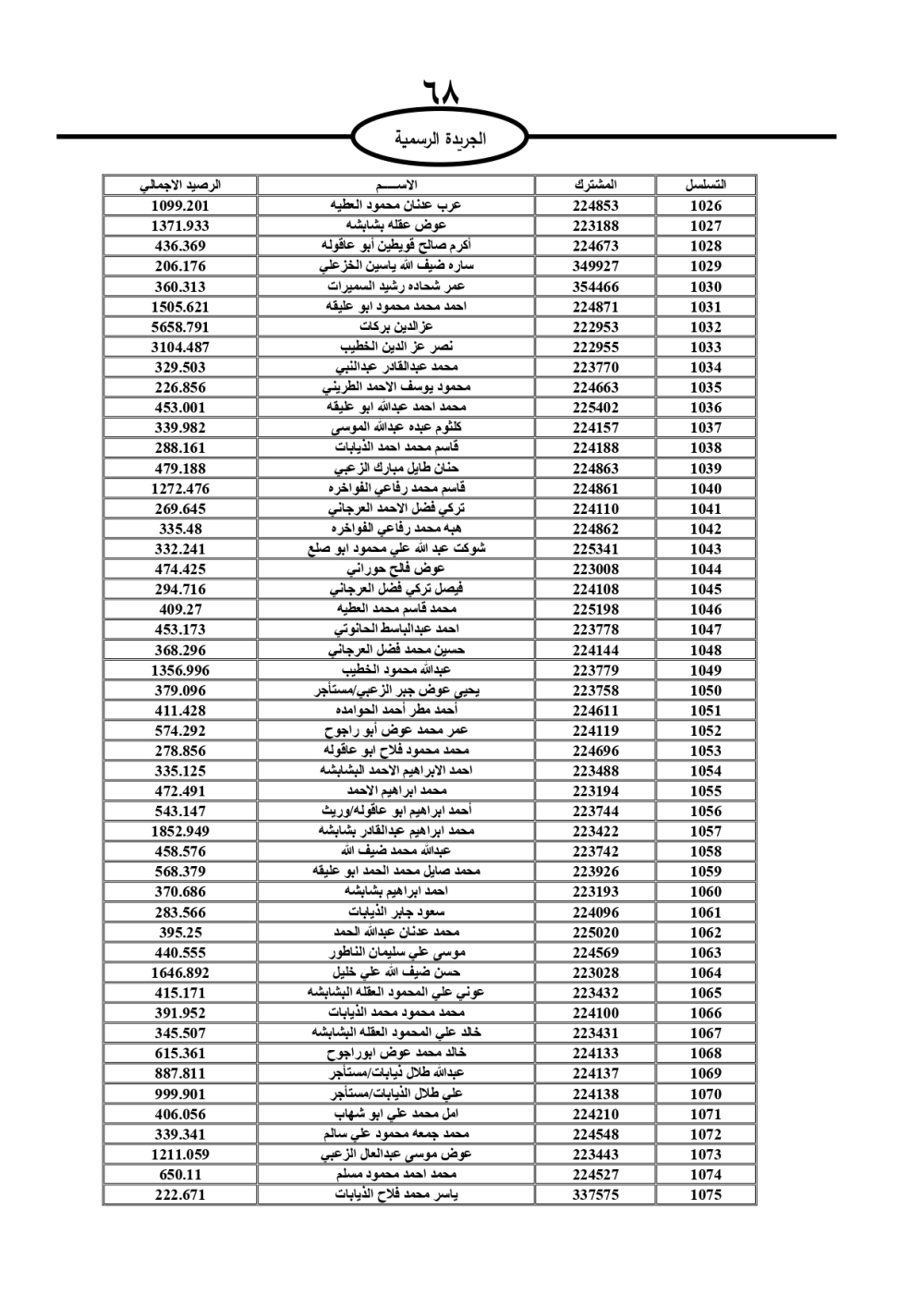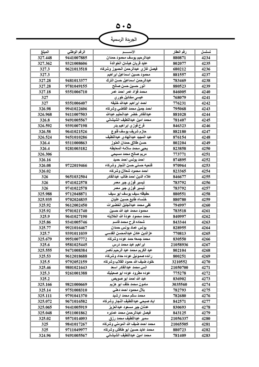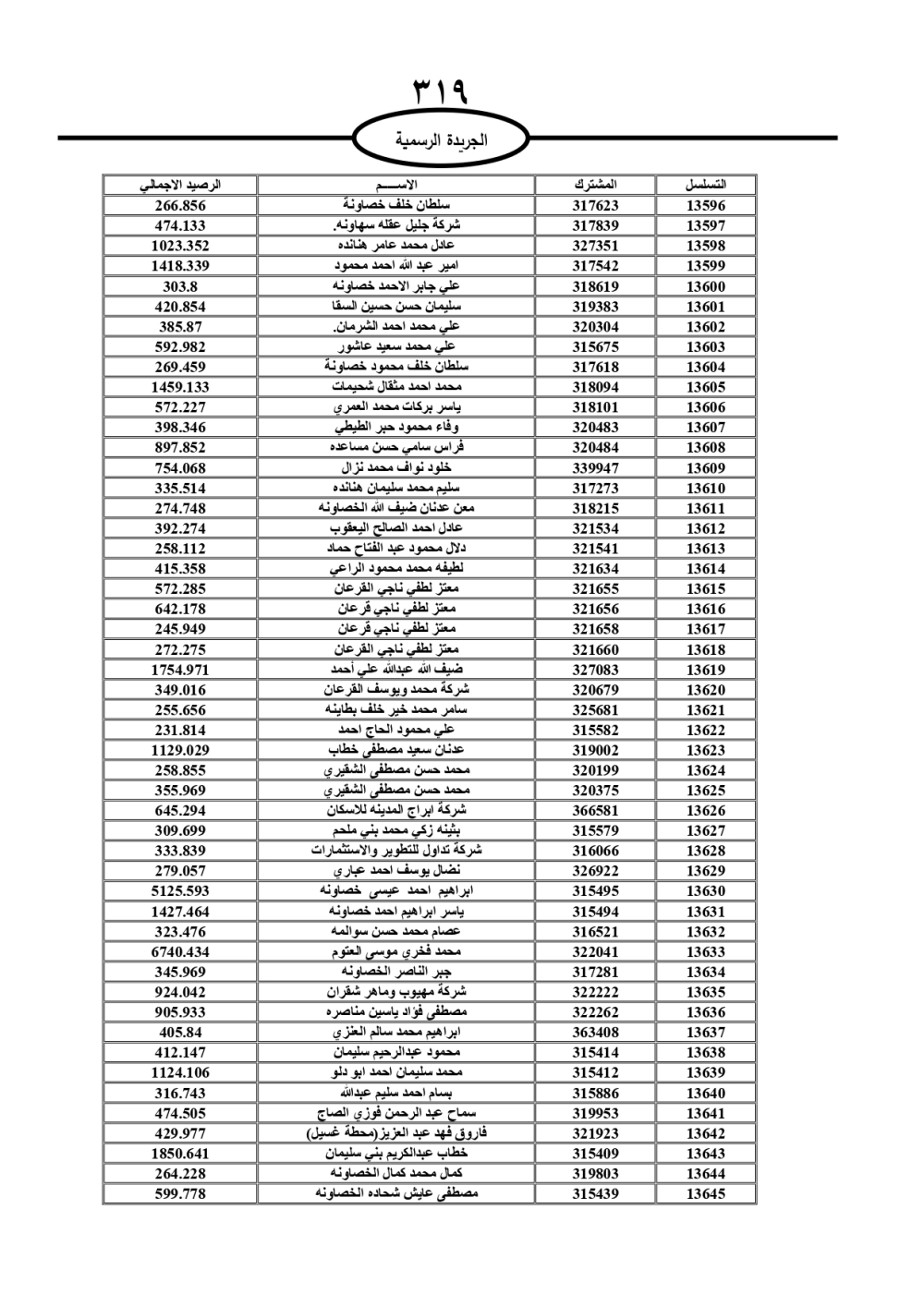 دعت سلطة المياه وبلدية الزرقاء، عشرات آلاف الأردنيين الواردة أسماؤهم بالكشوفات المرفقة، إلى ضرورة مراجعتها لتسوية أوضاعهم المالية كونه ترتب عليهم ذمم مالية، وذلك لتجنب الحجز على الأموال المنقولة وغير المنقولة بعد انقضاء 60 يوما من تاريخ النشر، علما أنه تم نشر هذه الأسماء في الجريدة الرسمية بتاريخ 16/2/2025.